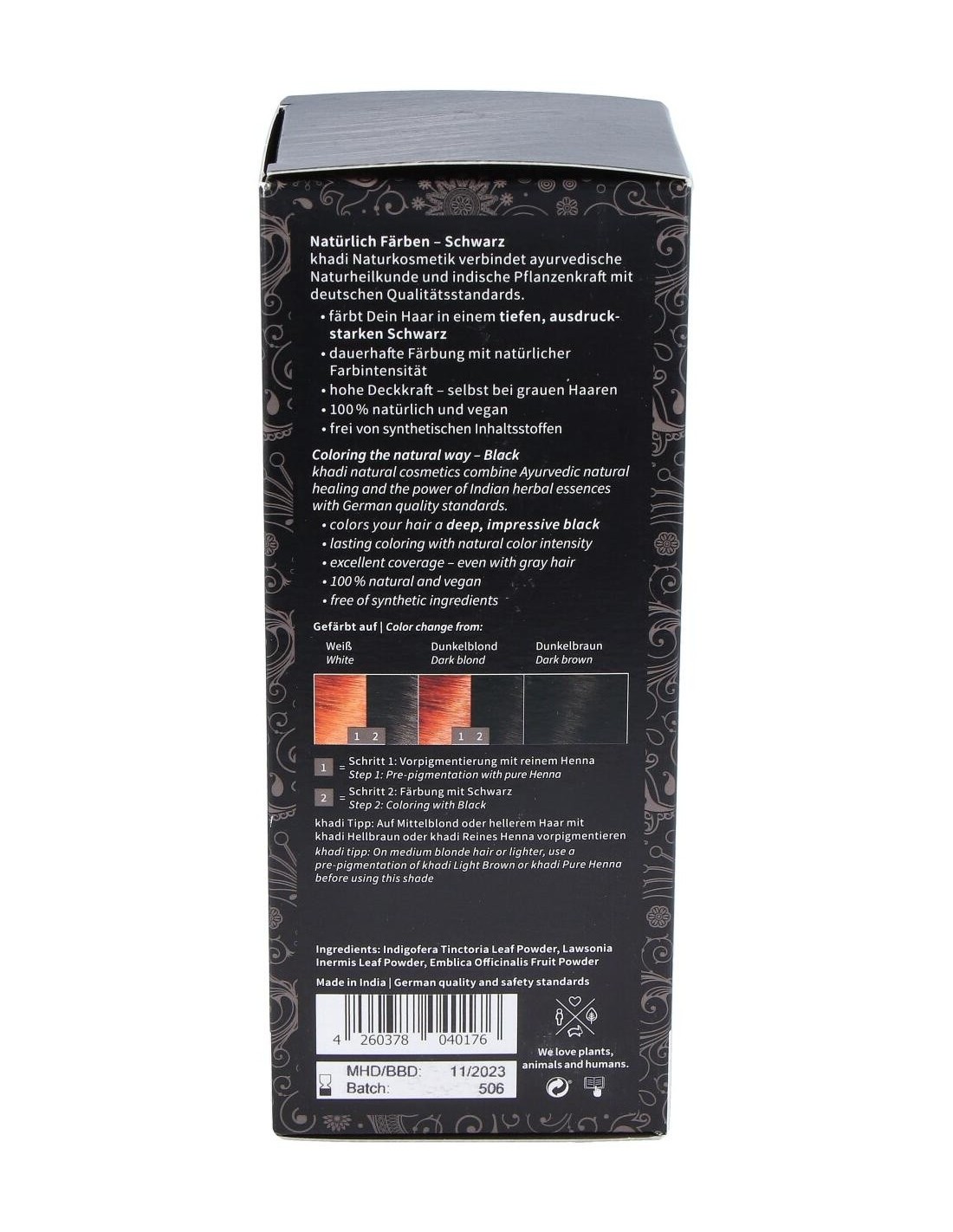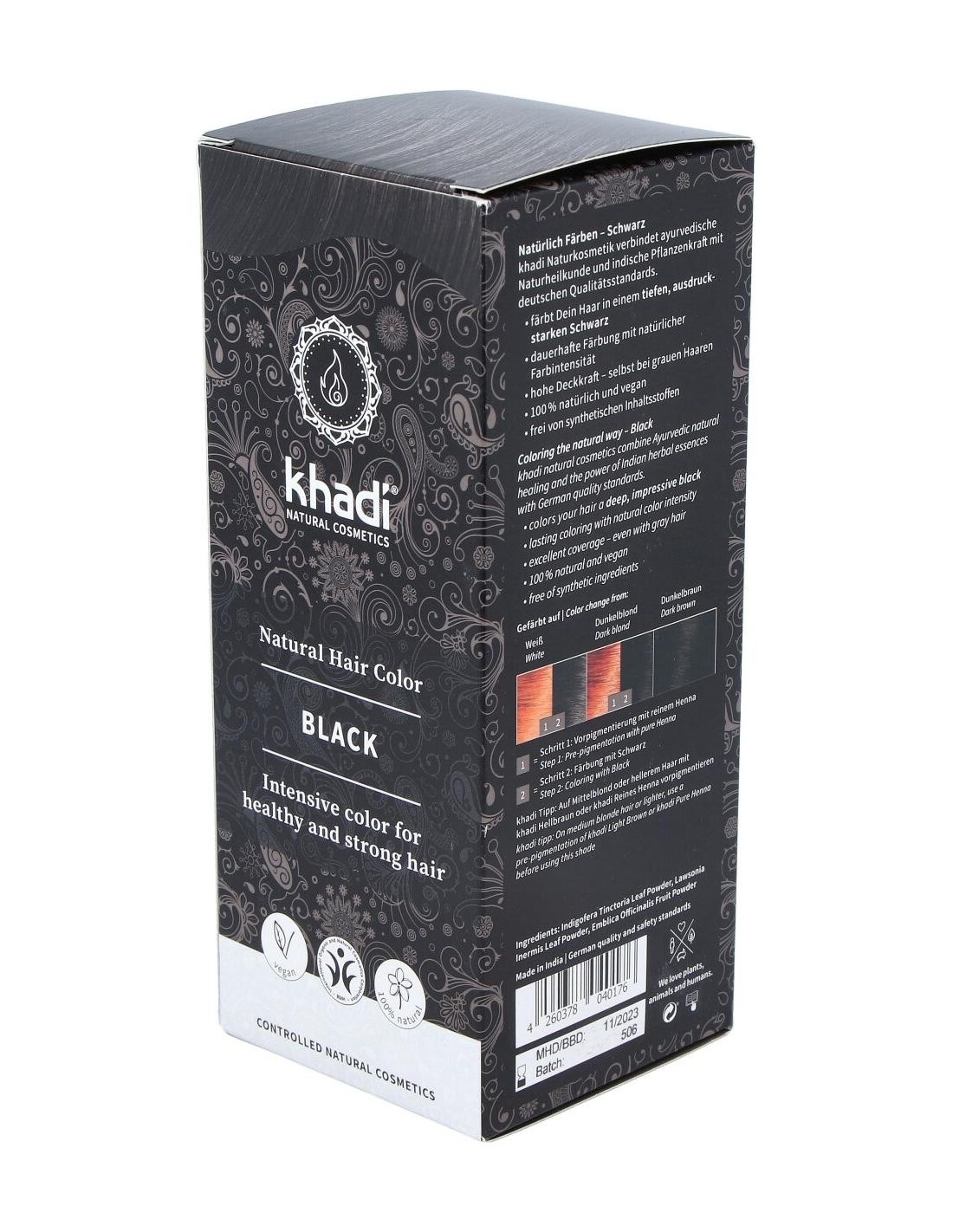 Tinte ayurveda ecológico con Henna e índigo que proporciona al cabello un tono negro intenso natural. Formulación ayurveda de larga permanencia para un pelo con brillo, volumen y suavidad. Sin amoníaco, agua oxigenada, resorcinol ni colorantes artificiales. Sin PPD, parabenos ni perfumes sintéticos. 100% vegetal. Apto para veganos.