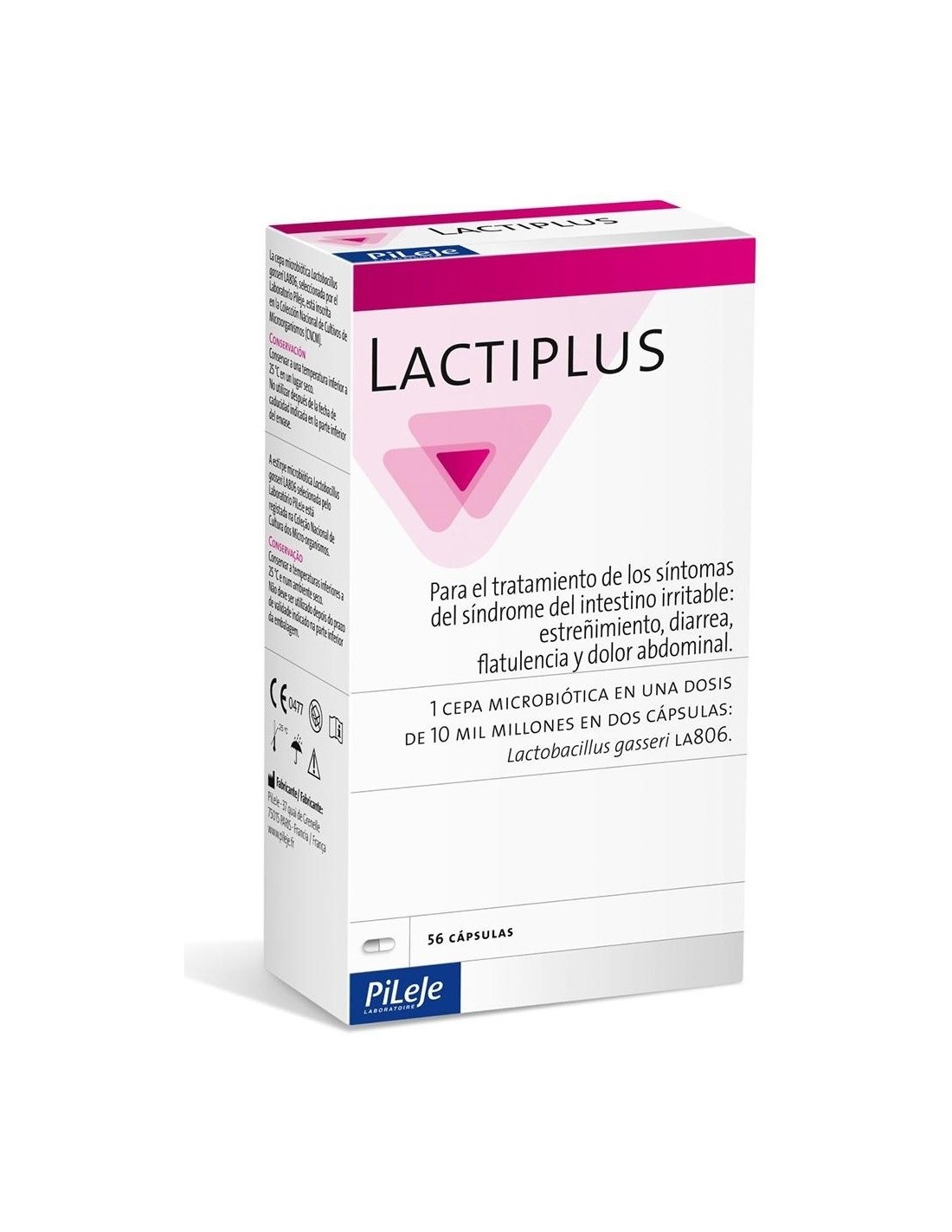 Complemento alimenticio elaborado a base de cepa microbiótica Lactobacillus gasseri LA806, seleccionada por el Laboratorio Pileje, está inscrita en la Colección Nacional de Cultivos de Microorganismos (CNCM). Esto resulta en tratamiento de los síntomas del síndrome del intestino irritable: estreñimiento, diarrea, ?atulencia y, en concreto, dolor abdominal. Lactiplus cumple con la normativa de productos sanitarios. Es necesario un diagnóstico previo de colon irritable antes de usar este producto.