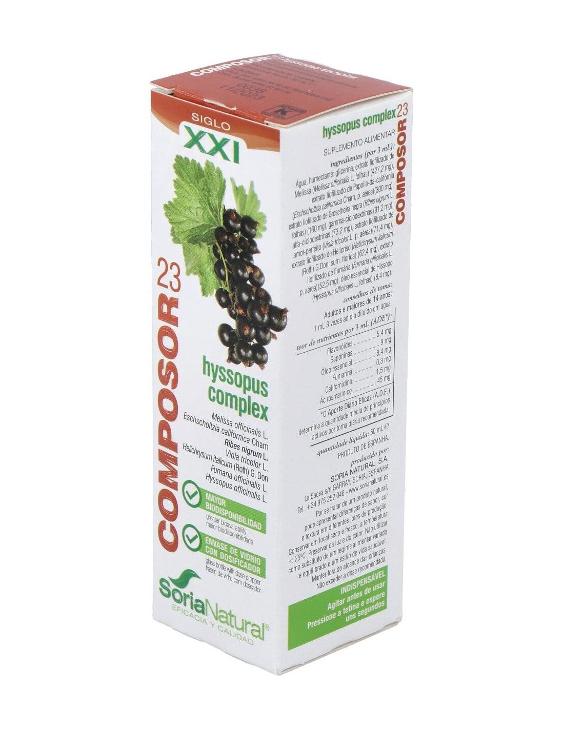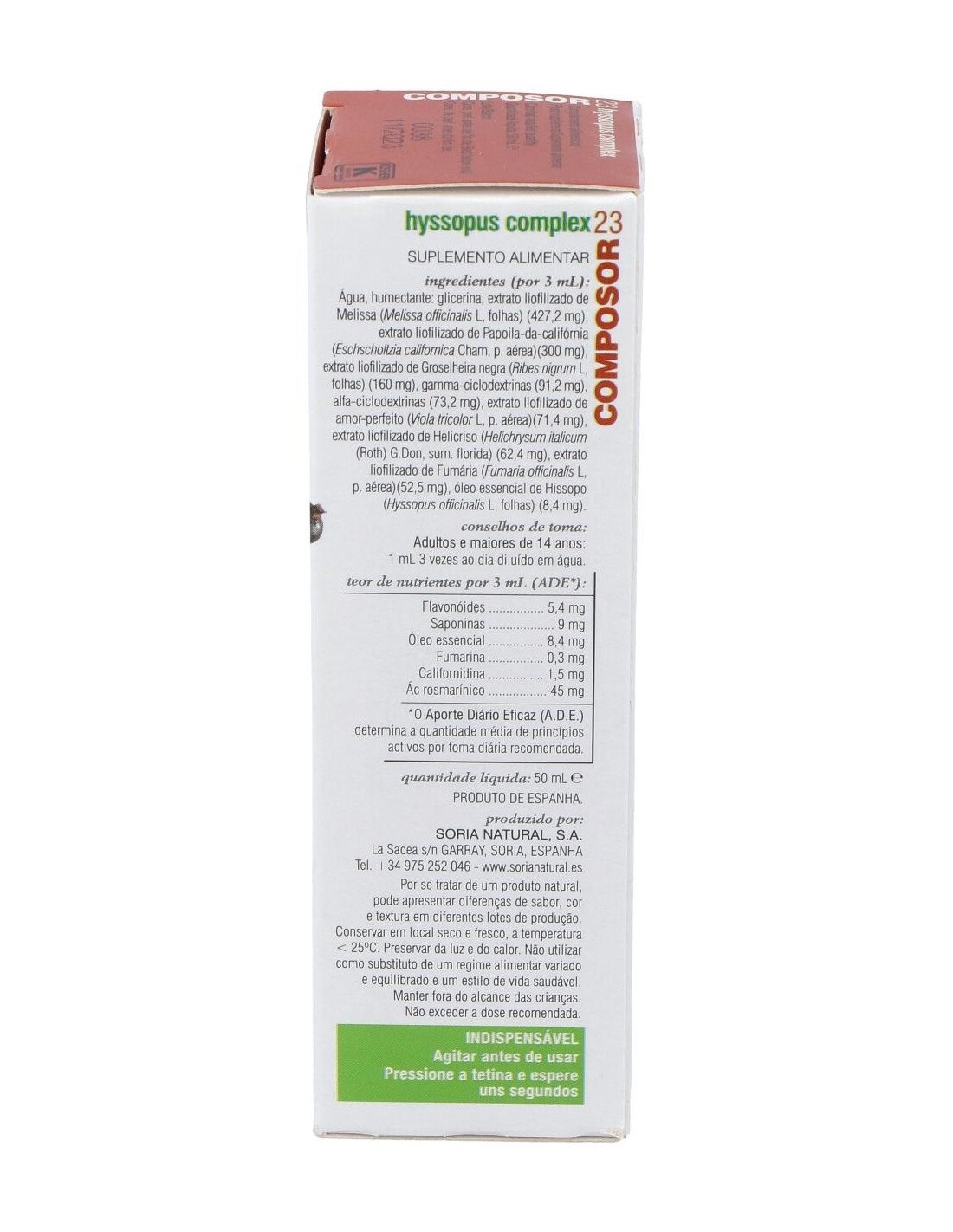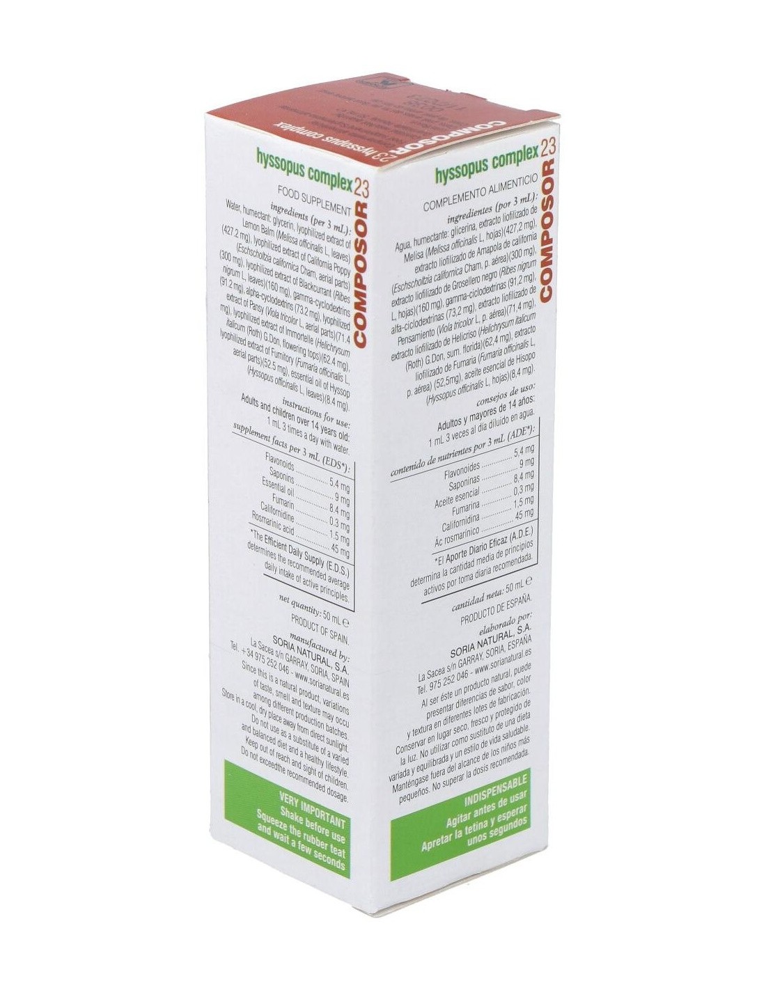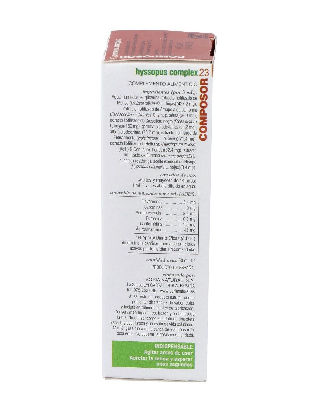 Agua, humectante: glicerina, extracto liofilizado de Melisa (Melissa officinalis L., hojas) (427,2 mg), extracto liofilizado de amapola de california (Eschscholzia californica Cham, p. aérea) (300 mg), extracto liofilizado de grosellero negro (Ribes nigrum L., hojas) (160 mg), gamma-ciclodextrinas (91,2 mg), alfa-ciclodextrinas (73,2 mg), extracto liofilizado de pensamiento (Viola tricolor L., p. aérea) (71,4 mg), extracto liofilizado de helicriso (Helichrysum italicum (Roth) G. Don, sum. florida) (62,4 mg, extracto liofilizado de fumaria (Fumaria officinalis L., p. aérea)(52,5 mg), aceite esencial de hisopo (Hyssopus officinalis L., hojas) (8,4 mg).