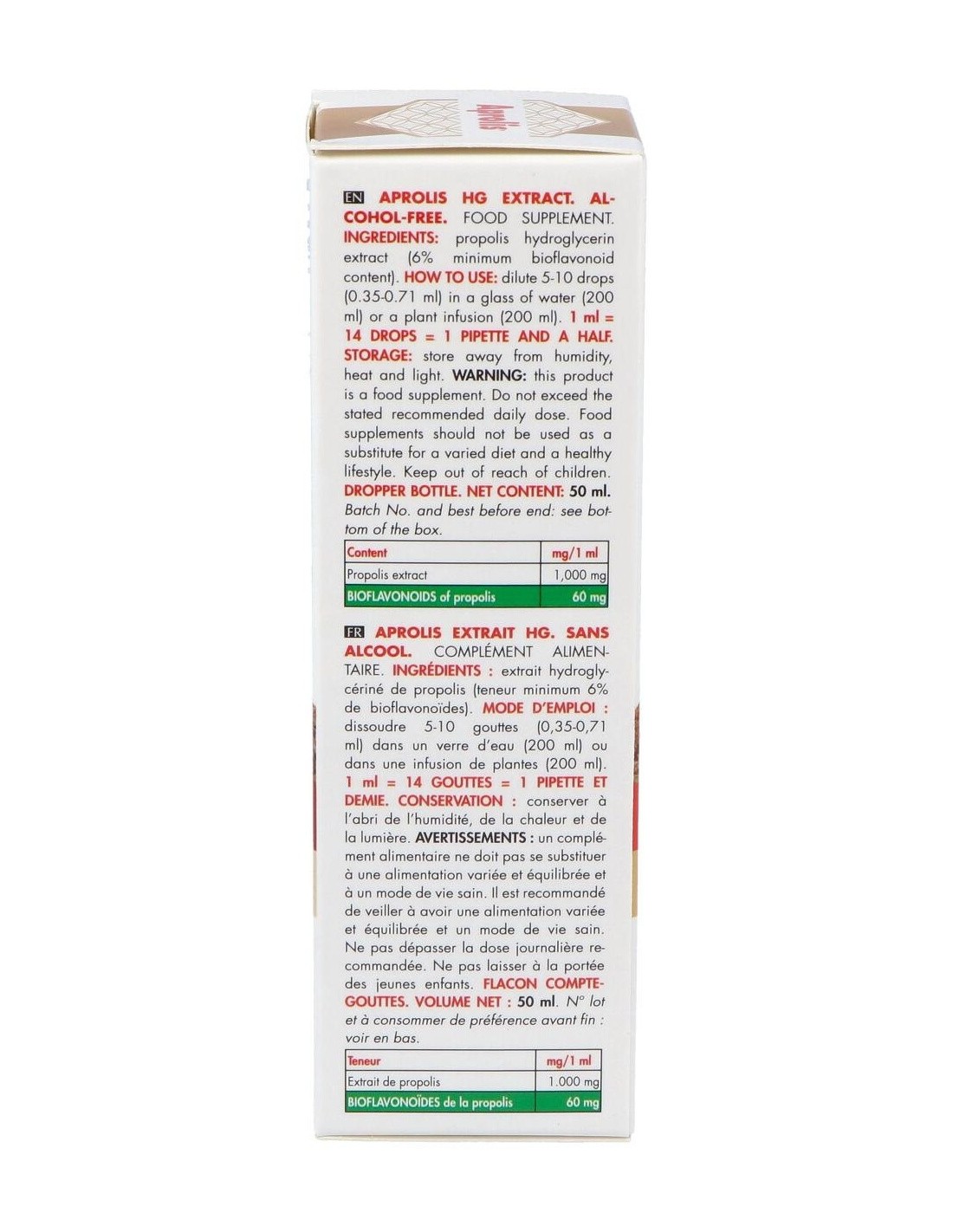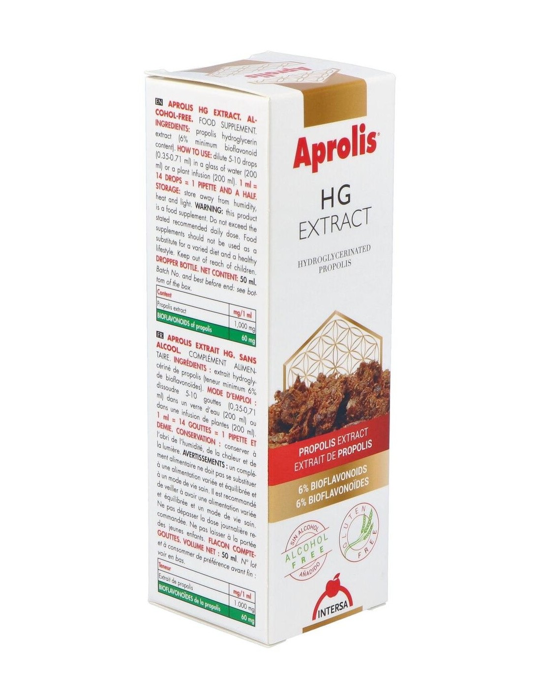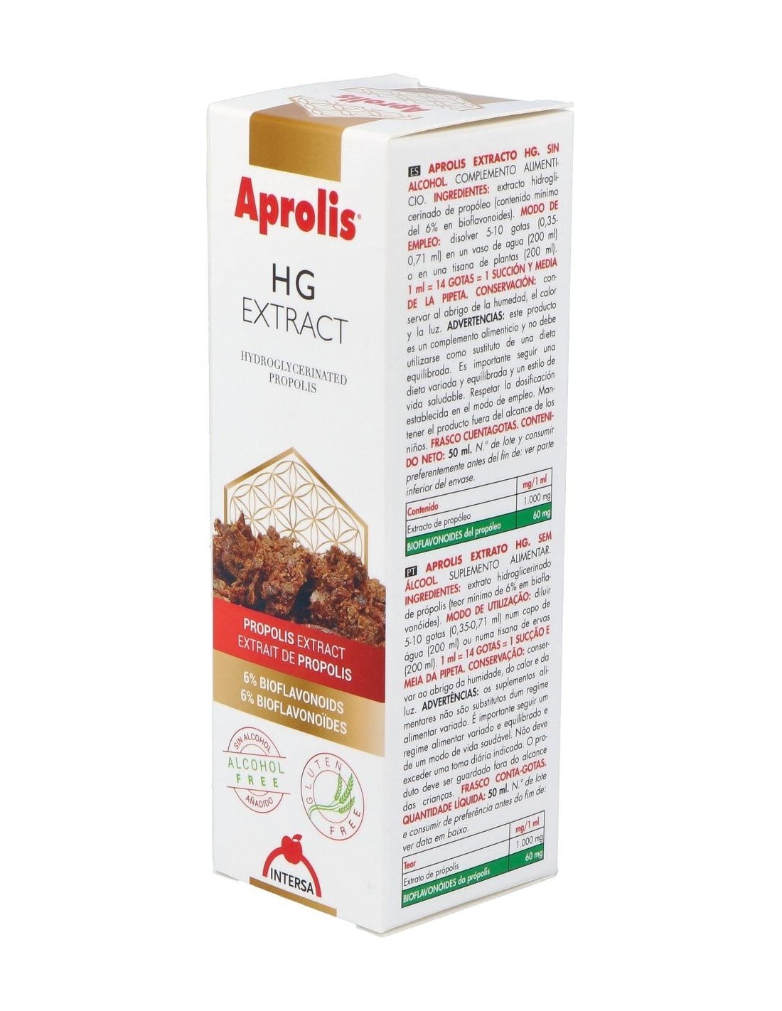 Es un complemento alimenticio a base de propóleo. Es un extracto fluido sin alcohol. El propóleo es un material similar a la resina fabricado por las abejas a partir de las yemas de los álamos y de los árboles conos. Con 6% bioflavonoides, ayuda a reforzar las defensas naturales del cuerpo. Con conocidas propiedades antibióticas , fungicida, bacteriana, cicatrizantes, antiinflamatorias, analgésicas, antialérgicas, epitelizantes y anestésicas. Apto consumo diario.
