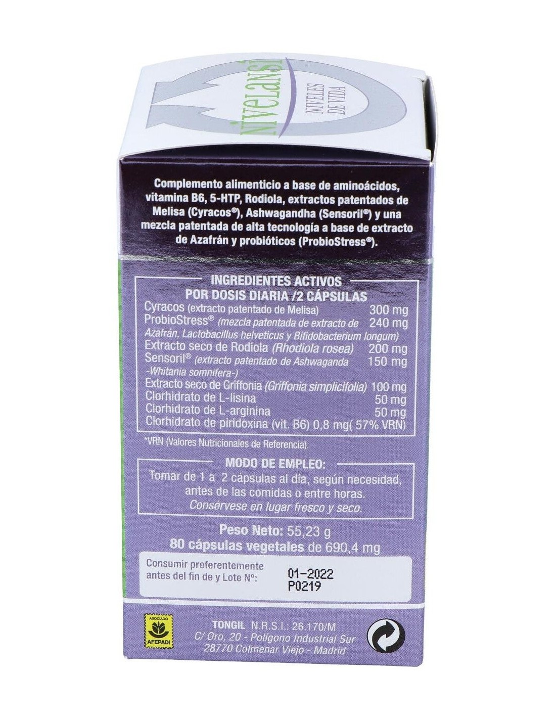 Cyracos (extracto seco de melisa- melissa officinalis L-estandarizado en ácido hidroxicinámico), ProbioStress (almidón de maíz, extracto seco de estigmas de azafrán-crocus sativus-lactobacillus helveticus y bifidobacterium longum) extracto seco de rodiola- rhodiola rosea- cápsula vegetal, Sensoril (extracto seco de ashwagandha- whitania somnifera- maltodextrina y antiaglomerante: dióxido de silicio), extracto seco de griffonia estandarizado en 5-HTTP, antiaglomerante (dióxido de silicio), clorhidrato de L-arginina, clorhidrato de L-lisina y clorhidrato de piridoxina.