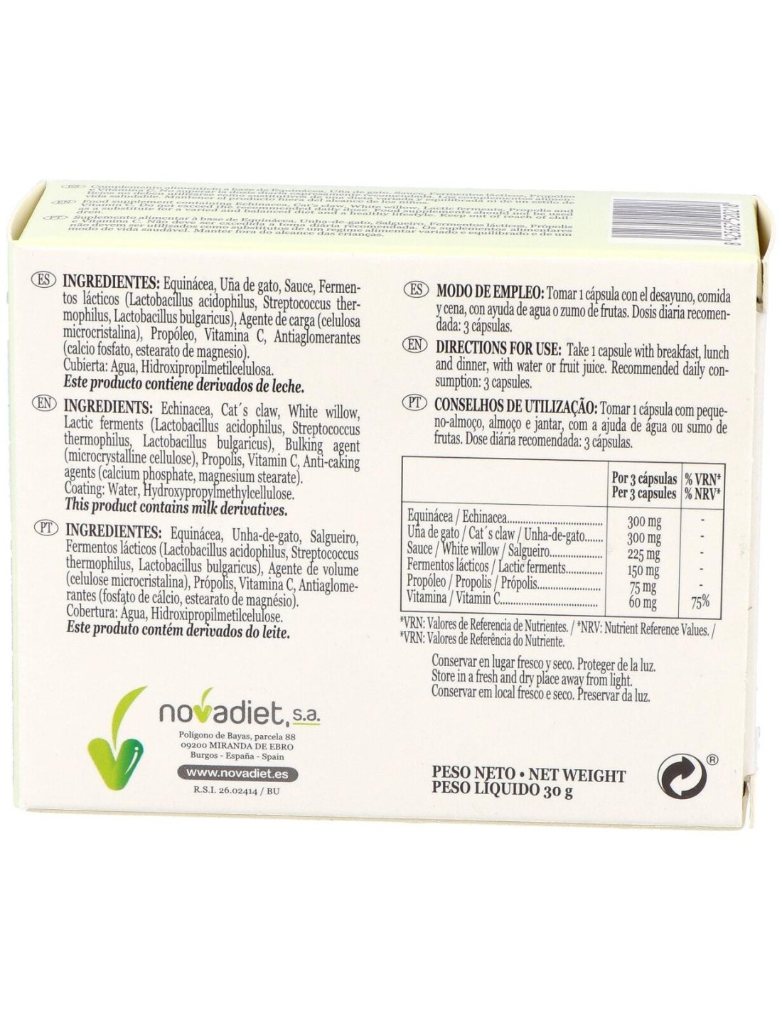 Equinácea (e.s., polifenoles totales, expresados como ácido cicórico, >4%), Uña de gato (e.s. estandarizado en alcaloides >3%), Sauce (e.s. estandarizado en salicilina >15%), Fermentos lácticos (Lactobacillus acidophillus, Streptococcus thermophilus, Lactobacillus bulgaricus. >100.000.000 UFC/g), Agente de carga (celulosa microcristalina), Propóleo (e.s. estandarizado en flavonoides totales expresados como galangina, 8-12%), Vitamina C, Antiaglomerantes (calcio fosfato, estearato de magnesio). Cubierta: Agua, Hidroxipropilmetilcelulosa.