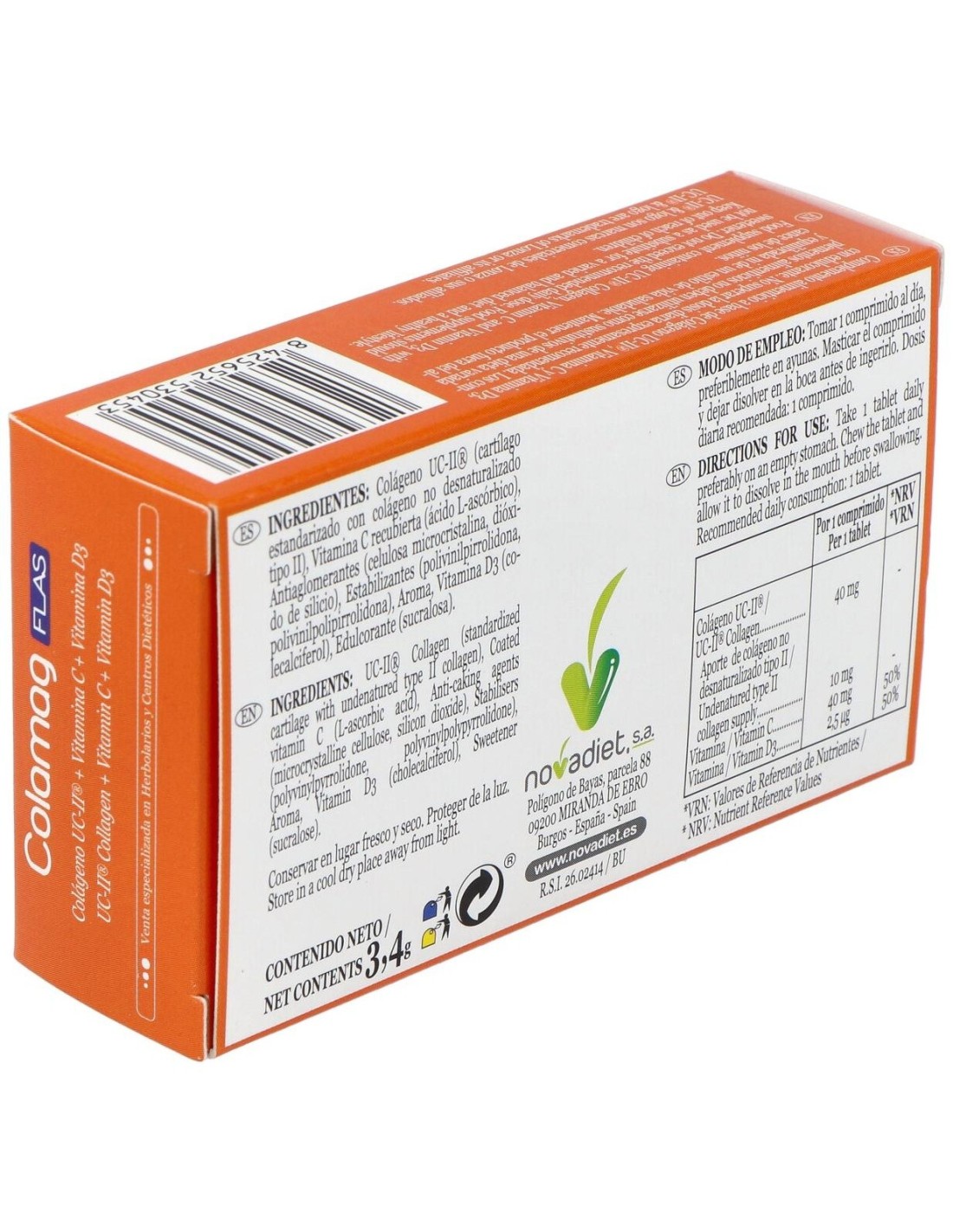 Colamag Flas Novadiet 30comp es un complemento alimenticio que ayuda a proteger las articulaciones y contribuye a regenerar el cartílago articular. Contiene colágeno UC-II®, que ayuda a regenerar el cartílago articular dañado y contribuye a la formación de huesos, tendones y ligamentos. La vitamina D3, por su parte, contribuye a la absorción y utilización normal del calcio y el fósforo, mientras que la vitamina C fomenta la formación normal del colágeno y protege a las células del daño oxidativo.