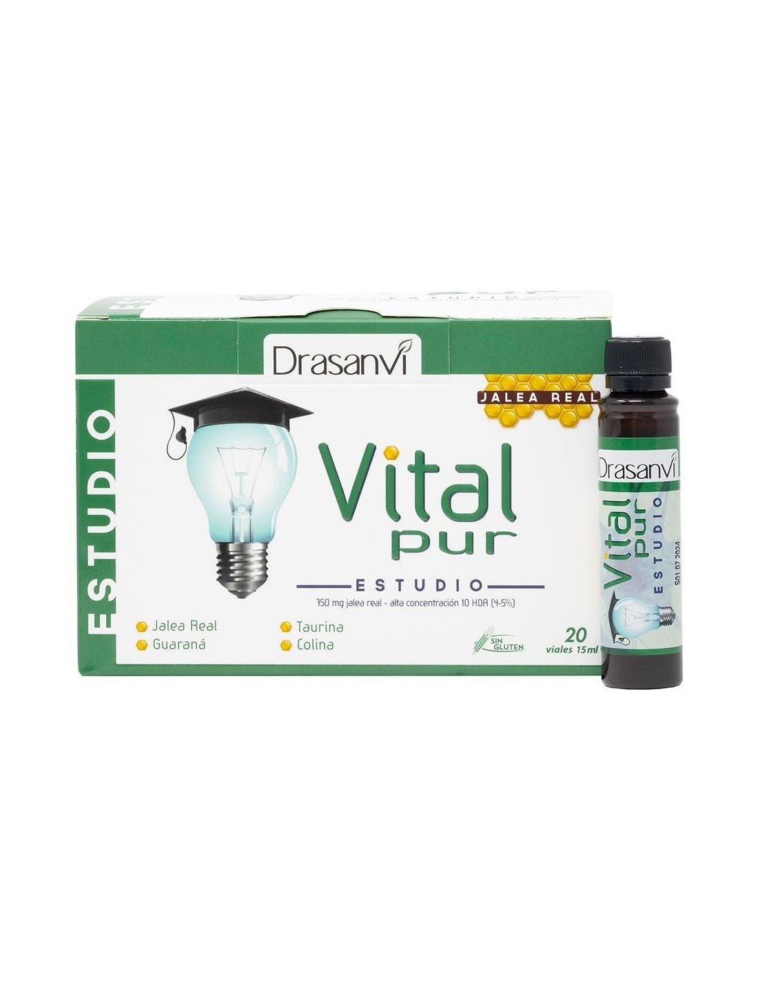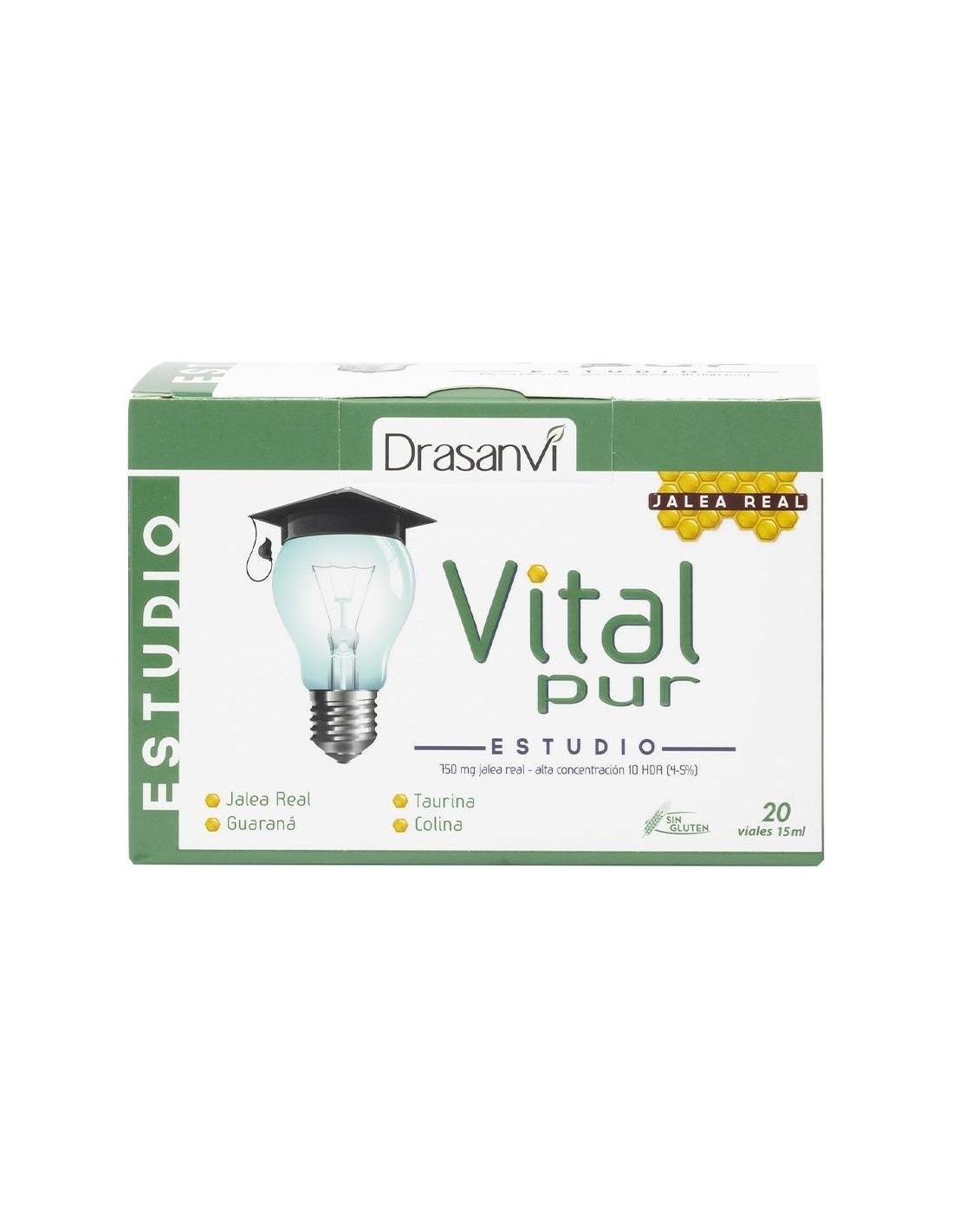 Complemento alimenticio que ayuda a disminuir el cansancio y la fatiga. Utiliza la Jalea real (750 mg) como base del producto. La Jalea real, es una sustancia elaborada por la abejas para alimentar a la abeja reina. Se trata de una sustancia rica en vitaminas, minerales y aminoácidos. Vitalpur Estudio se refuerza con Hierro, Magnesio, Colina, Lecitina y Taurina: además de los extractos vegetales de Ginkgo Biloba y el Guaraná.