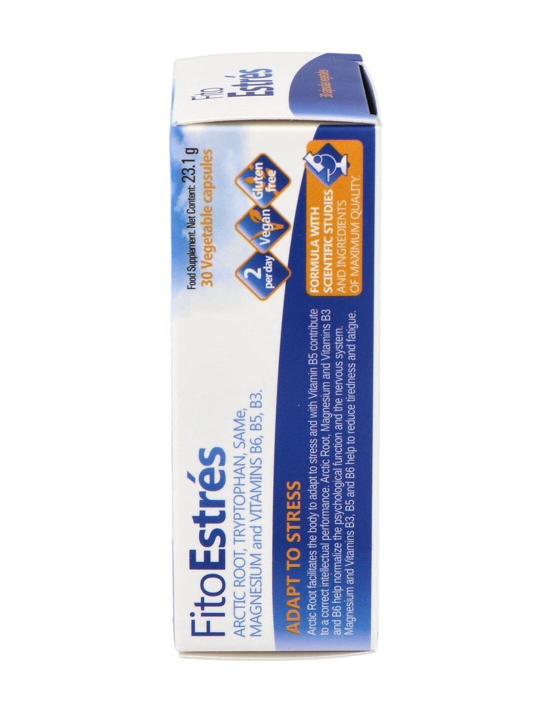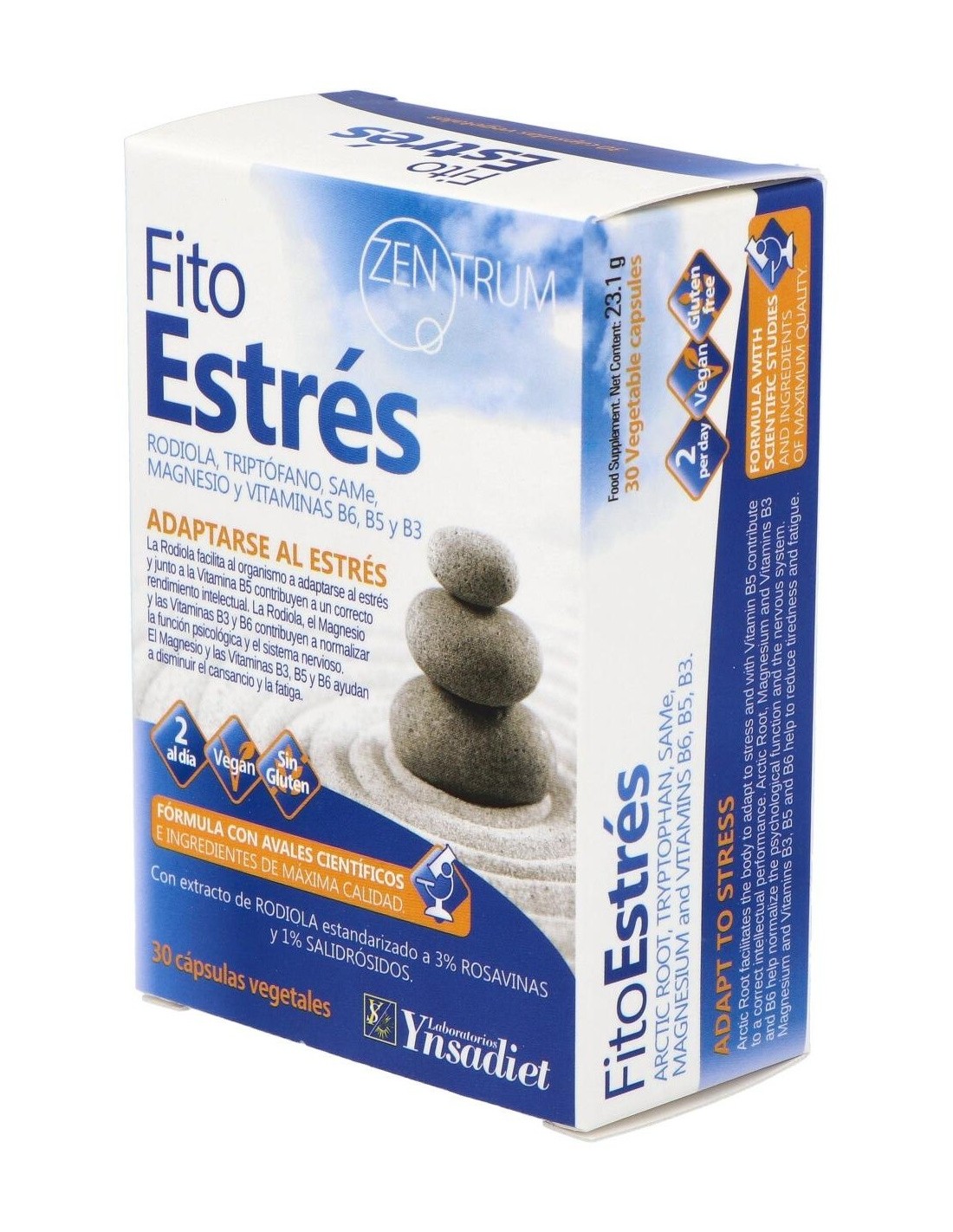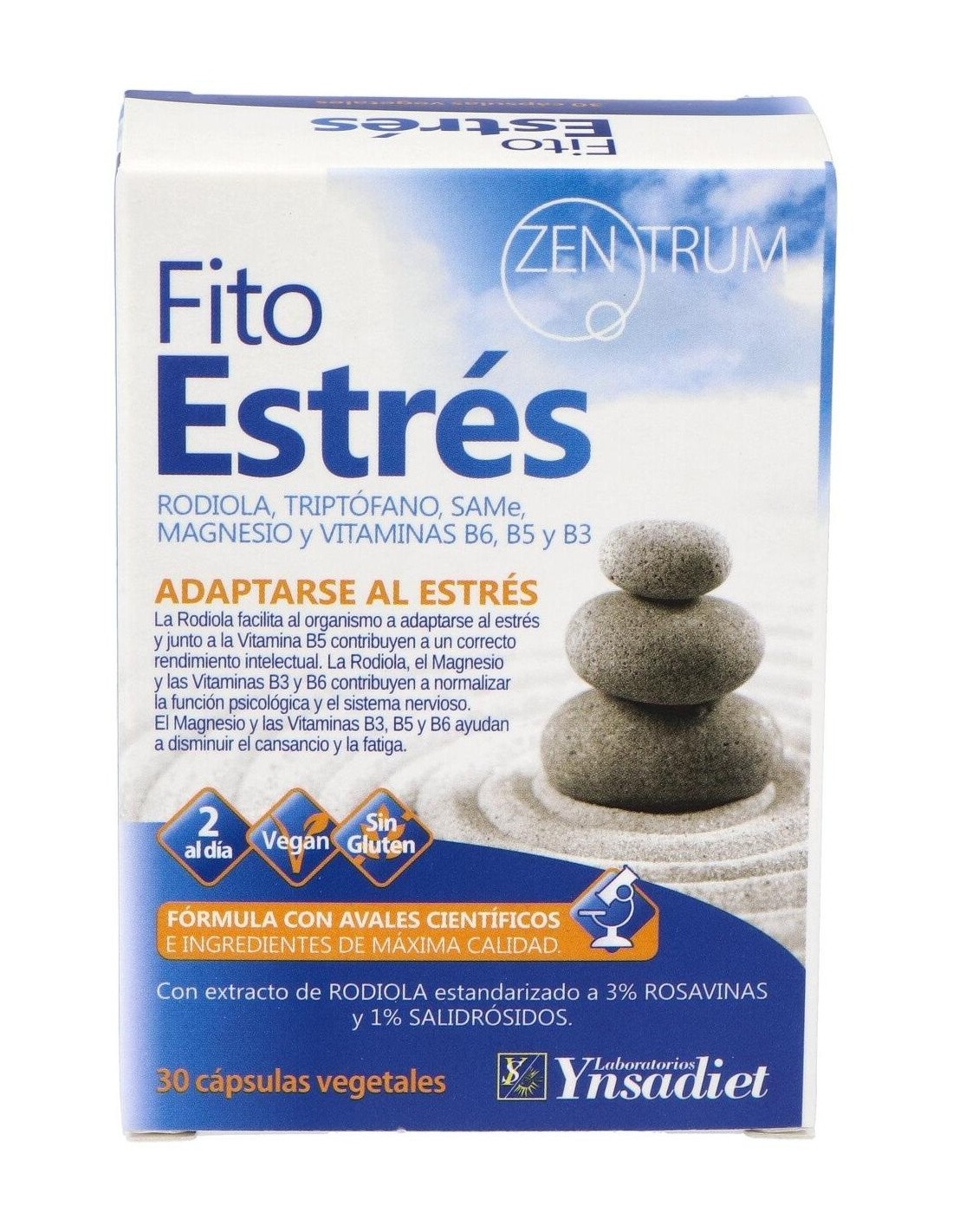 Complemento alimenticio elaborado a base de Rodiola, Triptófano, SAMe, Magnesio y Vitaminas que ayuda a adaptarse al estrés porque su consumo ayuda a un aumento significativo de serotonina (Hormona antiestrés) y un descenso de los niveles de cortisol (hormona del estrés). Apto para veganos.