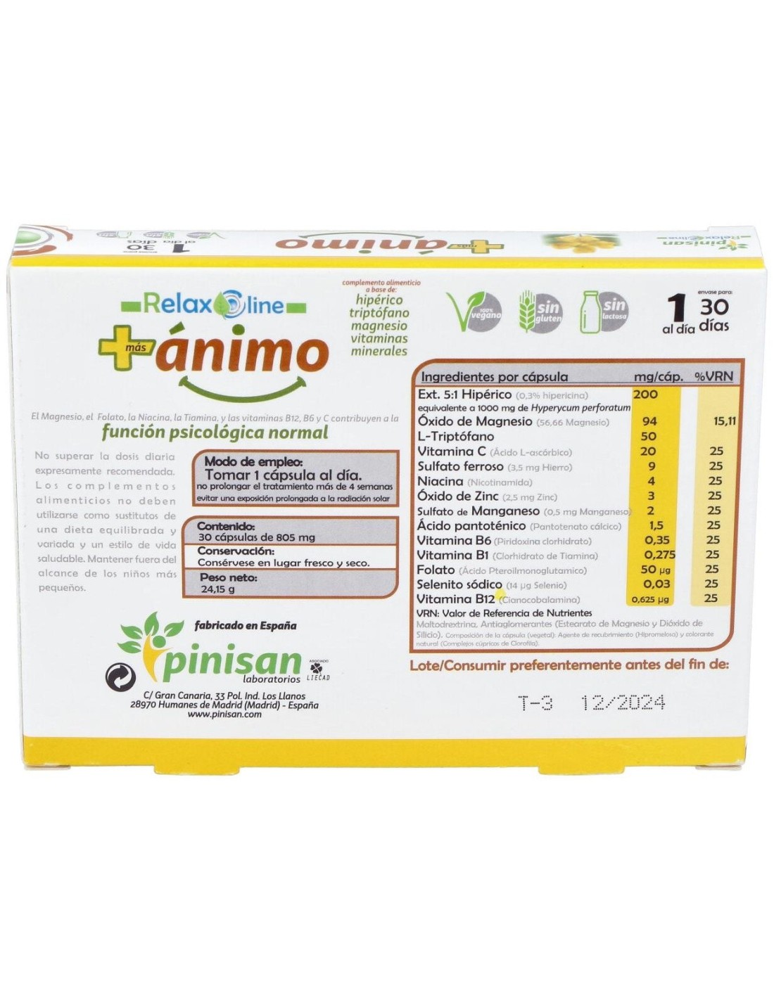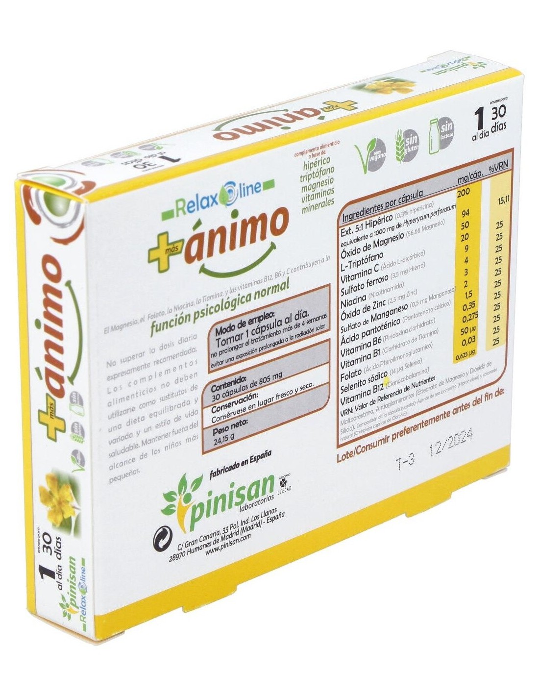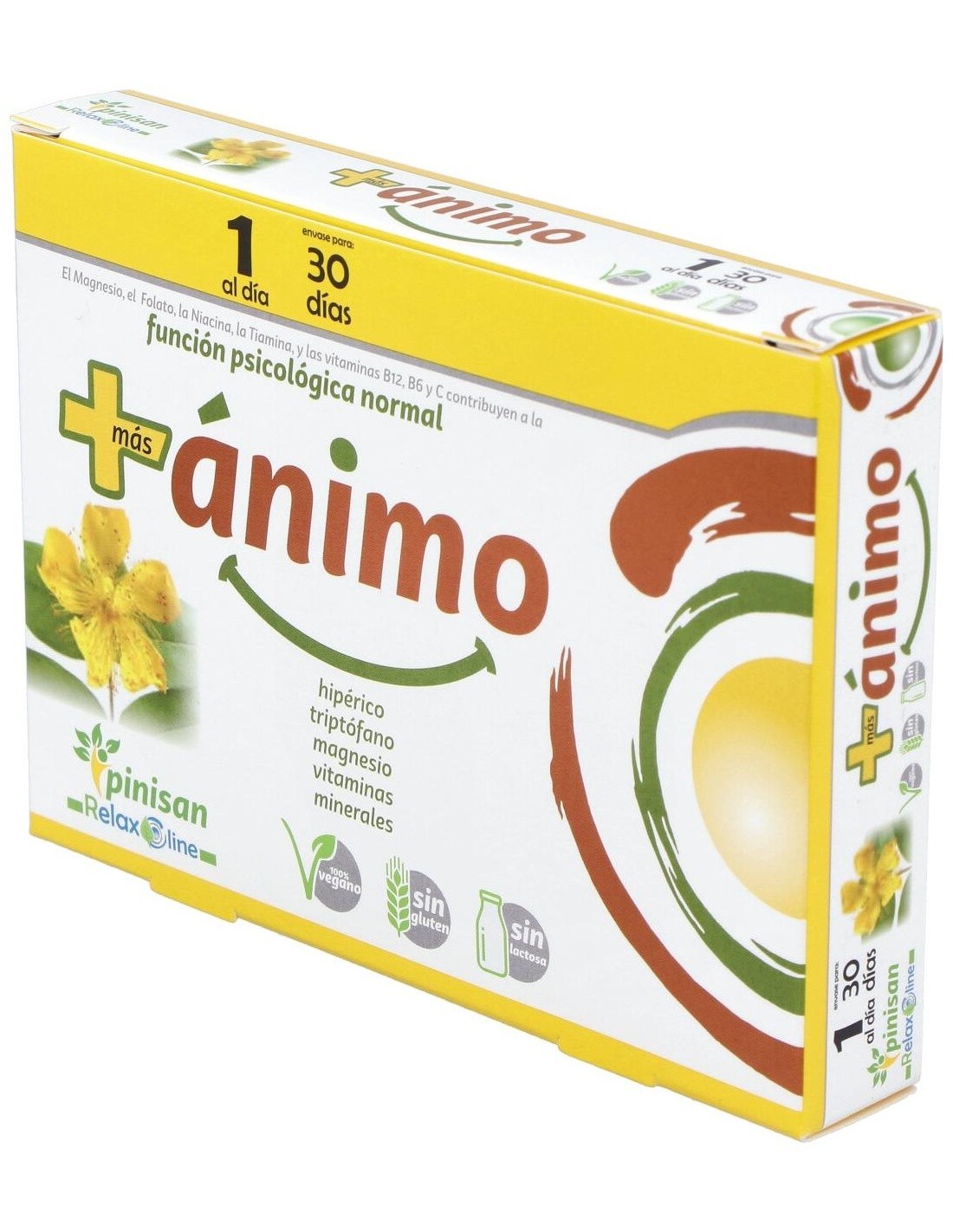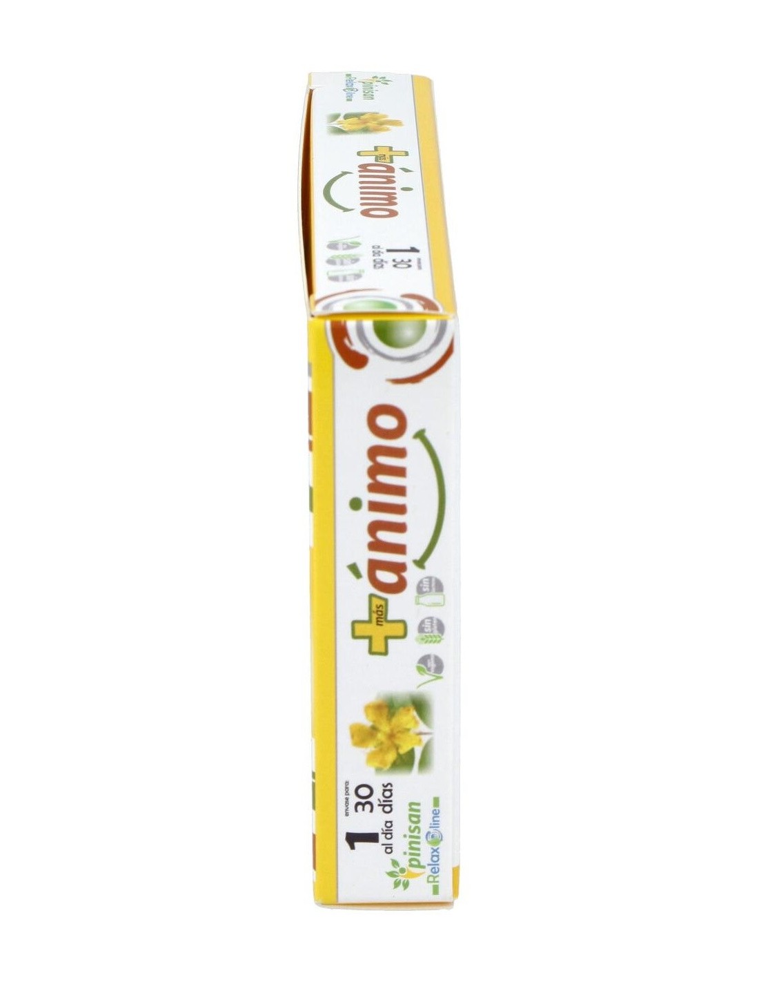 Pinisan Más Ánimo es un complemento alimenticio que contribuye a la mejora del estado de ánimo gracias a su fórmula con hipérico, triptófano, vitaminas (principalmente del grupo B) y magnesio. También contribuye al funcionamiento psicológico normal.