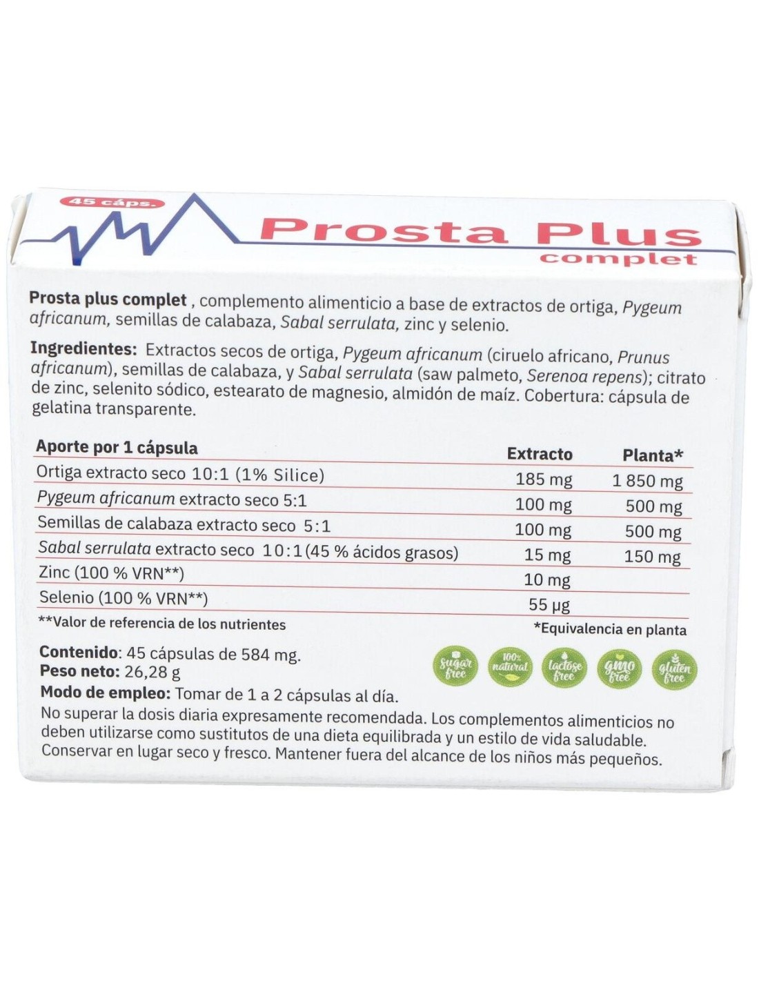 Extractos secos de ortiga, Pygeum africanum (ciruelo africano, Prunus africanum), semillas de calabaza, y Sabal serrulata (saw palmeto, Serenoa repens): citrato de zinc, selenito sódico, estearato de magnesio, almidón de maíz. Cobertura: cápsula de gelatina transparente.
