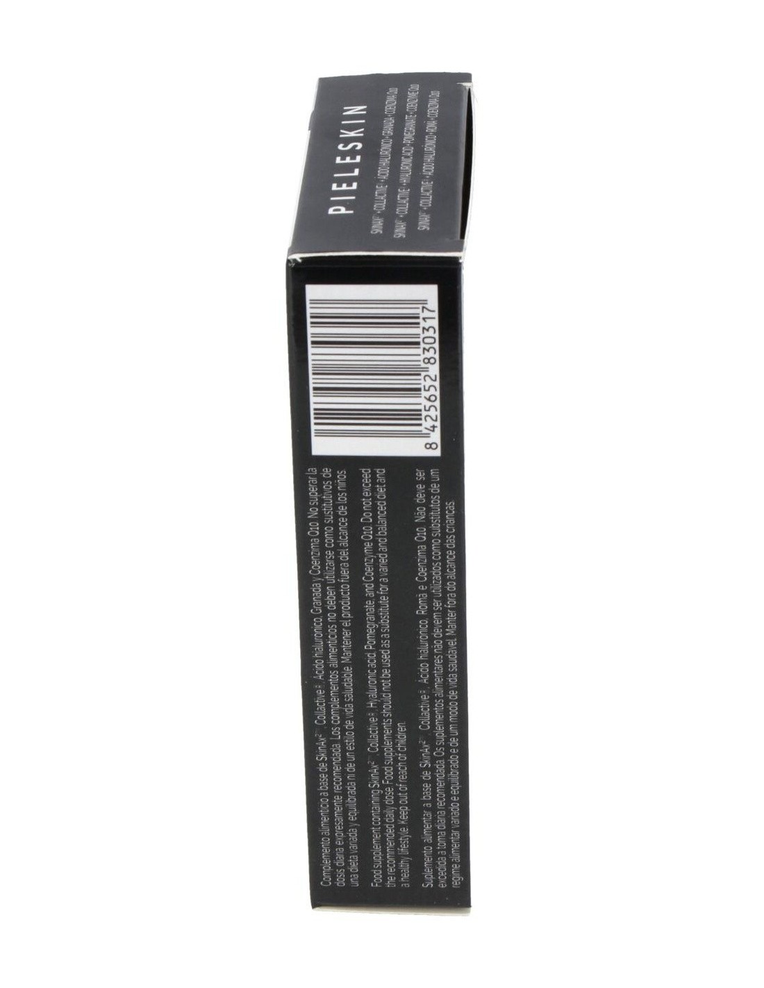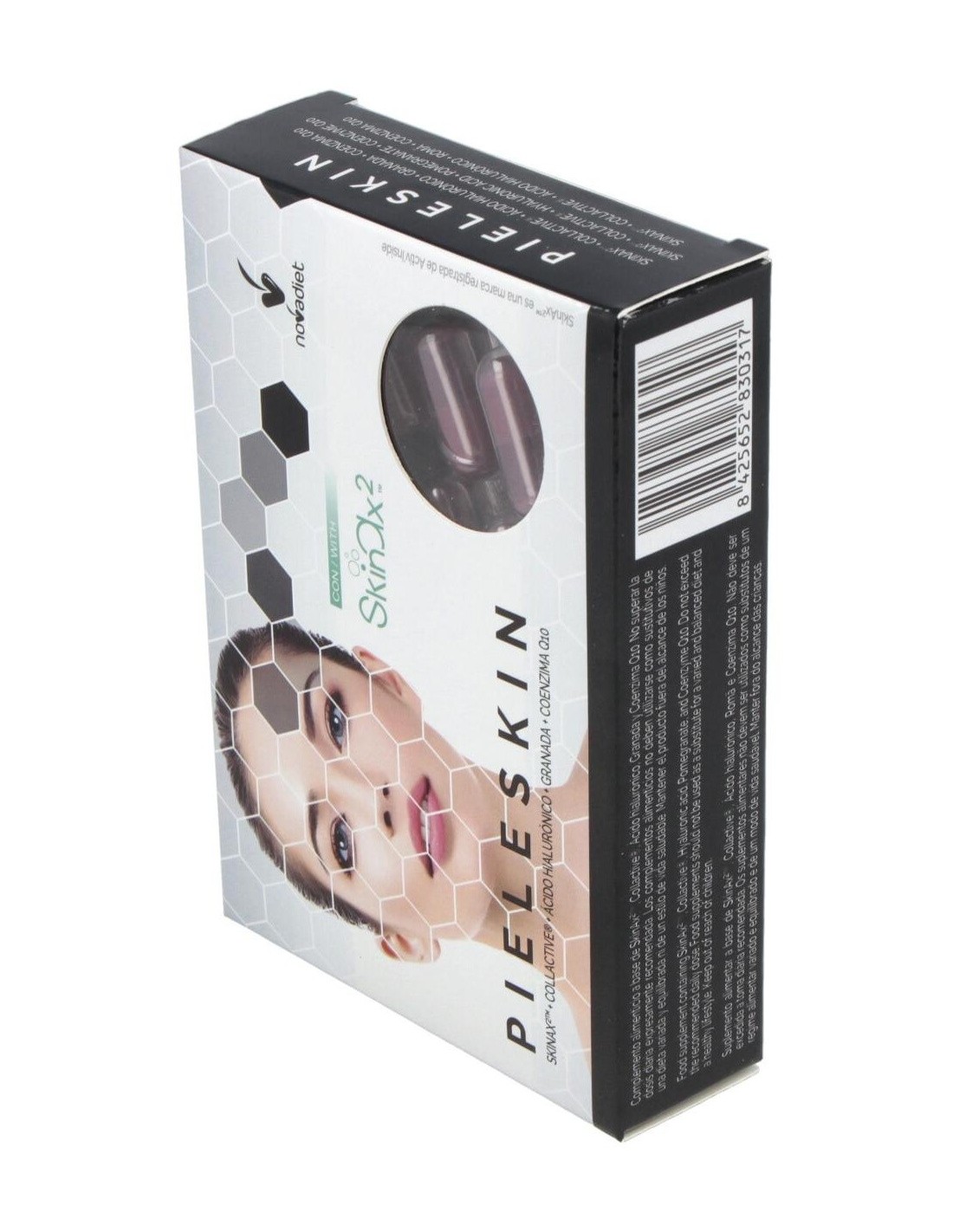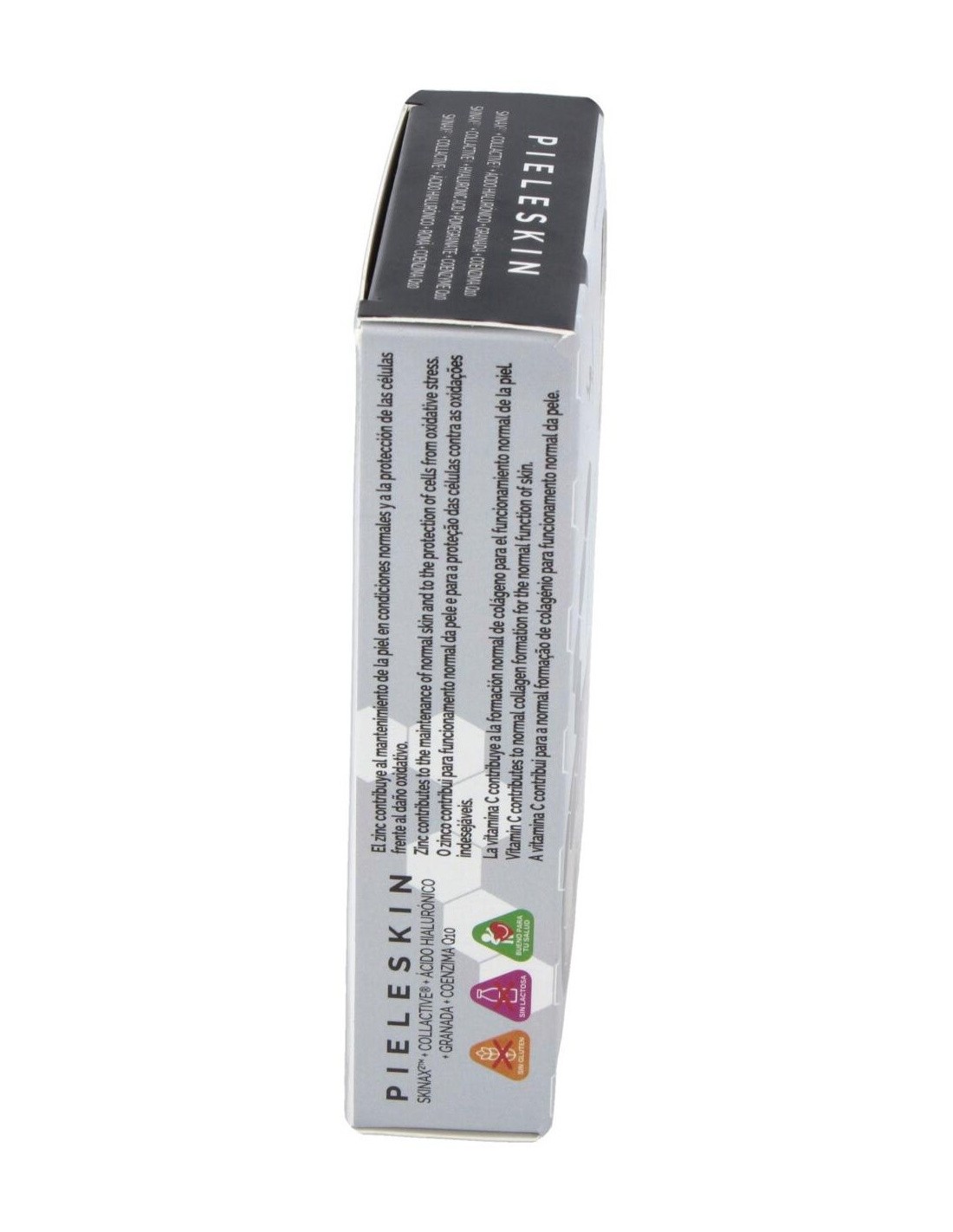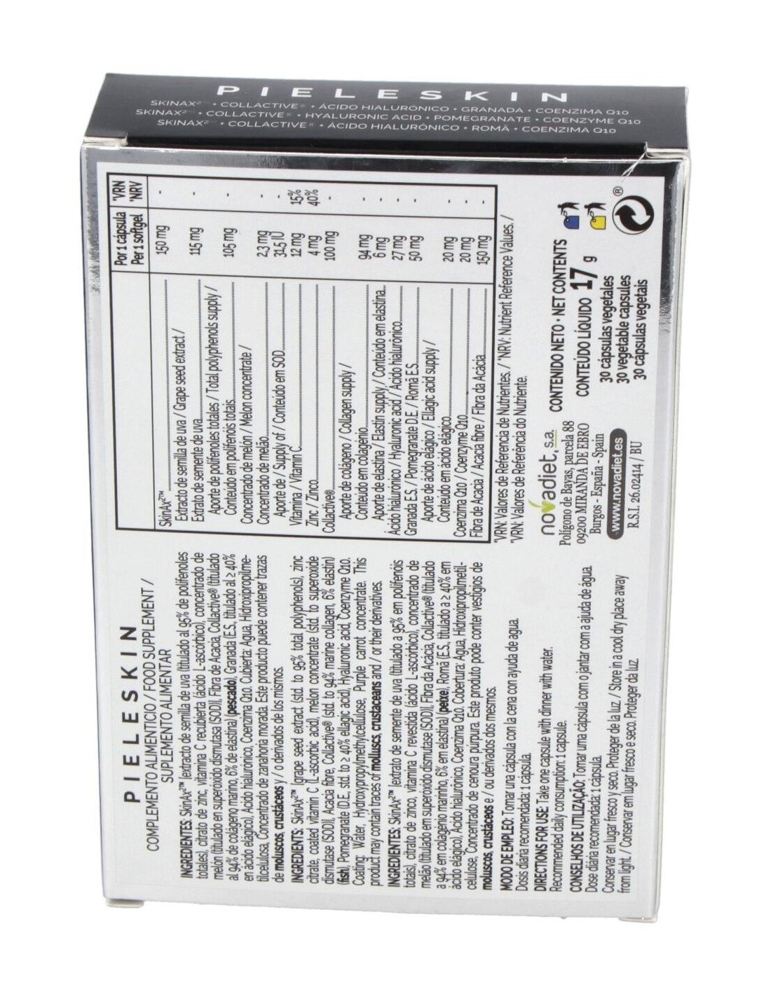 SkinAx (extracto de semilla de uva titulado al 95% de polifenoles totales, citrato de zinc, vitamina C recubierta (ácido L-ascórbico), concentrado de melón titulado en superóxido dimutasa, fibra de acacia) Collactive (titulado al 94% de colágeno marino, 6% de elastina) (pescado), granada (E.S. titulado al 40% en ácido elágico), ácido hialurónico, coenzima Q10, cubierta: agua, hidroxipropilmetilcelulosa, concentrado de zanahoria morada.