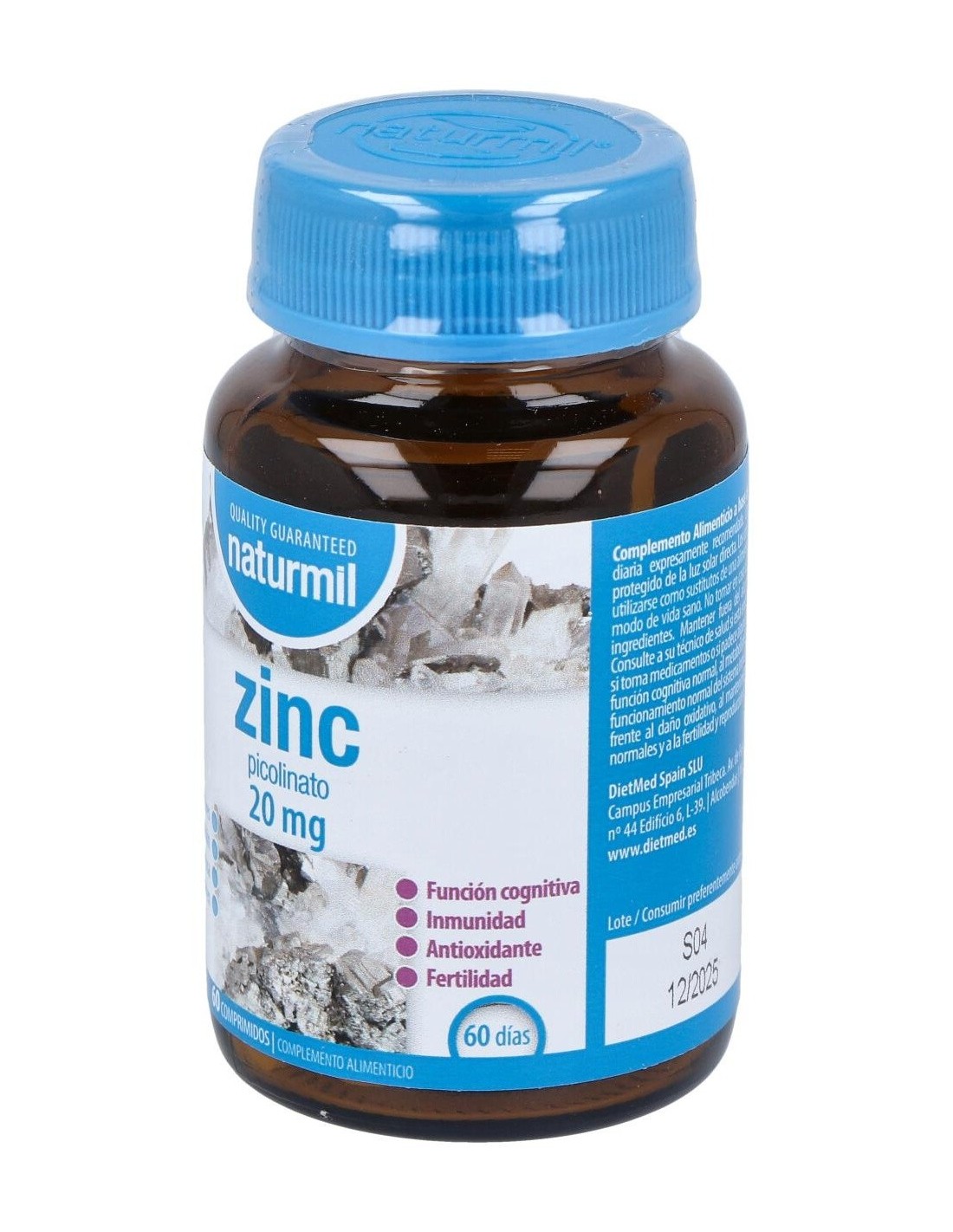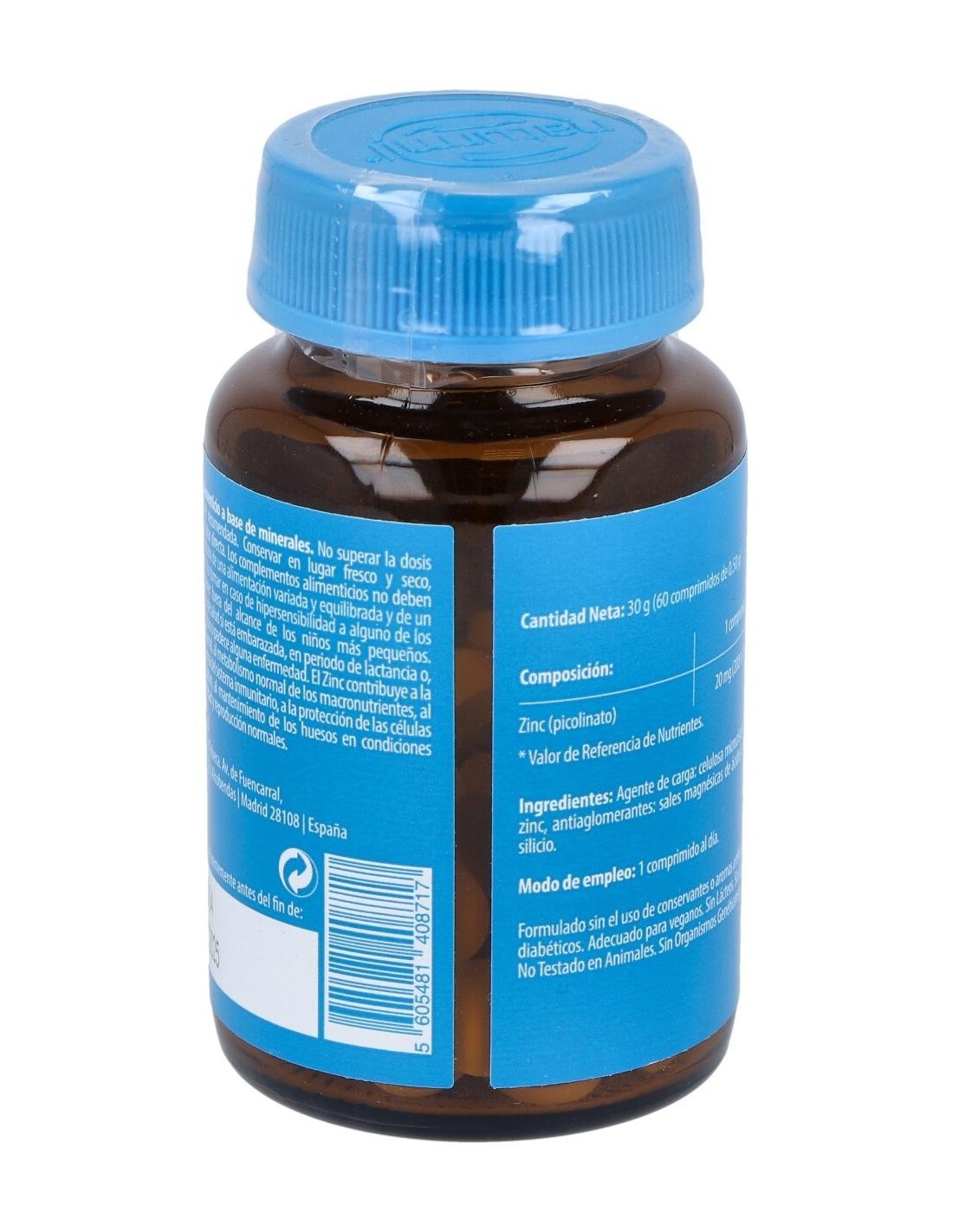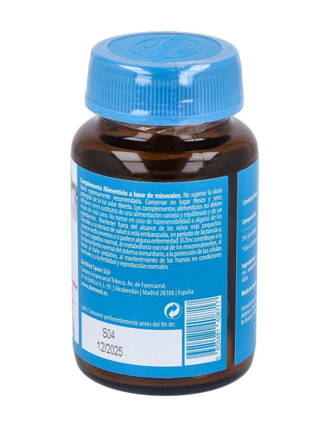 Complemento alimenticio a base de minerales. Sin azúcares, sin almidón, sin lactosa y sin gluten, tolerado por diabéticos, sin lácteos, sin soja, adecuado para veganos, sin OGM. El zinc contribuye a la función cognitiva normal, al metabolismos normal de los macronutrientes, al funcionamiento normal del sistema inmunitario, a la protección de las células frente al daño oxidativo, al mantenimiento de los huesos en condiciones normales y a la fertilidad y reproducción normales.