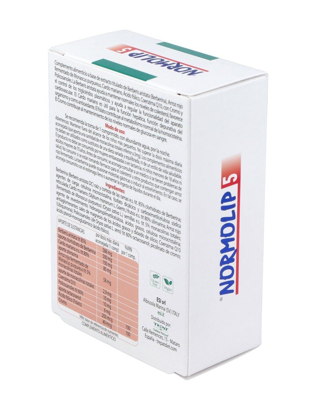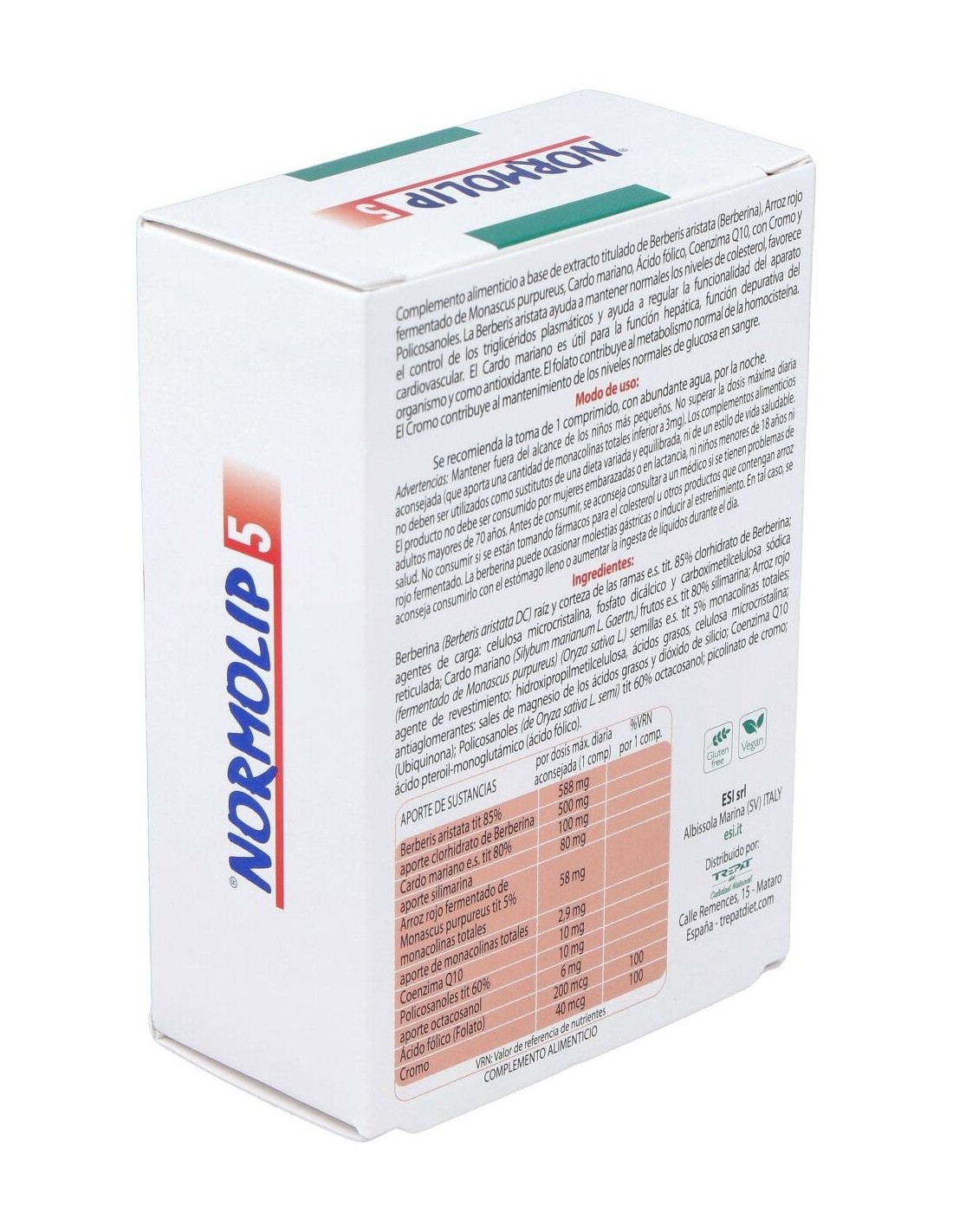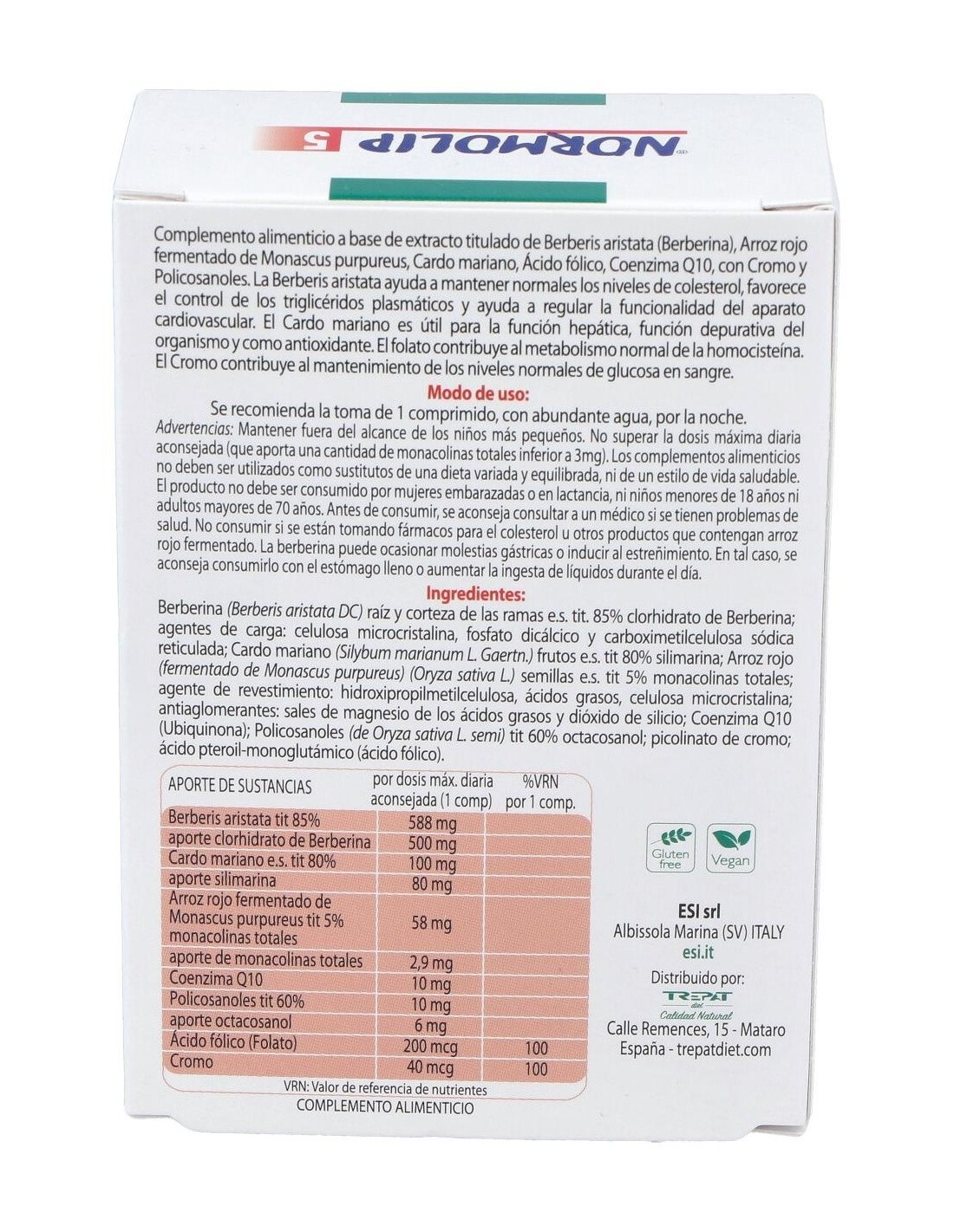Complemento alimenticio presentado en forma de comprimidos, que ayuda a mantener los niveles normales de colesterol. Favorece el control de los triglicéridos plasmáticos y contribuye a regular la funcionalidad del sistema cardiovascular. Está formado por una fórmula de ingredientes a base de: extracto titulado de Berberis aristata, arroz rojo fermentado por el monascus purpureus, cardo mariano, ácido fólico, coenzima Q10, cromo y policosanoles. No contiene gluten, lactosa, derivados lácteos, OGM. Apto vegetarianos y veganos.