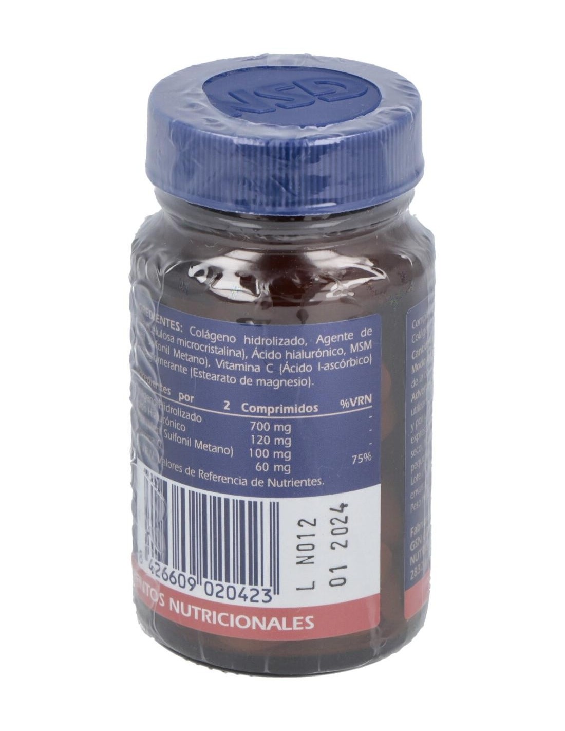 60 mg de ácido hialurónico; 350mg de colágeno hidrolizado tipo II, 50mg de MSM; 30mg de vitamina C.
