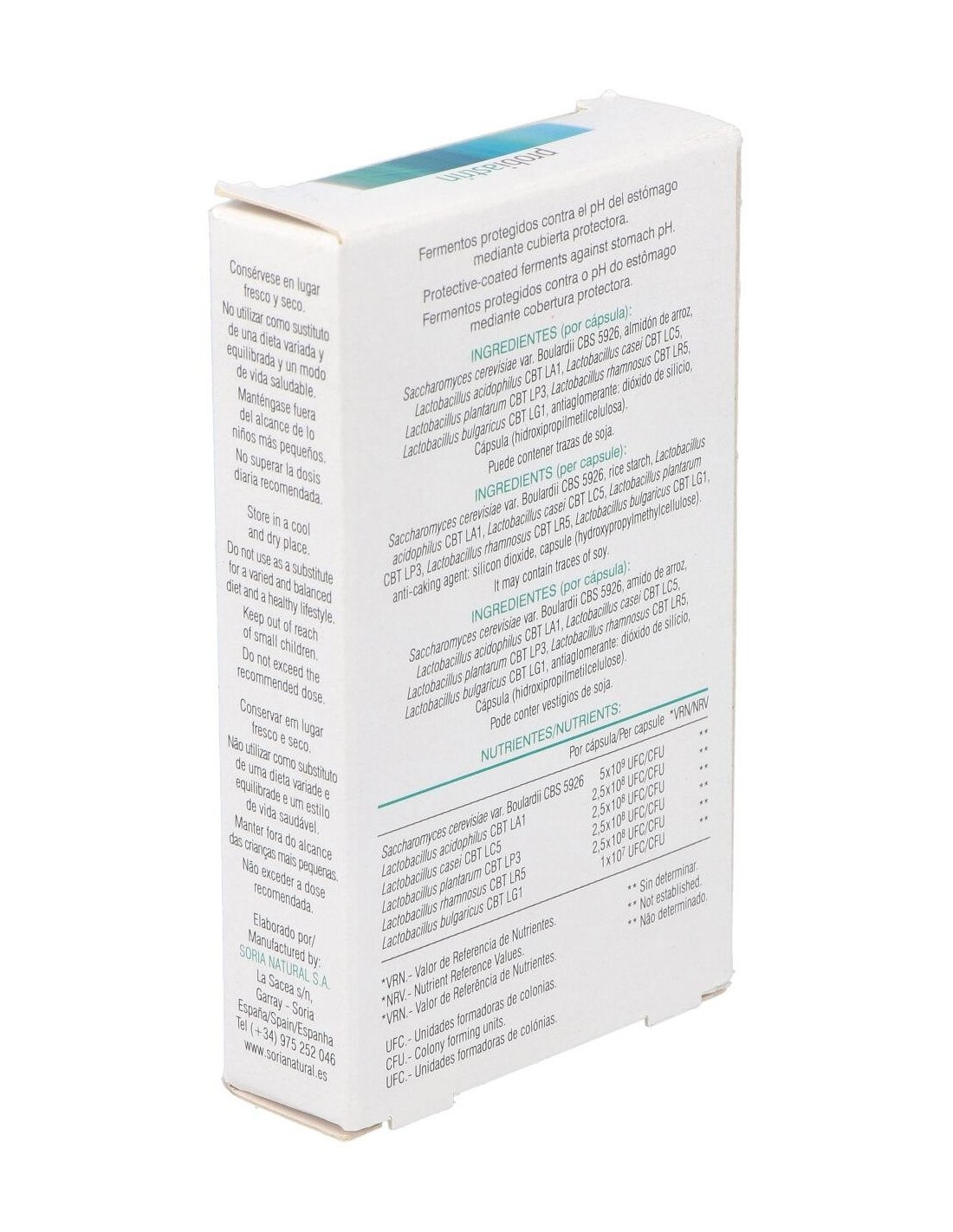 Saccharomyces cerivisiae var. Boulardii CBS 5929, almidón de arroz, Lactobacillus acidophilus CBT LA1, Lactobacillus casei CBT LC5, Lactobacillus plantarum CBT LP3, Lactobacillus rhamnosus CBT LR5, Lactobacillus bulgaricus CBT LG1, antiaglomerante: dióxido de silicio, Cápsula (hidroxipropilmetilcelulosa).