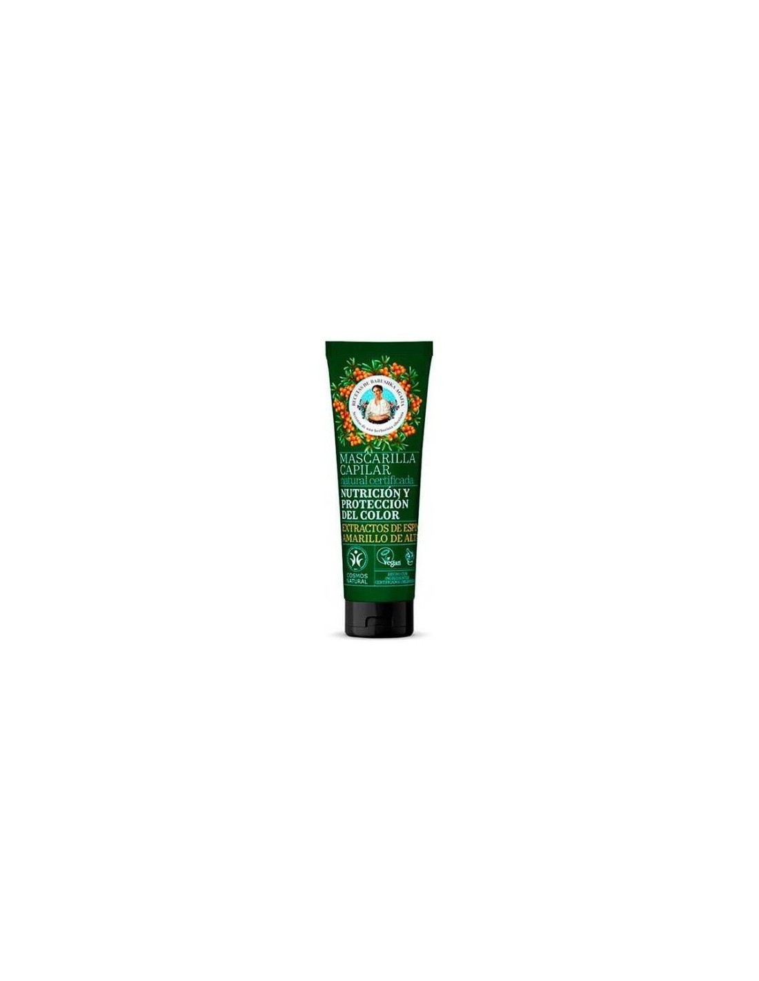 La Mascarilla Capilar Natural Nutrición y Protección del color ha sido creada pensando en el cuidado del cabello y para ayudar a potenciar el color, logrando un brillo intenso gracias a la combinación de sus ingredientes naturales que tienen como base el Espino amarillo de Altái, muy beneficioso para el cabello ya que aporta ácidos grasos Omega 3, 6 y 9, que estimulan el crecimiento y la regeneración del cabello, ayudando a mantenerlo hidratado y a restaurar el equilibrio del cuero cabelludo.