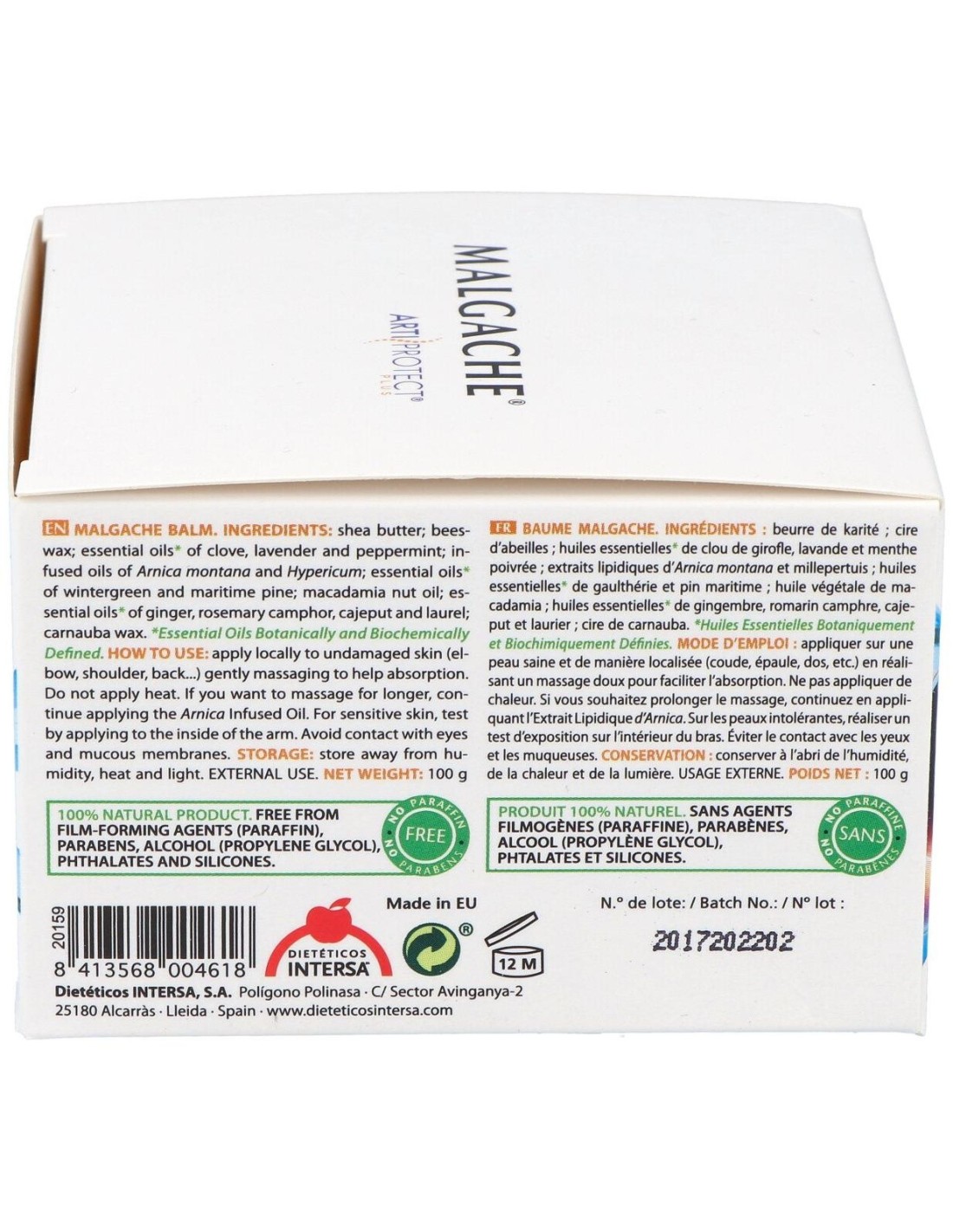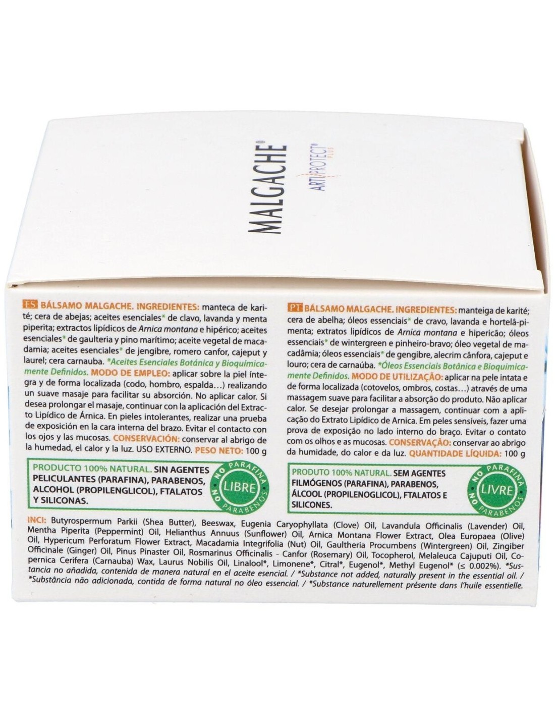 Butyrospermum Parkii (Shea Butter), Beeswax, Eugenia Caryophyllata (Clove) Oil, Lavandula Officinalis (Lavender) Oil, Mentha Piperita (Peppermint) Oil, Helianthus Annuus (Sunflower) Oil, Arnica Montana Flower Extract, Olea Europea (Olive) Oil, Hypericum Perforatum Flower Extract, Macadamia Integrifolia (Nut) Oil, Gaultheria Procumbens (Wintergreen) Oil, Zingiber Officinale (Ginger) Oil, Pinus Pinaster Oil, Rosmarinus Officinalis - Canfor (Rosemary) Oil, Tocopherol, Melaleuca Cajeputi Oil, Copernica Cerifera (Carnauba) Wax, Laurus Nobilis Oil, Linalool, Limonene, Citral, Eugenol, Methyleugenol (no sobrepasa el 0,002%).