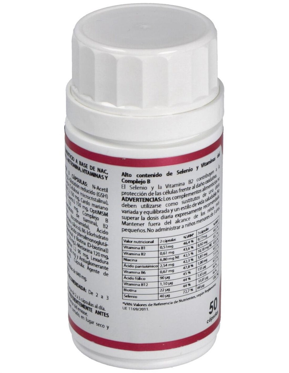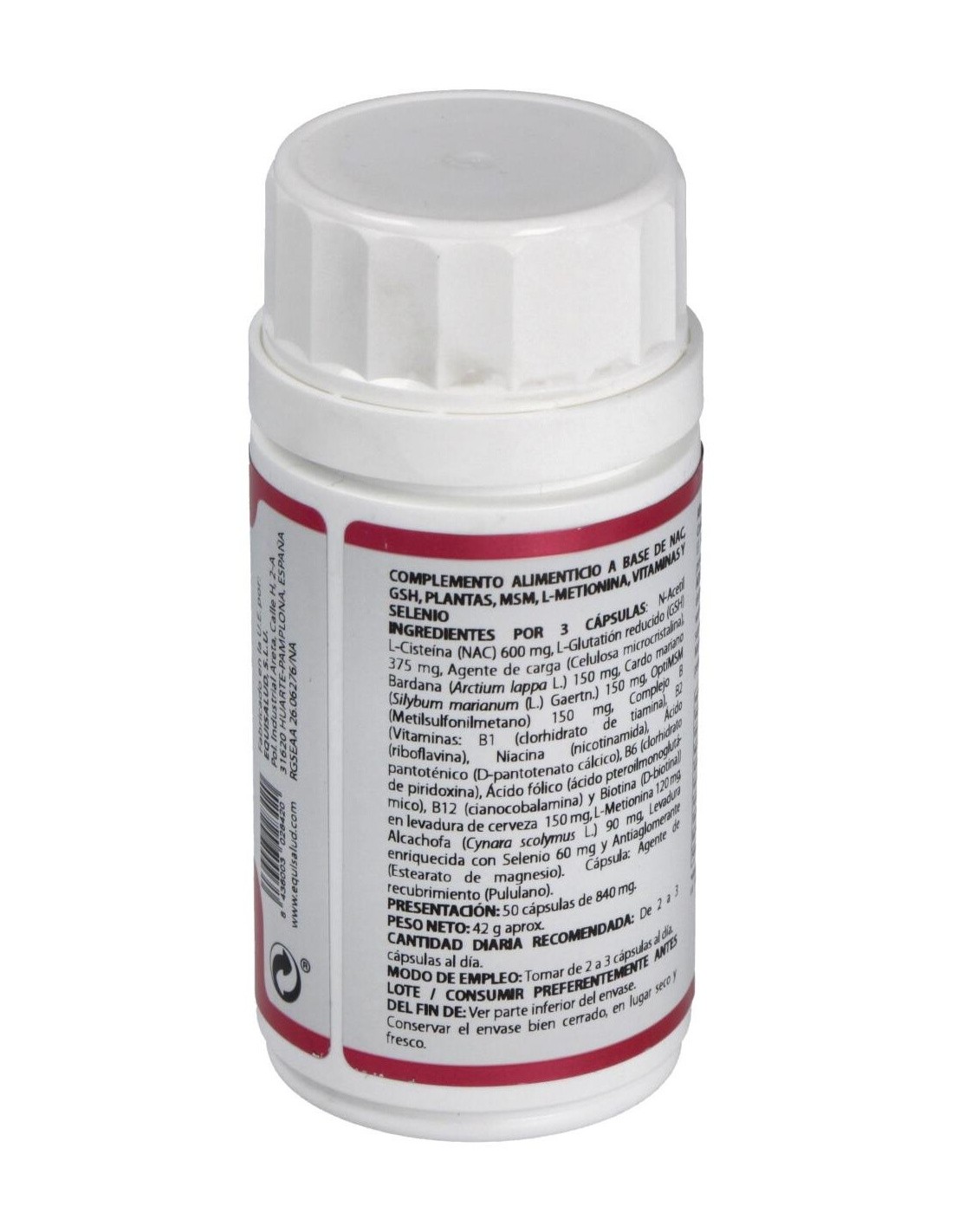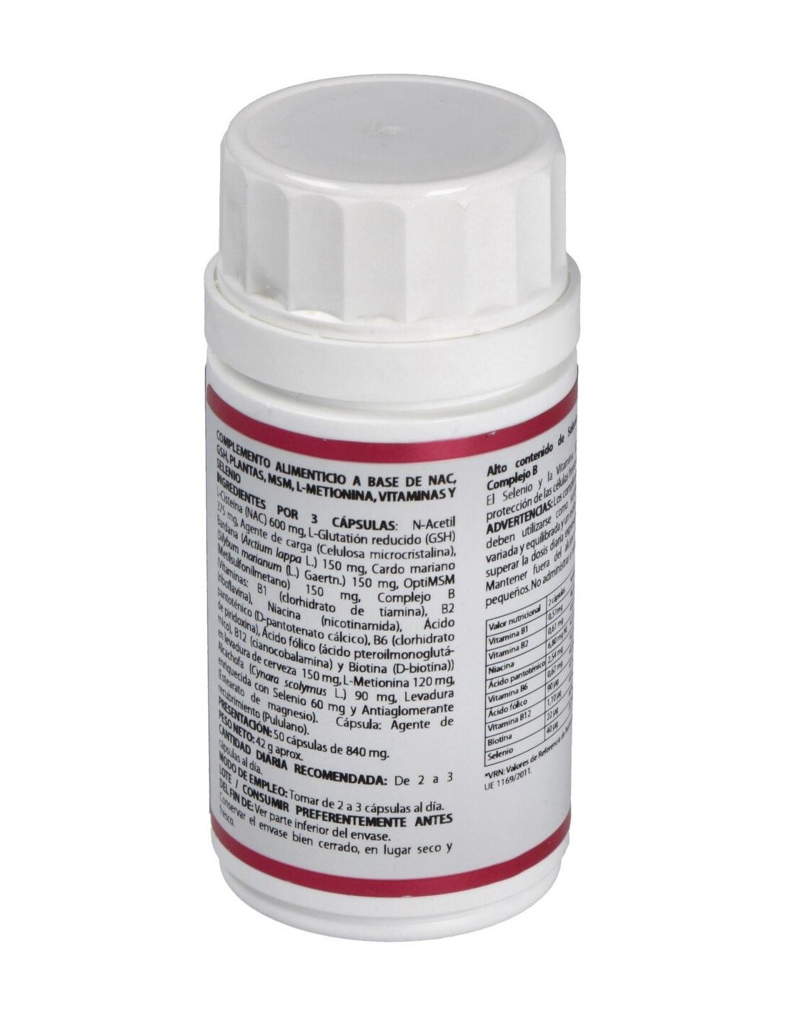 N-acetil-L-cisteína, L-glutatión reducido, MSM, Complejo Vit B, Bardana, Cardo mariano, L-metionina, Alcachofa, Selenio en levadura.
