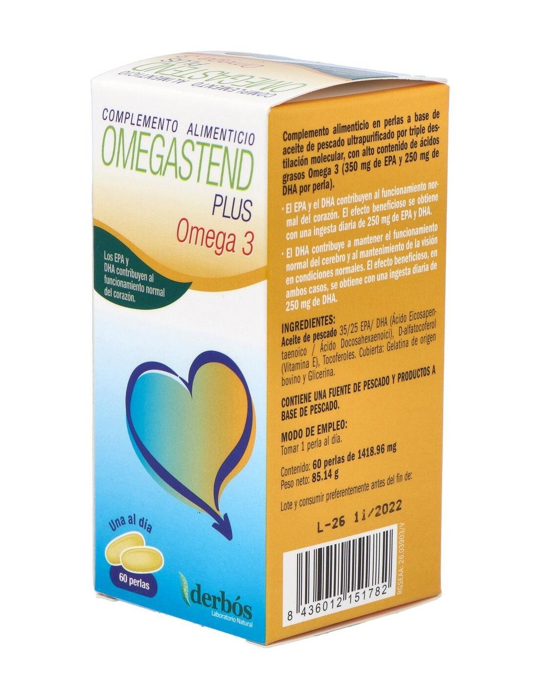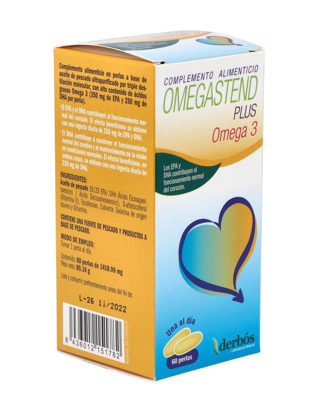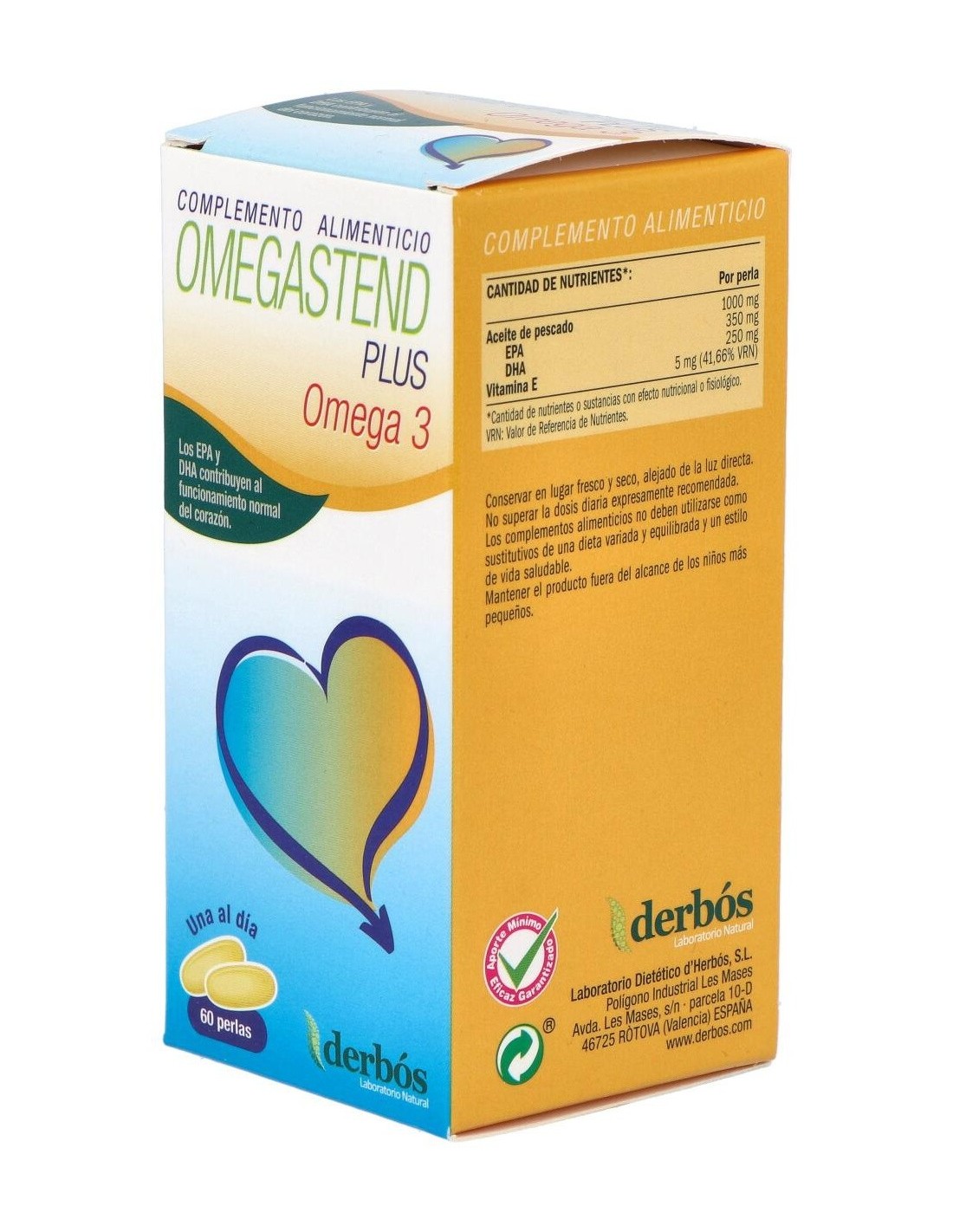 El Omegastend Plus 60Perlas de Derbos es un suplemento nutricional para adultos que contribuye al bienestar general mediante una fórmula equilibrada de ácidos grasos esenciales y nutrientes clave.