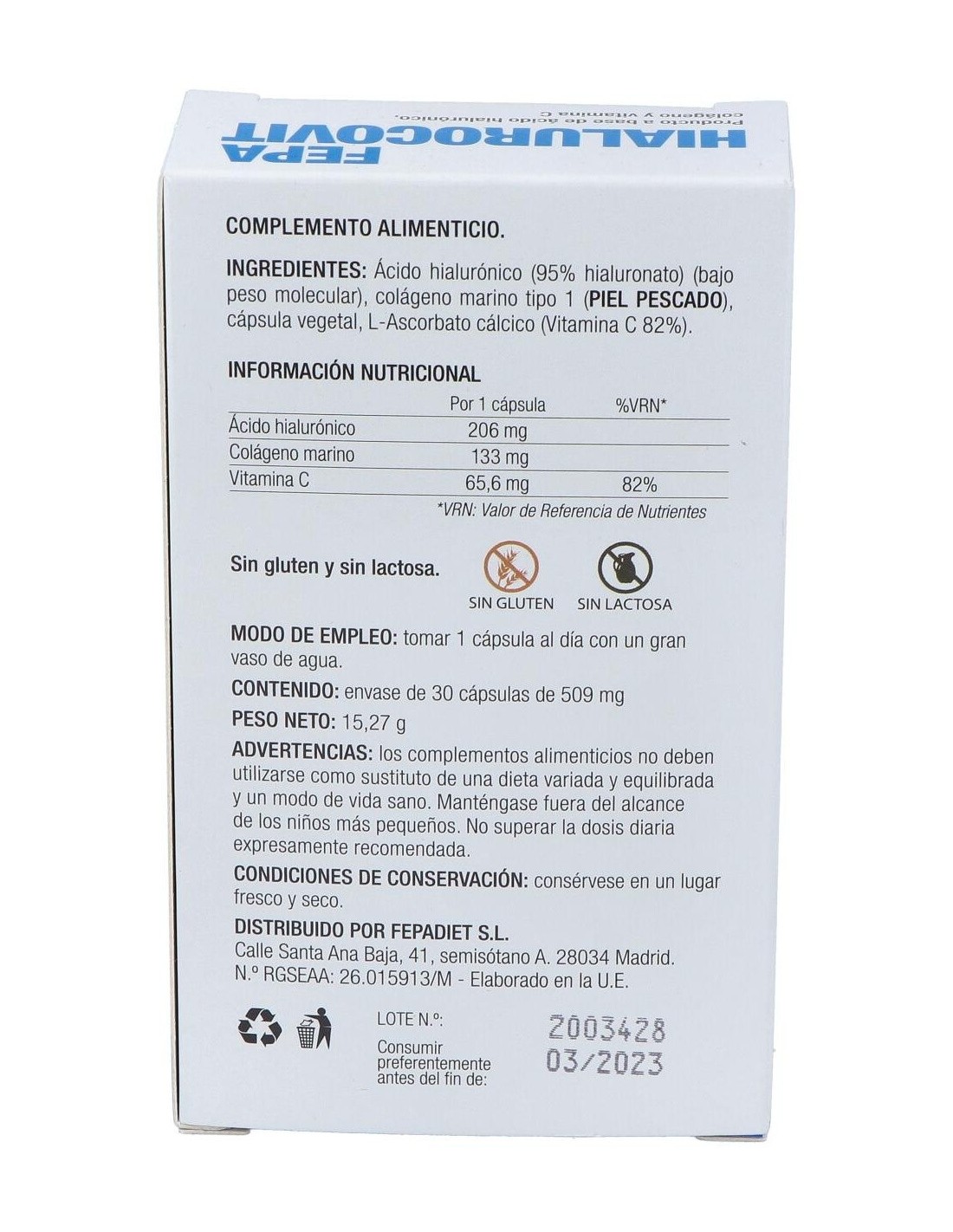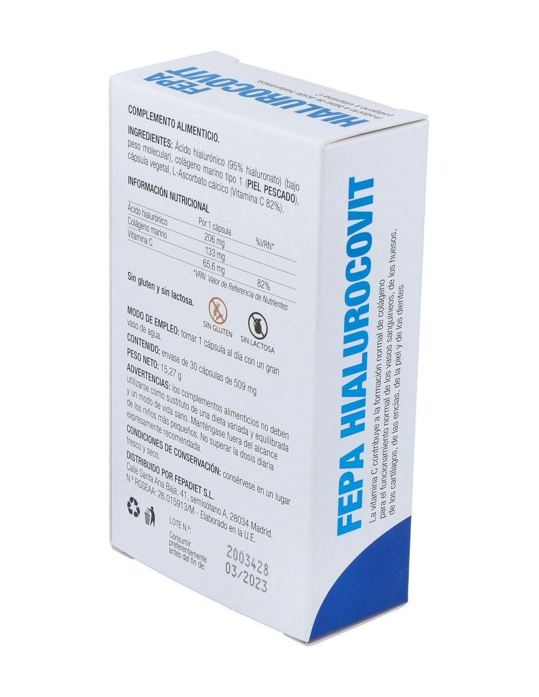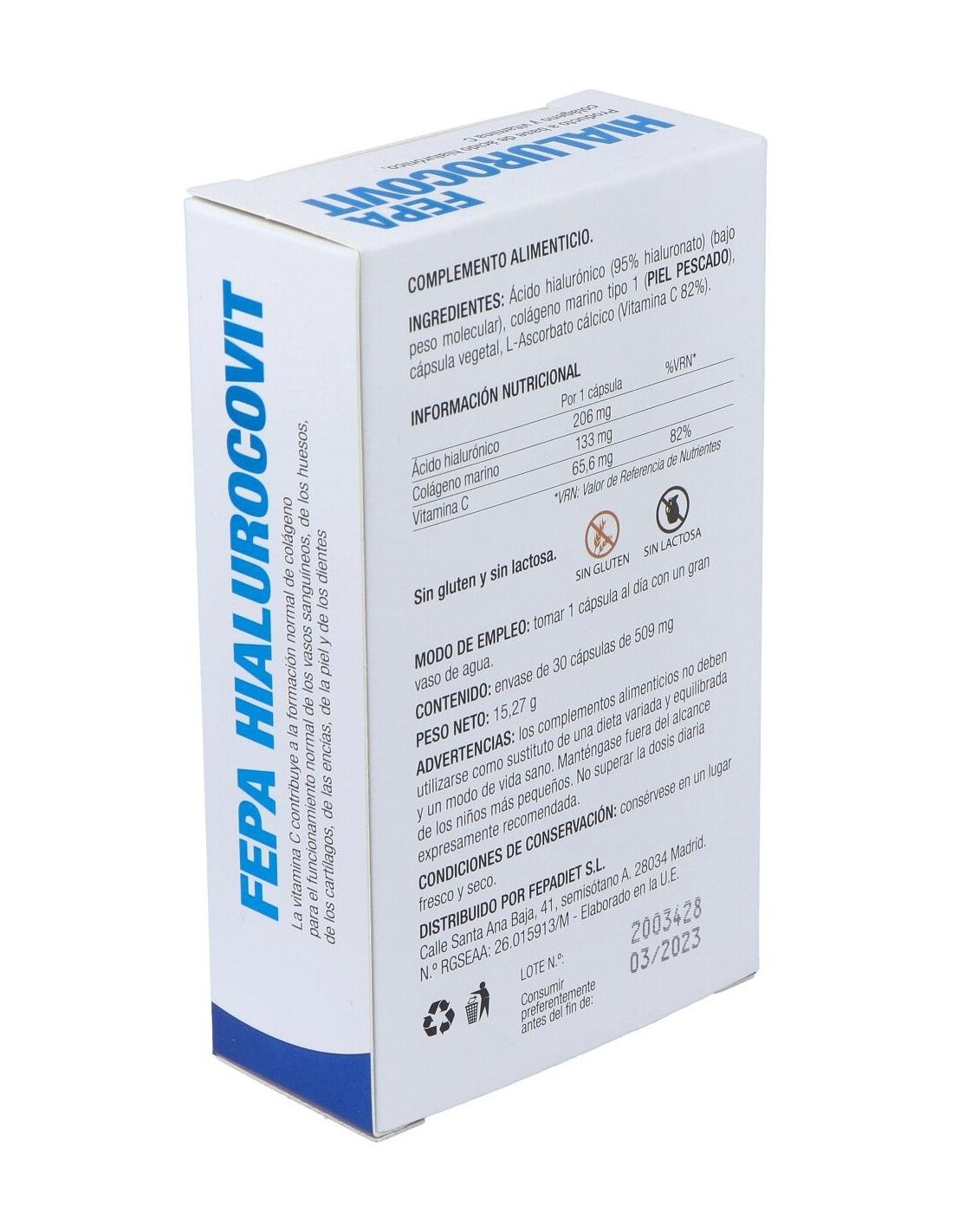 Fepa-Hialurocovit 200Mg. 30Cap. de Fepadiet es un suplemento nutricional para adultos que contribuye al cuidado articular y la salud de la piel, gracias a su fórmula con ácido hialurónico y vitaminas esenciales.