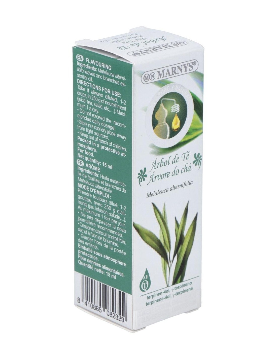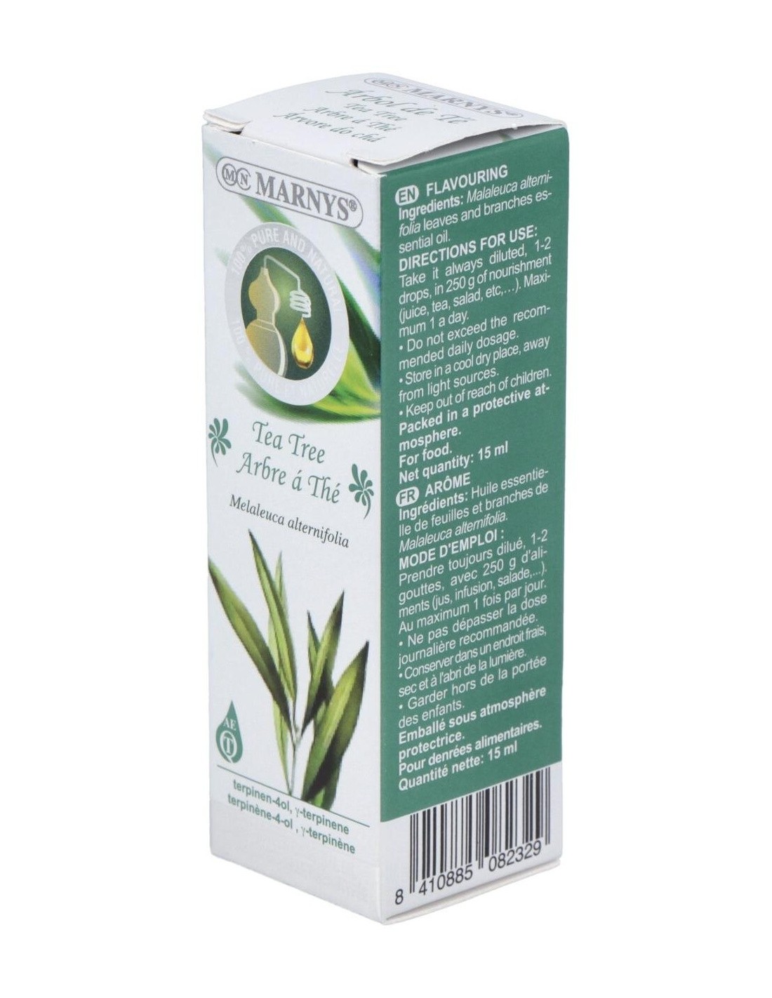 El aceite esencial de Tea Tree de Marnys se obtiene mediante procesos que preservan sus componentes naturales, garantizando un producto apto para uso alimentario. Su envase compacto está diseñado para proteger el contenido de la luz y el aire, contribuyendo a mantener su estabilidad y frescura.