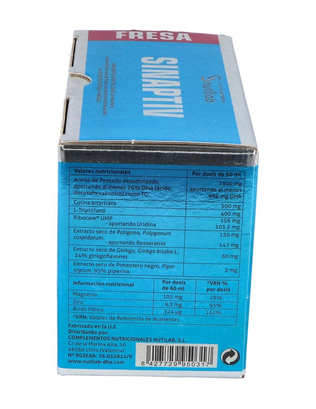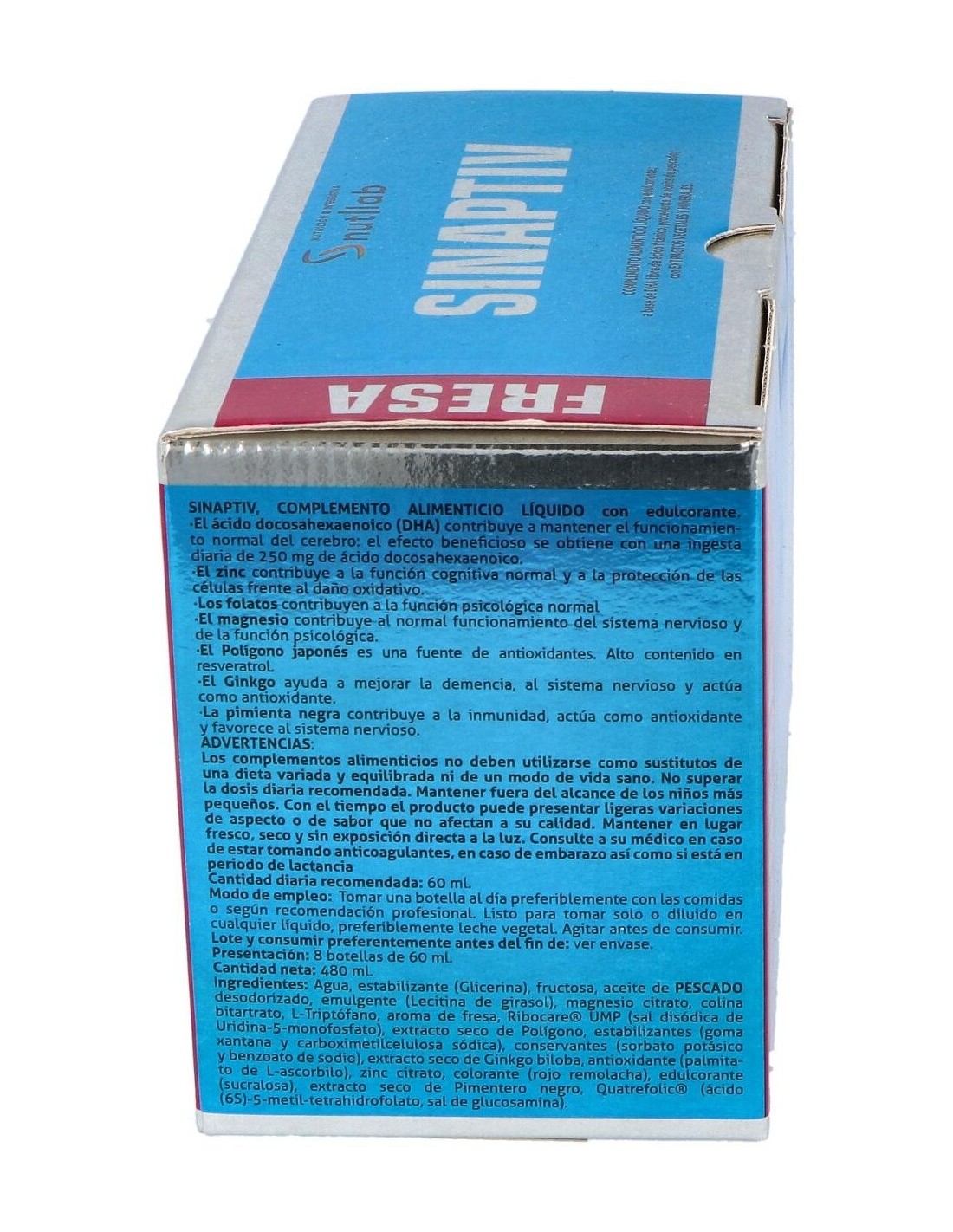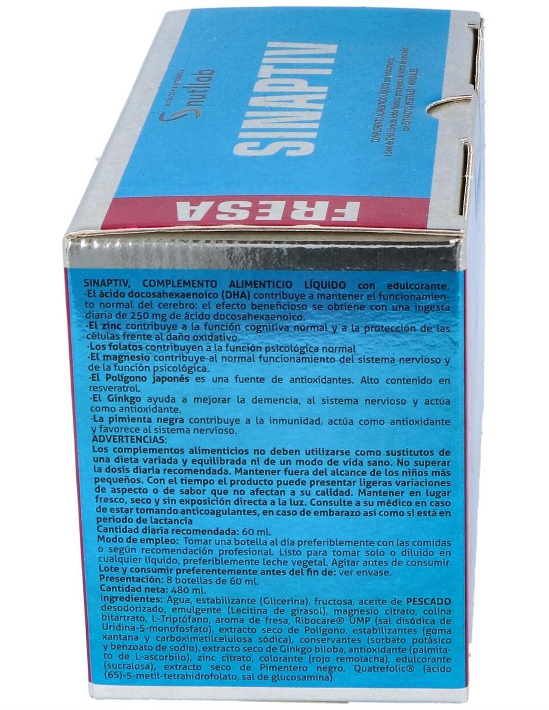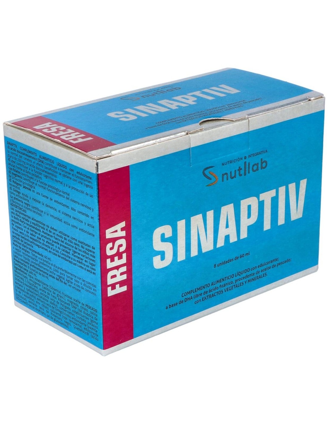 Sinaptiv Fresa 8 Viales de Nutilab es un complemento nutricional dirigido a personas que buscan apoyar la función cognitiva. Su fórmula contiene ingredientes específicos para contribuir al bienestar cerebral.