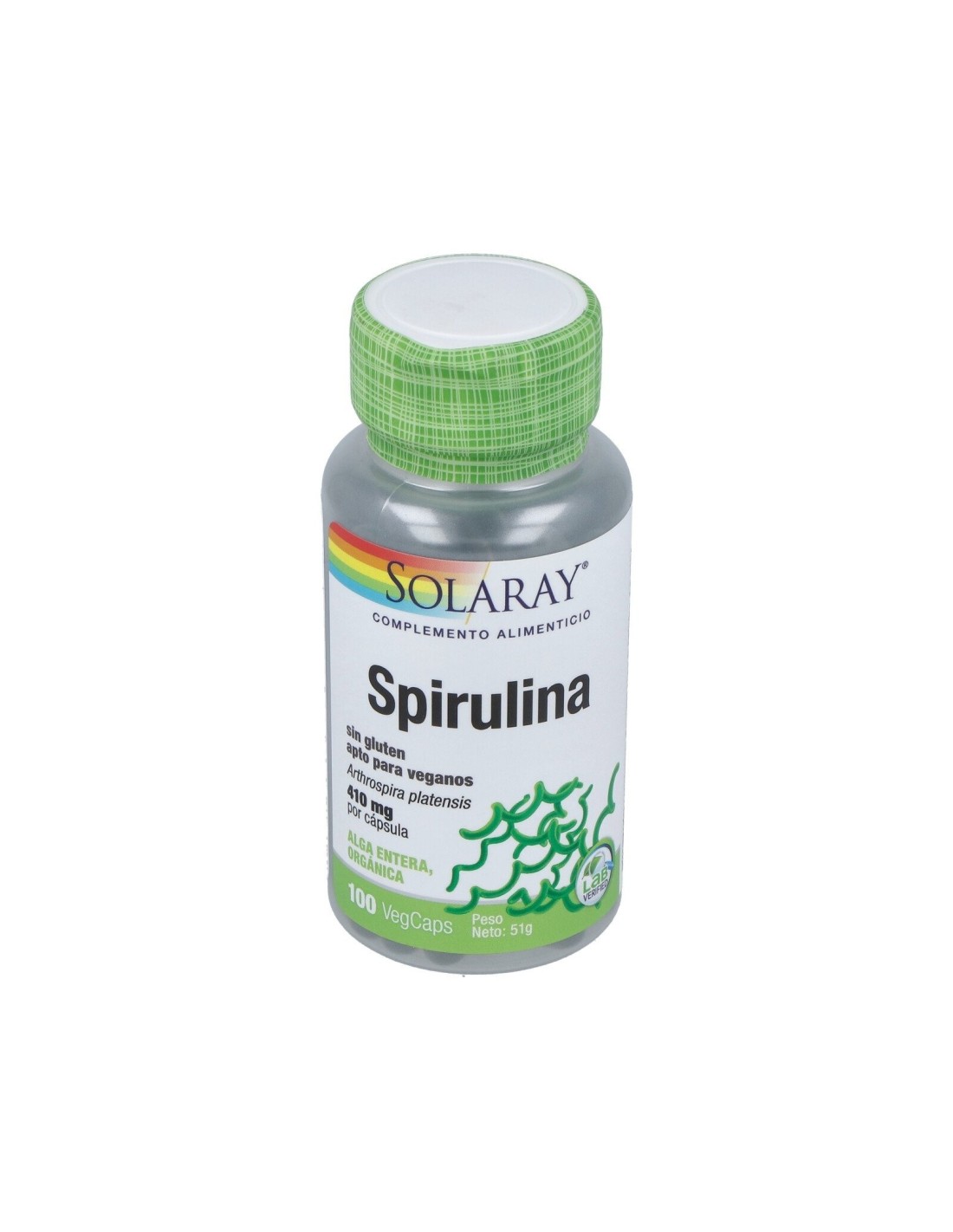 Complemento alimenticio Solaray Spirulina. El envase posee un peso de 410mg y contiene 100 unidades. Su composición a base de espirulina le confiere propiedades vitamínicas beneficiosas para el organismo. Aporta la dosis de minerales esenciales para contribuir al desempeño adecuado de las funciones orgánicas. Brinda cantidades importantes de vitamina A que contribuyen al metabolismo adecuado del hierro, al funcionamiento óptimo del sistema inmunitario y al proceso de diferenciación celular. Recomendado para pacientes con deficiencia vitamínica general. Adecuado para usuarios bajo régimen dietético a base de alimentos orgánicos.