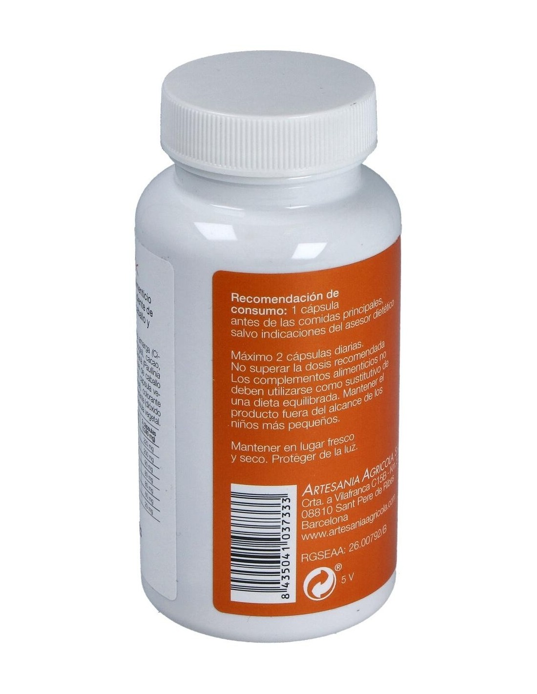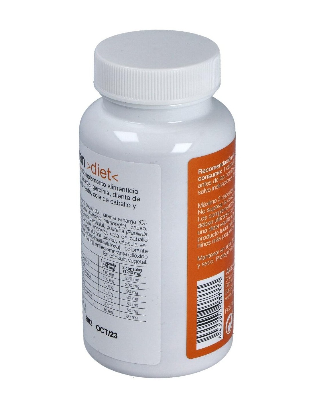 Ingredientes:Extractos secos de: citrus auriantium, garcinia cambogia, cacao, diente de león, guaraná, té verde, cola de caballo, ortiga, cápsula vegetal [hidroxipropil metil celulosa, colorantes (óxidos e hidróxidos de hierro)], antiaglomerante (talco, dióxido de silicio), lipasa.Modo de empleo:Tomar 1 cápsula antes de las comidas principales.Presentación:Envase de 60 cápsulas.
