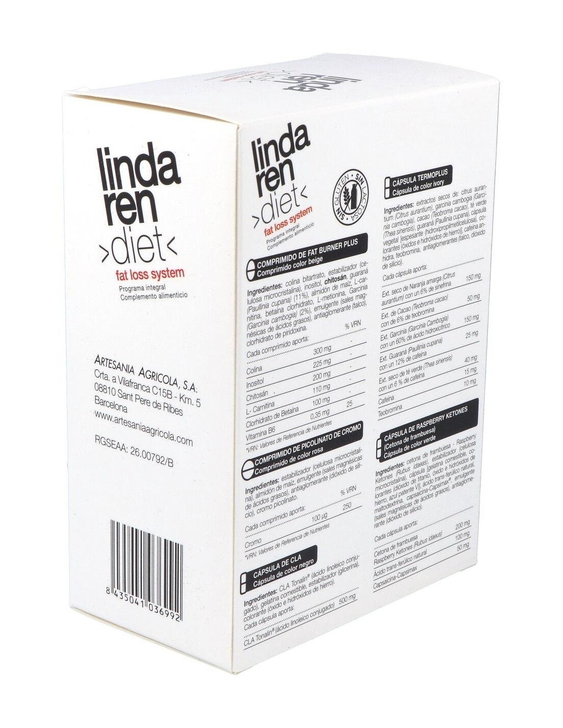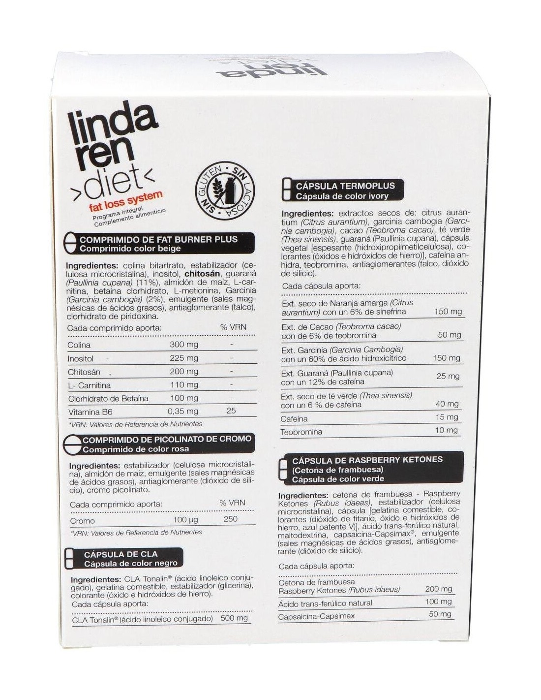 Cápsula verde: cetona de frambuesa, celulosa microcristalina, gelatina comestible, dióxido de titanio, óxidos e hidróxidos de hierro, azul patente V, ácido trans-ferúlico natural, maltodextrina, capsaicina- Capsimax, sales magnésicas de ácidos grasos, dióxido de silicio.