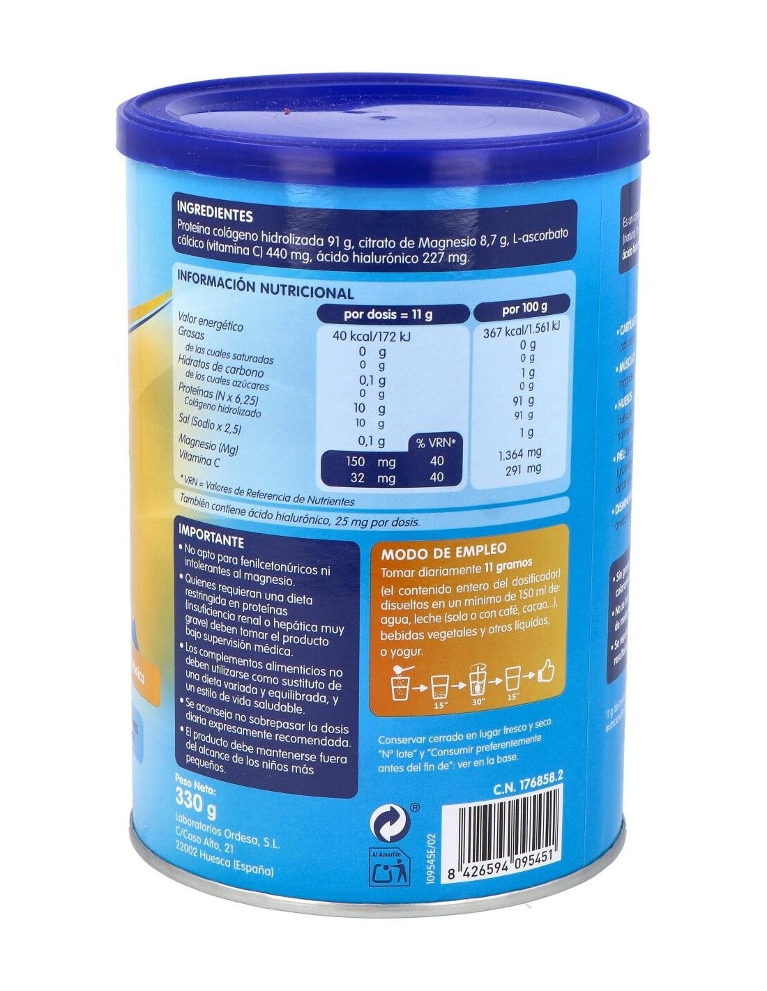 Proteína hidrolizada de colágeno 300 g, citrato de Magnesio 4082 mg, vitamina C 873 mg y Ácido Hialurónico 681 mg, stevia.