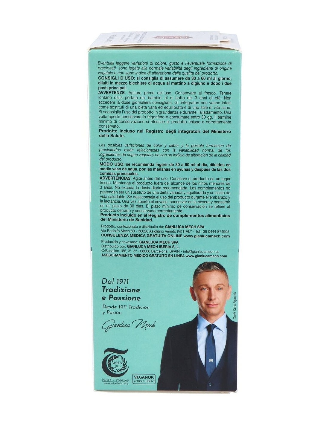 Ingredientes:Extracto acuoso de hierbas amargas 70%: Quina (Cinchona succirubra Pav.) corteza, Bardana (Arctium lappa L.) raíz, Ruibarbo (Rheum palmatum var. tagunticum Maxim.) rizoma, Diente de león (Taraxacum officinale (D.C.) Web.) raíz, Alcachofa (Cynara scolymus L.) hoja, Espirulina (Spirulina platensis) tallo, Cola de caballo (Equisetum arvense L.) hierba, Genciana (Gentiana lutea L.) raíz, Marrubio (Marrubium vulgare L.) hierba, Rábano negro (Raphanus sativus L. var. niger Miller) raíz. Agua, aromas, colorante (caramelo natural).Modo de empleo:Se recomienda ingerir de 30 a 60 ml al día, diluidos en medio vaso de agua, por las mañanas en ayunas y después de las dos comidas principales. Presentación:Frasco de 500 ml.