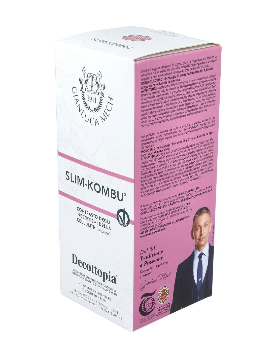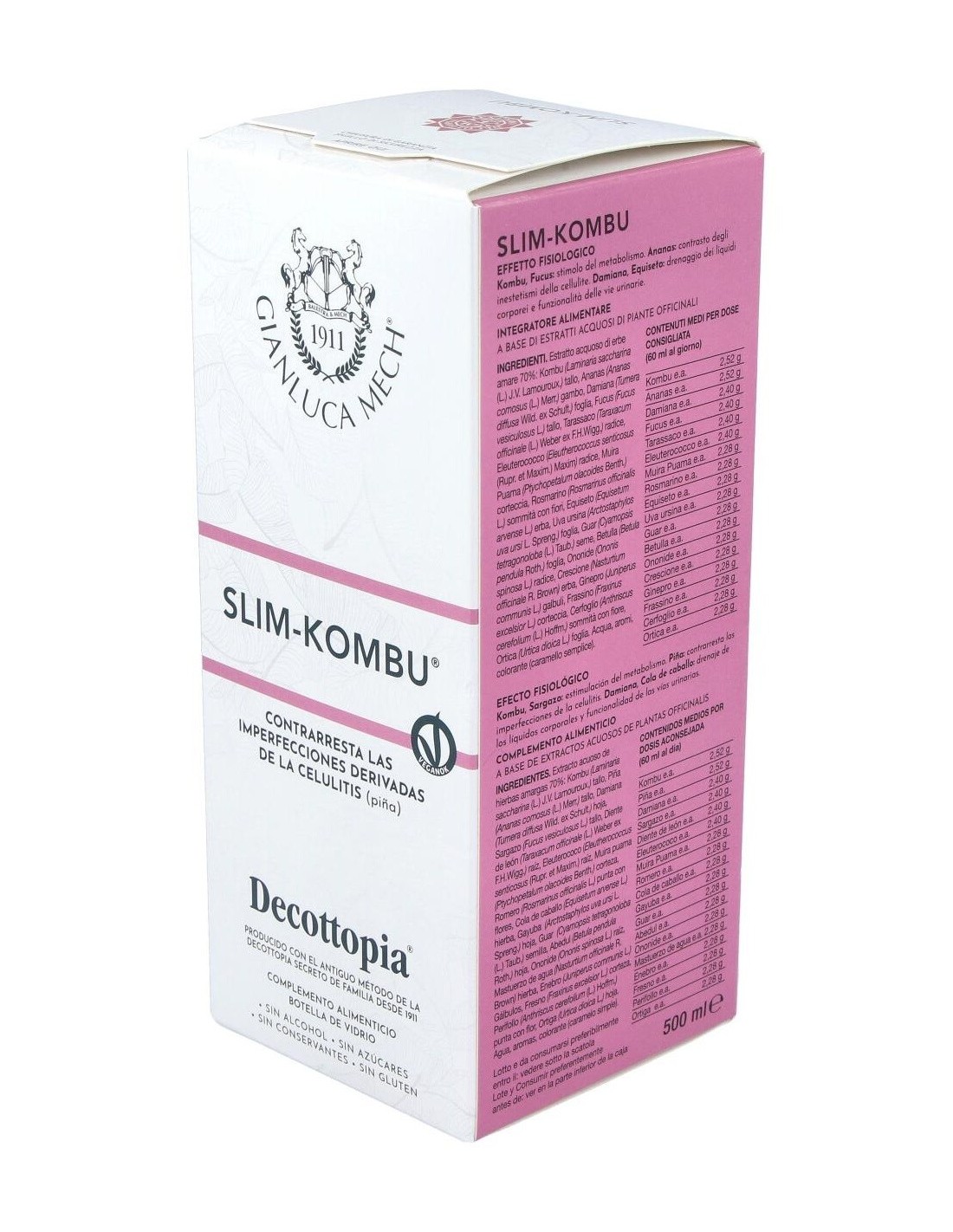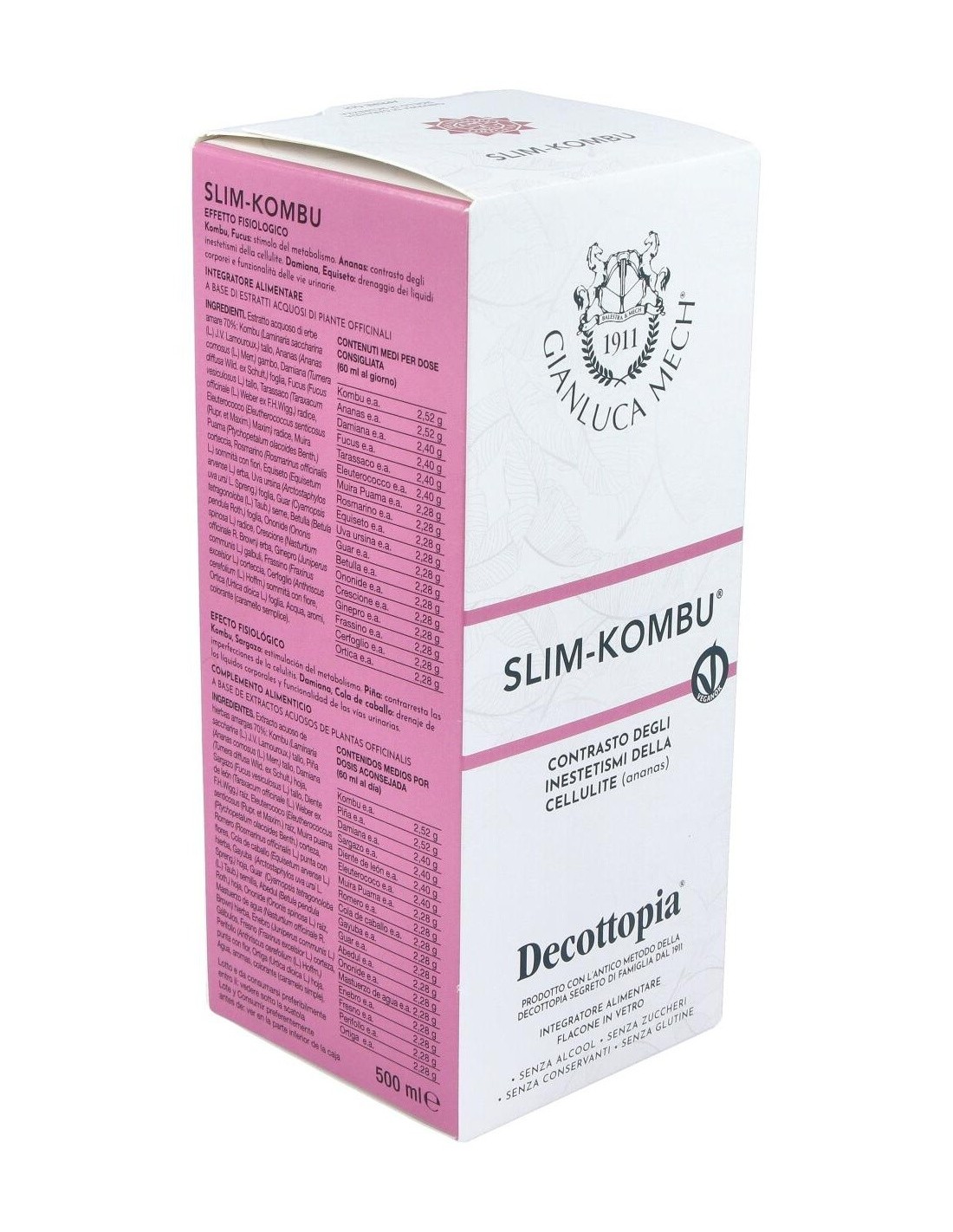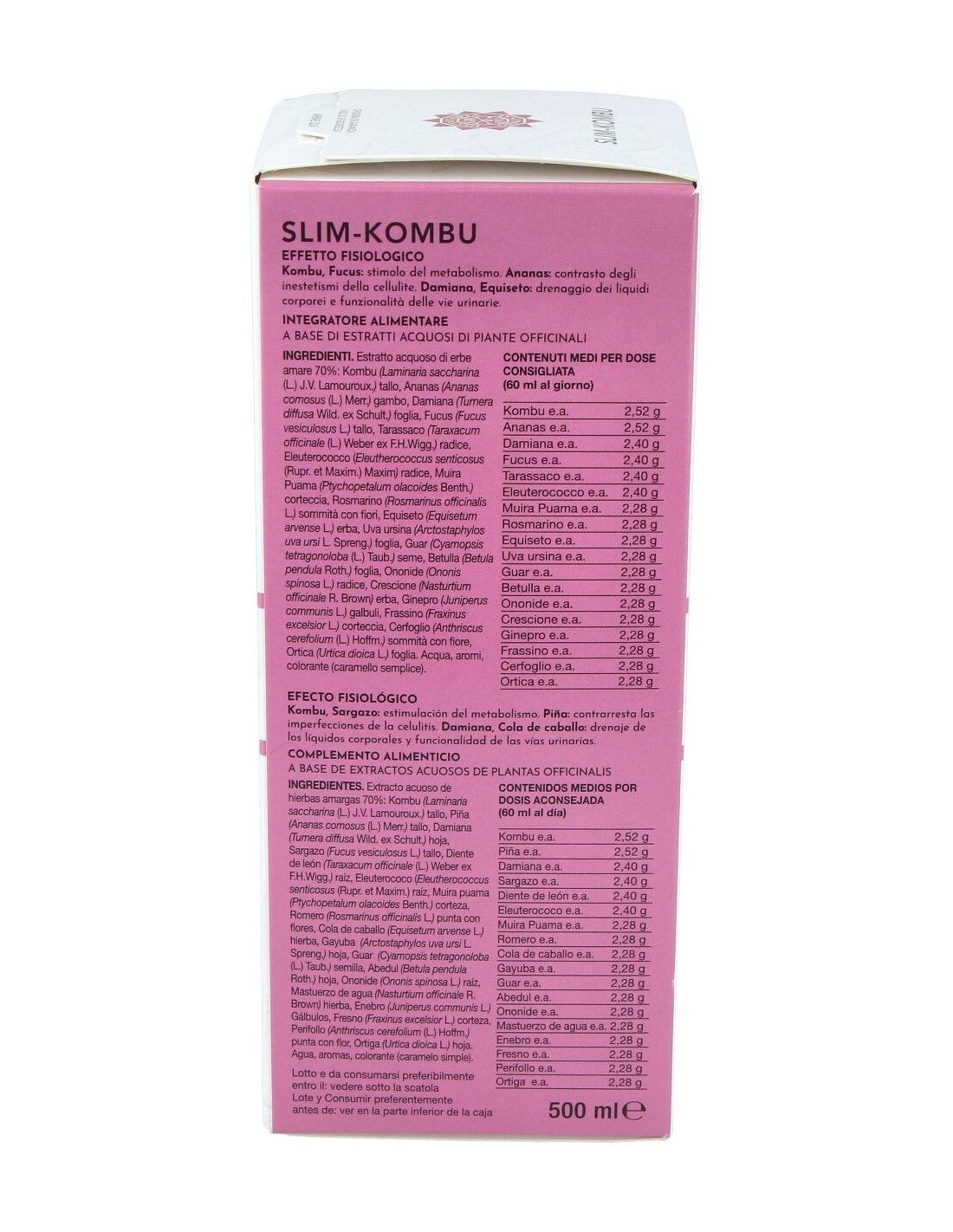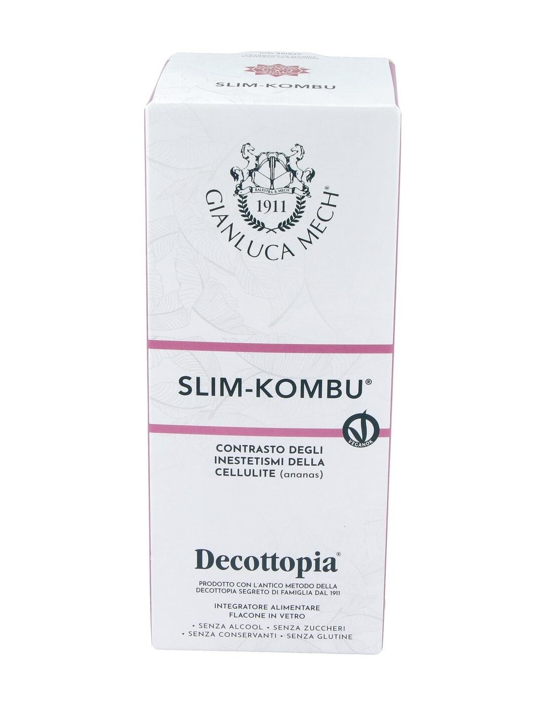 La acción de las algas kombu con la de otras 17 plantas ayuda al cuerpo a restablecer y a mantener el equilibrio de los lípidos, favoreciendo la reducción de las imperfecciones cutáneas típicas de la celulitis. Restablece las funciones del metabolismo basal, ejerce una acción diurética y de adelgazamiento. Slim Kombu (combinando con el extracto Slim Kalormech) constituye la base del tratamiento de mantenimiento post-Tisanoreica. Composición activa por dosis diaria: