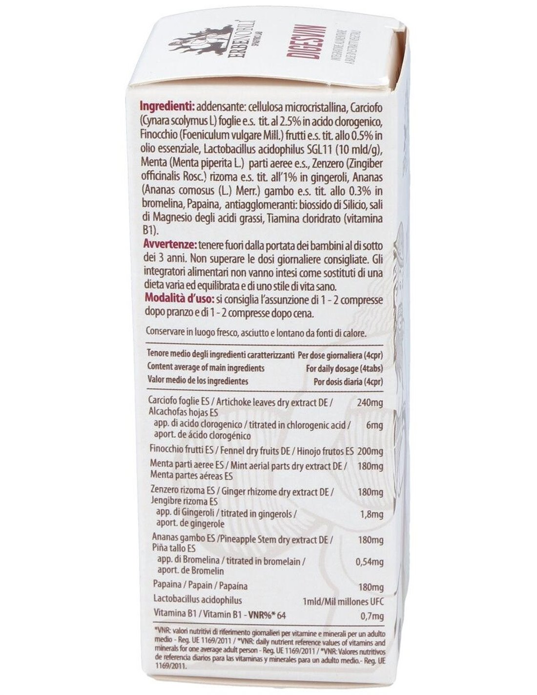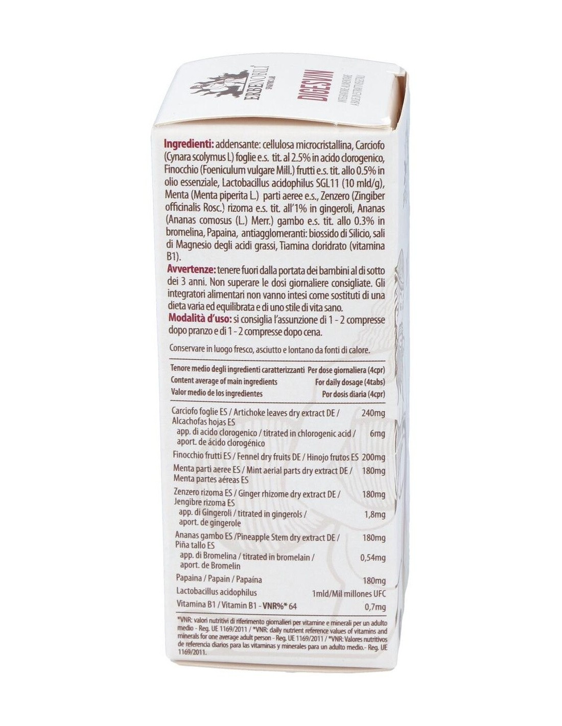 Espesante: celulosa microcristalina, Alcachofa (Cynara scolymus L) hojas e.s. tit. a 2,5% en ácido clorogénico, Hinojo (Foeniculum vulgare Mill.) frutos e.s. tit. 0,5% en aceite esencial, Lactobacillus acidophilus SGL11 (10 mil millones/ g), Menta (Menta piperita L.) partes aéreas e.s., Jengibre (Zingiber officinalis Rosc.) rizoma e.s. tit. 1% en gingeroles, piña (Ananas comosus (L.) Merr.) tallo tit. 0,3% en bromelina, papaína, antiaglomerantes: dióxido de silicio, estearato de magnesio, clorhidrato de tiamina (Vitamina B1).