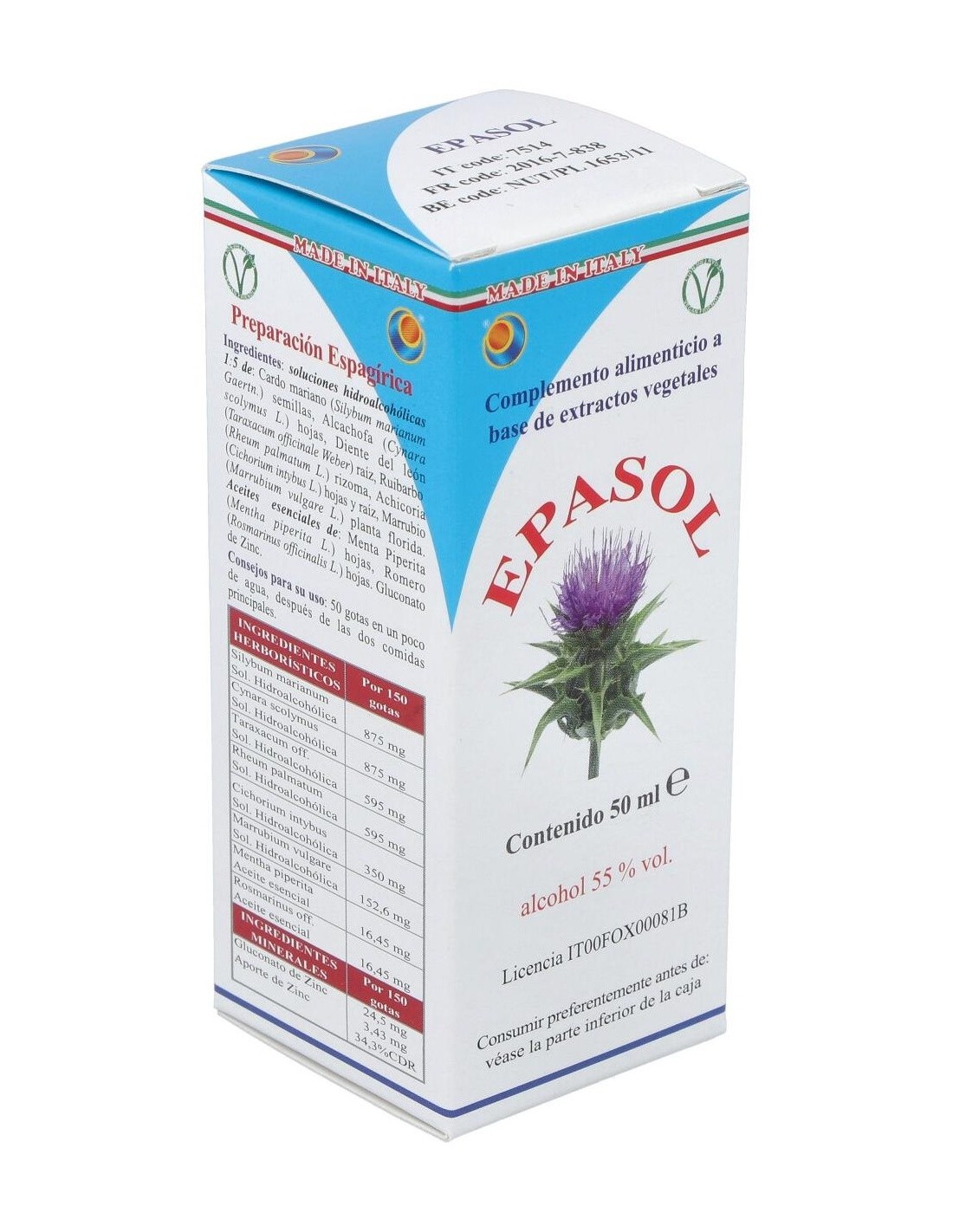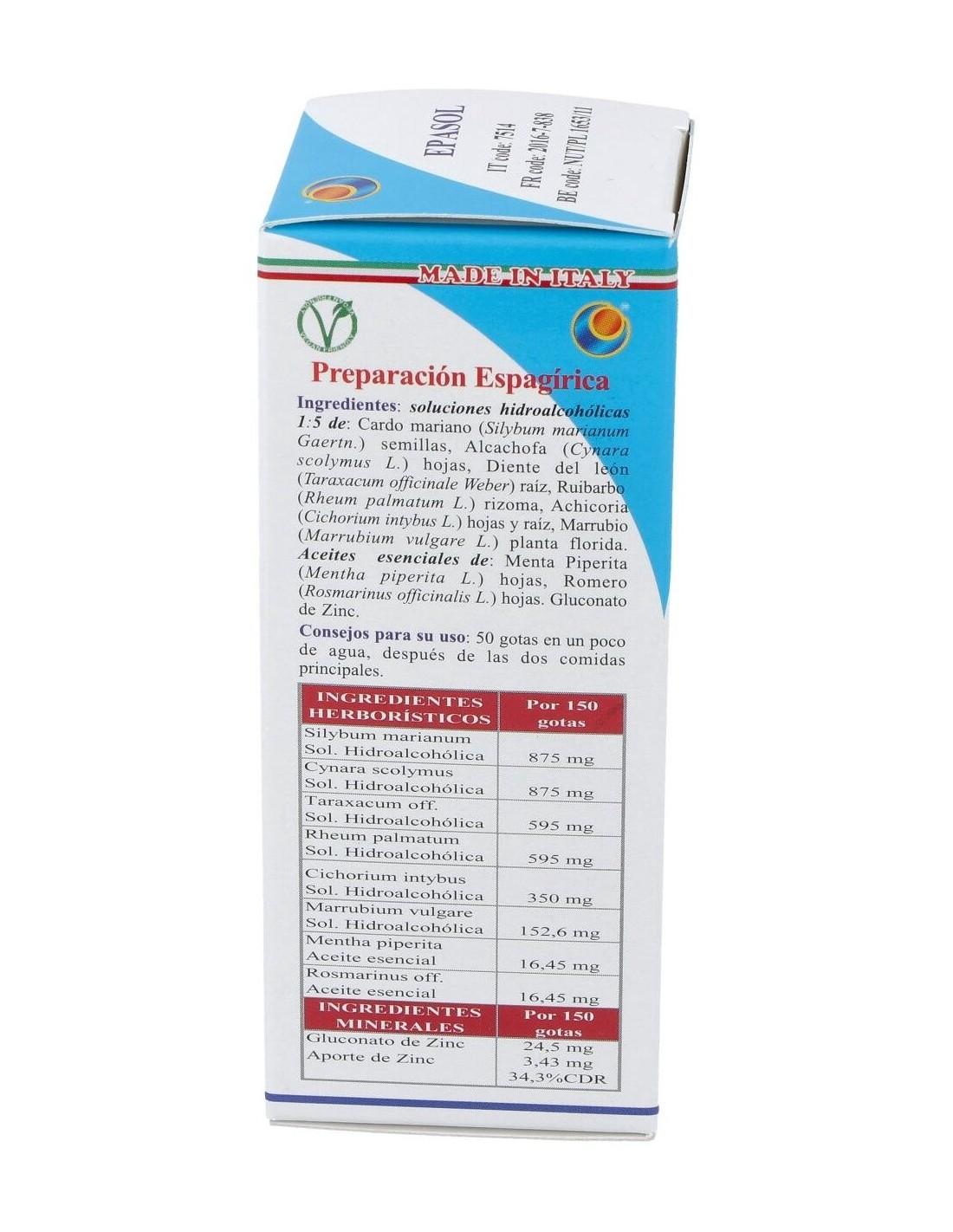 TSA (Tintura Espagírico-Alquímica de Solanimus con R.E. 1/5) de: Cardo mariano (Silybum marianum Gaertn.) semilla 1,3125 g, Alcachofa (Cynara scolymus L.) hojas 1,3125 g, Diente de león (Taraxacum officinale Weber) raíz 892,5 mg, Ruibarbro (Rheum palmatum var. Tagunticum Maxim) rizoma 892,5 mg, Achicoria (Cycorium intybus L.) hojas y raíz 525 mg, Marrubio (Marrubium vulgare L.) planta florecida 228,9 mg. QSPC (QuintaEsencia Espagirica de Paracelso Canónica) de: Menta piperita (Menta piperita L.) hojas 24,675 mg, Romero (Rosmarinus officinalis L.) hojas 24,675 mg. Gluconato de Zinc. (aporte en Zinc 5,145 mg