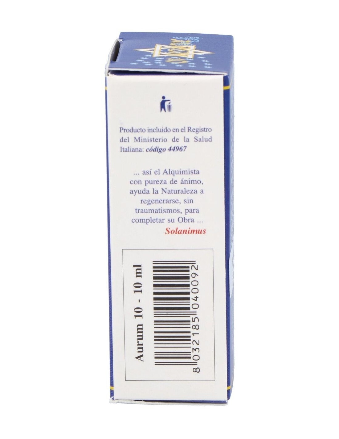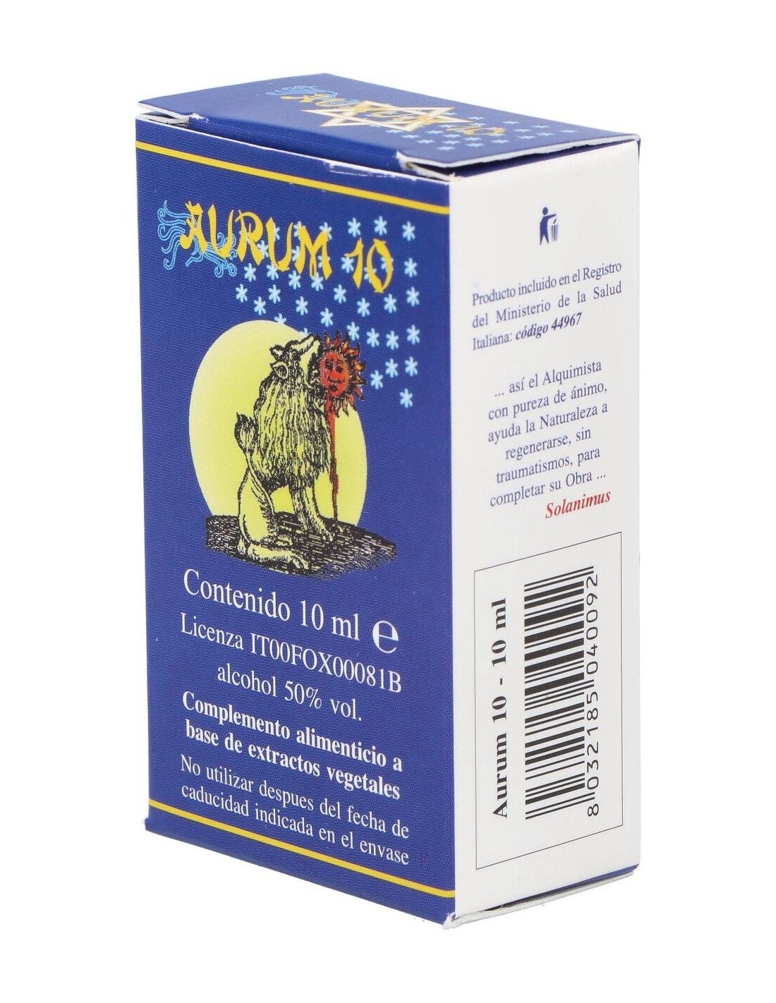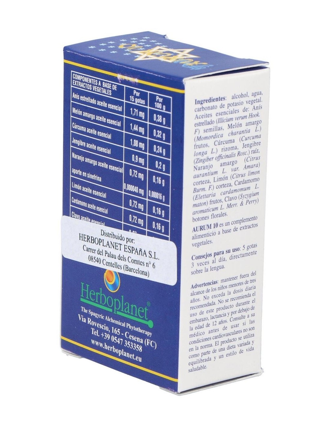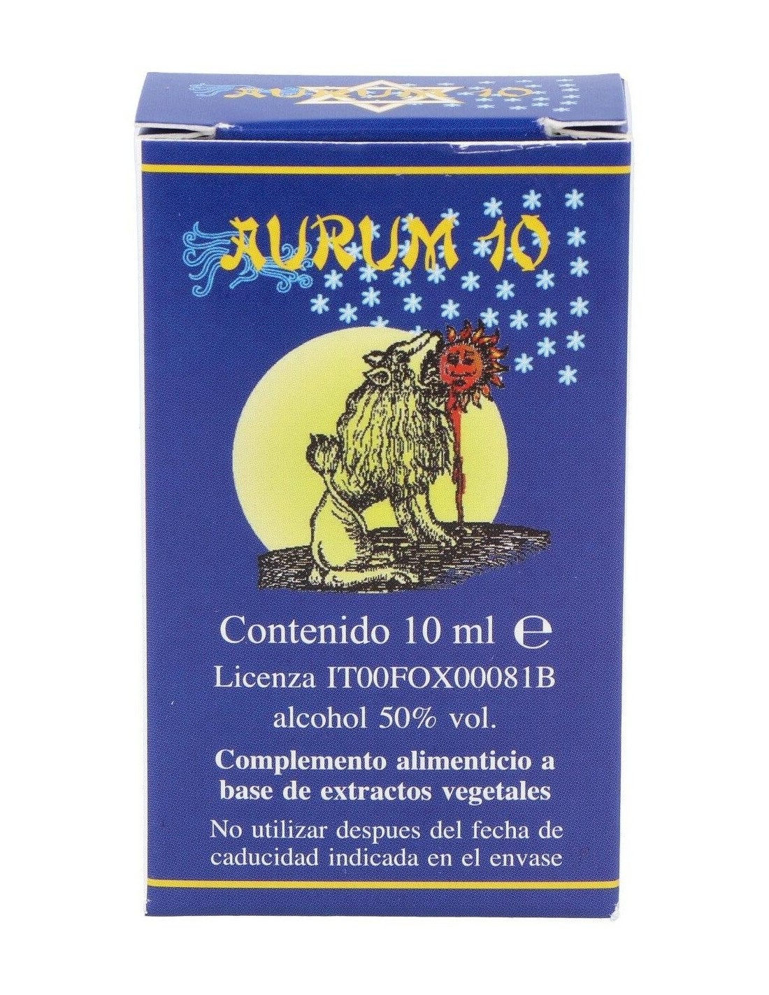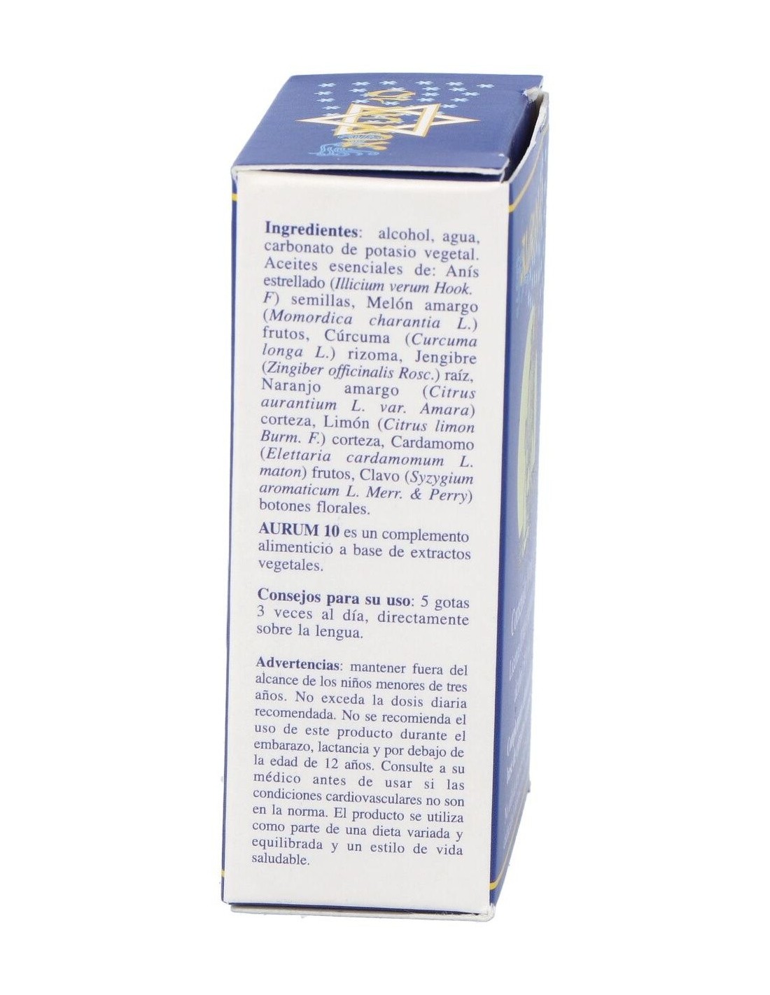 Aurum 10 es un complemento alimenticio a base de extractos vegetales. La centella asiática contribuye a la funcionalidad de la microcirculación (piernas pesadas), a la memoria y funciones cognitivas. El anis estrellado, el cardamomo y el limón contribuyen a la función digestiva, a la regularidad de la motilidad gastrointestinal y a la eliminación de los gases.No podemos olvidar su contribución en la fluidez de las secreciones bronquiales, y en el bienestar de la nariz y la garganta. El jengibre contribuye a la función digestiva, a la regular motilidad gastrointestinal y eliminación de gases. Tiene acción contra las náuseas. Contribuye a la funcionalidad regular del sistema cardiovascular y a la circulación normal de la sangre. Ayuda la funcionalidad articular y contrarresta las perturbaciones del ciclo menstrual.La diferencia que hay entre el Aurum 10 y el Aurum celesta es que el primero está concentrado el doble respecto al segundo en cuanto que el Aurum 10 a sido sometido a una dilución de 1/10, mientras que el Aurum celesta ha sido sometido a una dilución de 1/20.Ingredientes:Alcohol, agua, carbonato de potasio vegetal. Aceites esenciales de: Anís estrellado (Illicium verum Hook. F) semillas, Melón amargo (Momordica charantia L.) frutos, Cúrcuma (Curcuma longa L.) rizoma, Jengibre (Zingiber officinalis Rosc.) raíz, Naranjo amargo (Citrus aurantium L. var. Amara) corteza, Limón (Citrus limon Burm. F.) corteza, Cardamomo (Elettaria cardamomum L. aton) frutos, Clavo (Syzygium aromaticum L. Merr. & Perry) botones florales.Alcohol 50% vol.Modo de empleo:Tomar 5 gotas, 3 veces al día, directamente sobre la lengua.Presentación:Envase de 10 ml.