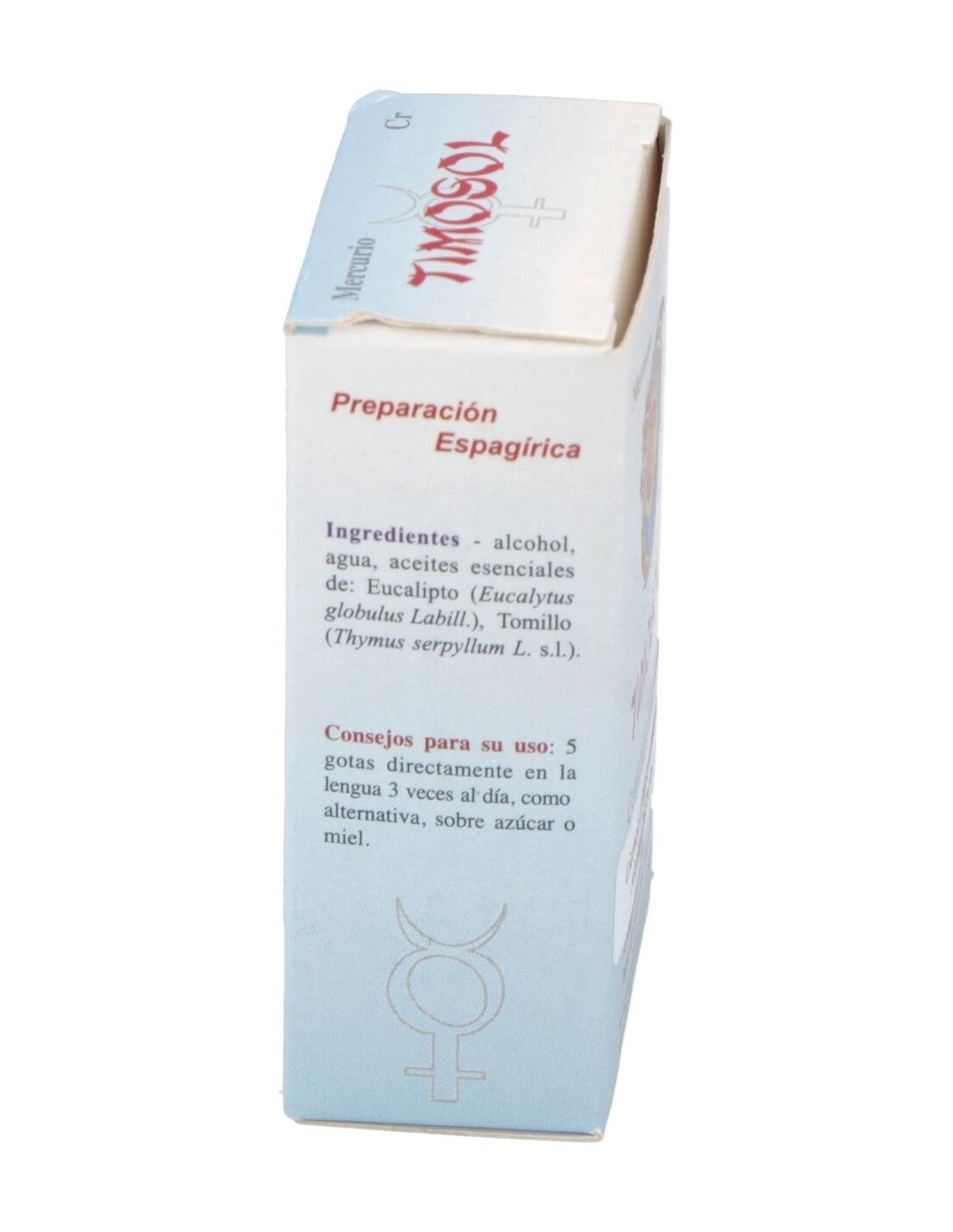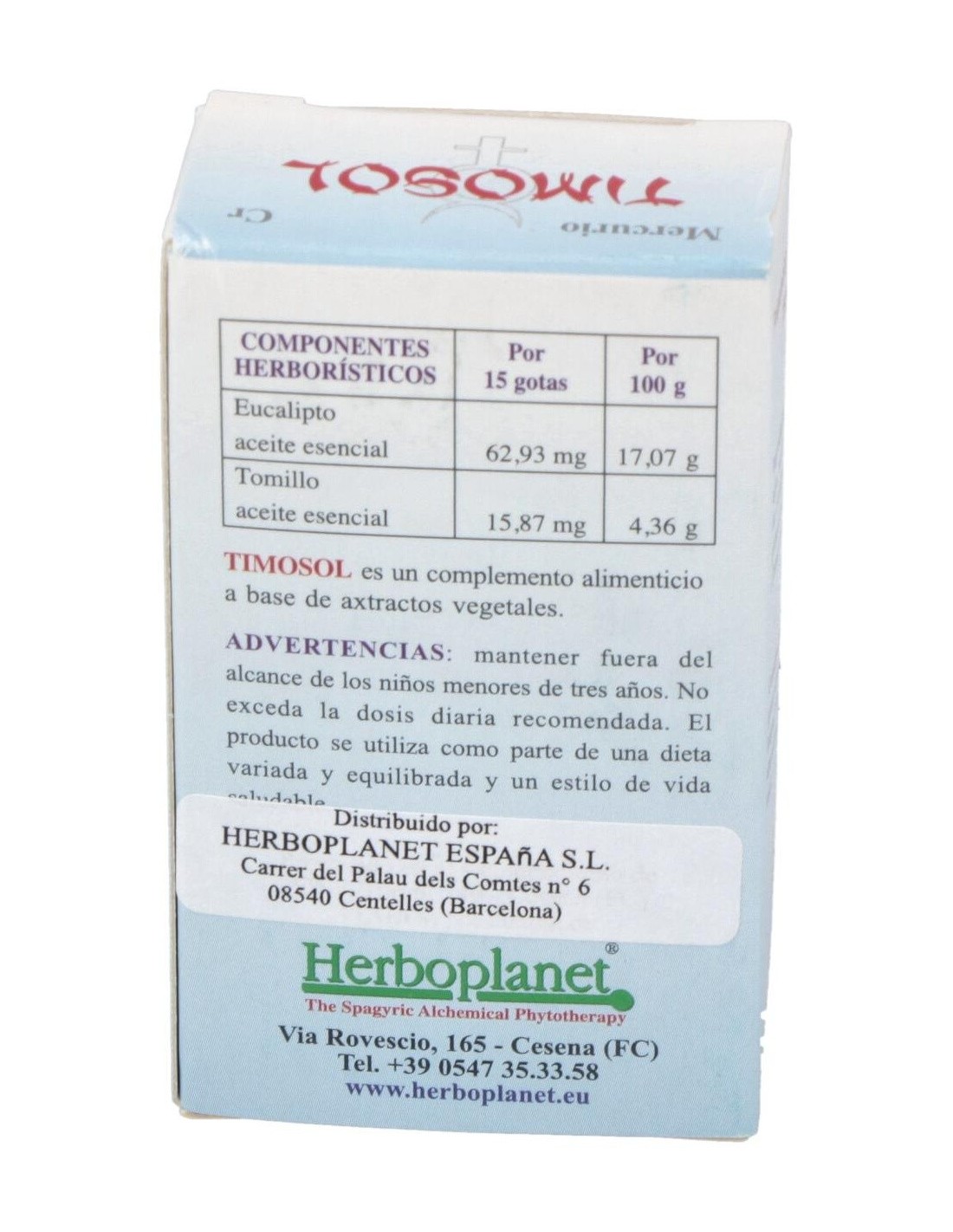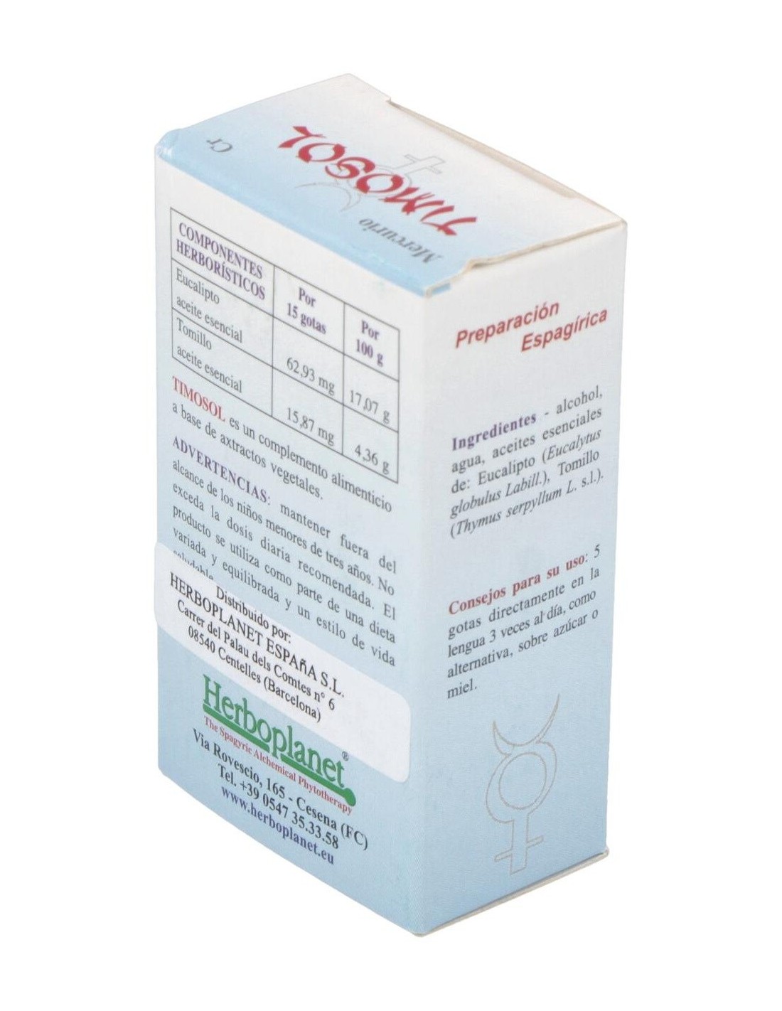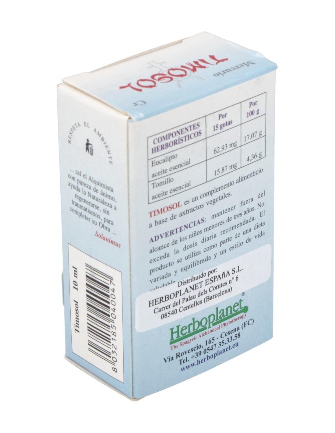 Timosol de Herboplanet se compone de Eucalipto que tiene un efecto balsámico, acción emoliente y calmante sobre la mucosa orofaríngea y contribuye al tono normal de la voz. Y tomillo que contribuye a la fluidez de las secreciones bronquiales y al bienestar de la nariz y la garganta. También tiene acción antioxidante.Ingredientes:Alcohol, aceites esenciales de: Eucalipto (Eucalyptus globulus Labill.) 62,93 mg, tomillo silvestre (Thymus serpillum L. s.l.) 15,87 mg, agua.Modo de empleo:Tomar 5 gotas 3 veces al día directamente sobre la lengua o con un poco de miel.Presentación:Envase de 10 ml.