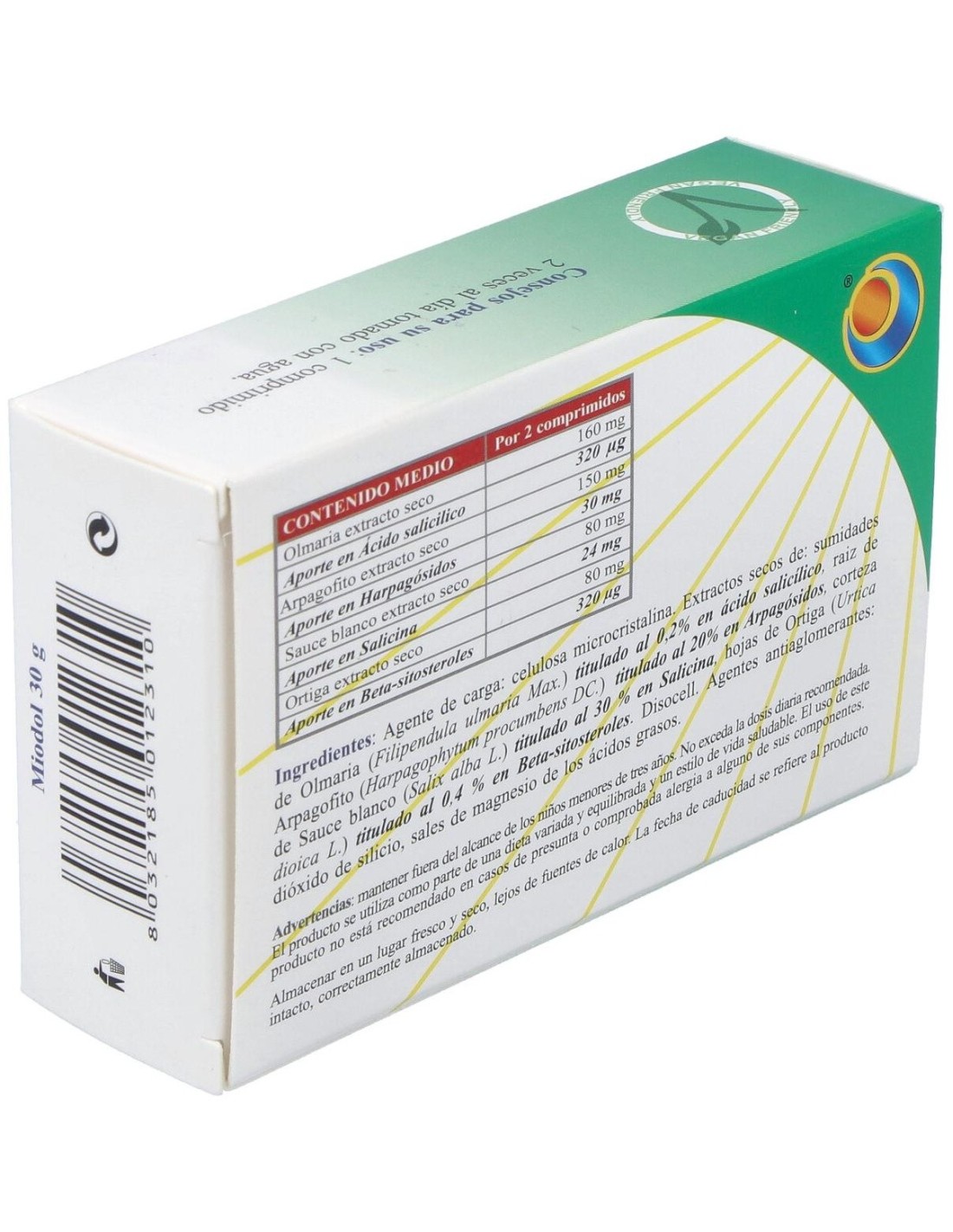 Ingredientes por 2 comprimidos:Agente de carga: celulosa microcristalina. Extracto seco de: sumidades de Olmaria (Filipendula ulmaria Max.) titulado al 0,2% en ácido salicílico 160 mg (aporte en ácido salicílico 320 µg), raiz de Arpagofito (Harpagophytum procumbens DC.) titulado al 20% en Arpagósidos 150 mg (aporte en harpagósido 30 mg), corteza de Sauce blanco (Salix alba L.) titulado al 30 % en Salicina 80 mg (aporte en salicina 24 mg), hojas de Ortiga (Urtica dioica L.) titulado al 0,4 % en Beta-sitosteroles 80 mg (aporte en beta-sitosteroles 320 µg). Disocell. Agentes antiaglomerantes: dióxido de silicio, sales de magnesio de los ácidos grasos.Modo de empleo:Tomar 1 comprimido 2 veces al día después de comer.Presentación:Envase de 60 comprimidos.