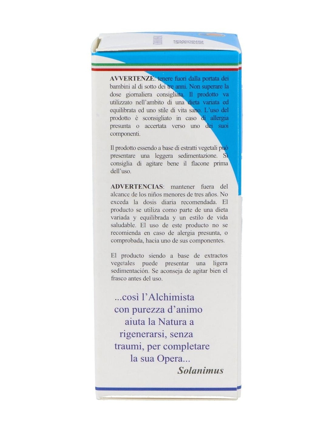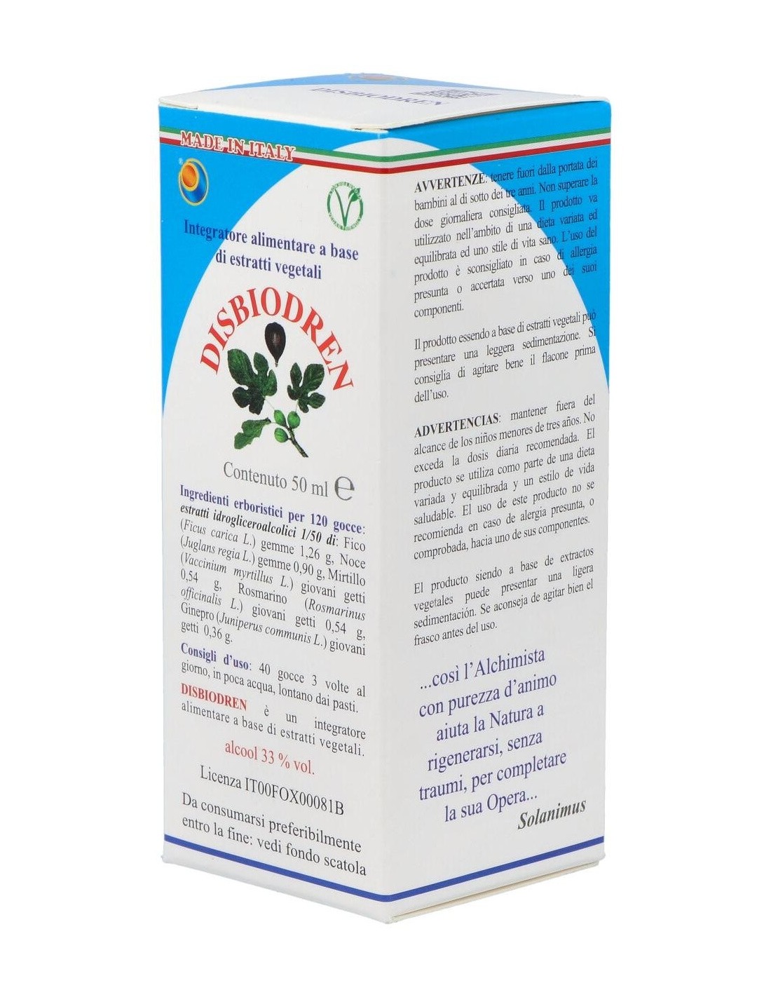 Suplemento dietético a base de soluciones hidrogliceroalcohólicas de yemas de higuera y nogal, brotes jóvenes de arándano, Romero y Enebro. Las soluciones hidrogliceroalcohólicas se han llevado a cabo con el método espagírico alquímico de Solanimus (MSA), que incluye todas las fases de espagiria o espagiria, con la adición final de una fase específica de la filosofía alquímica.
