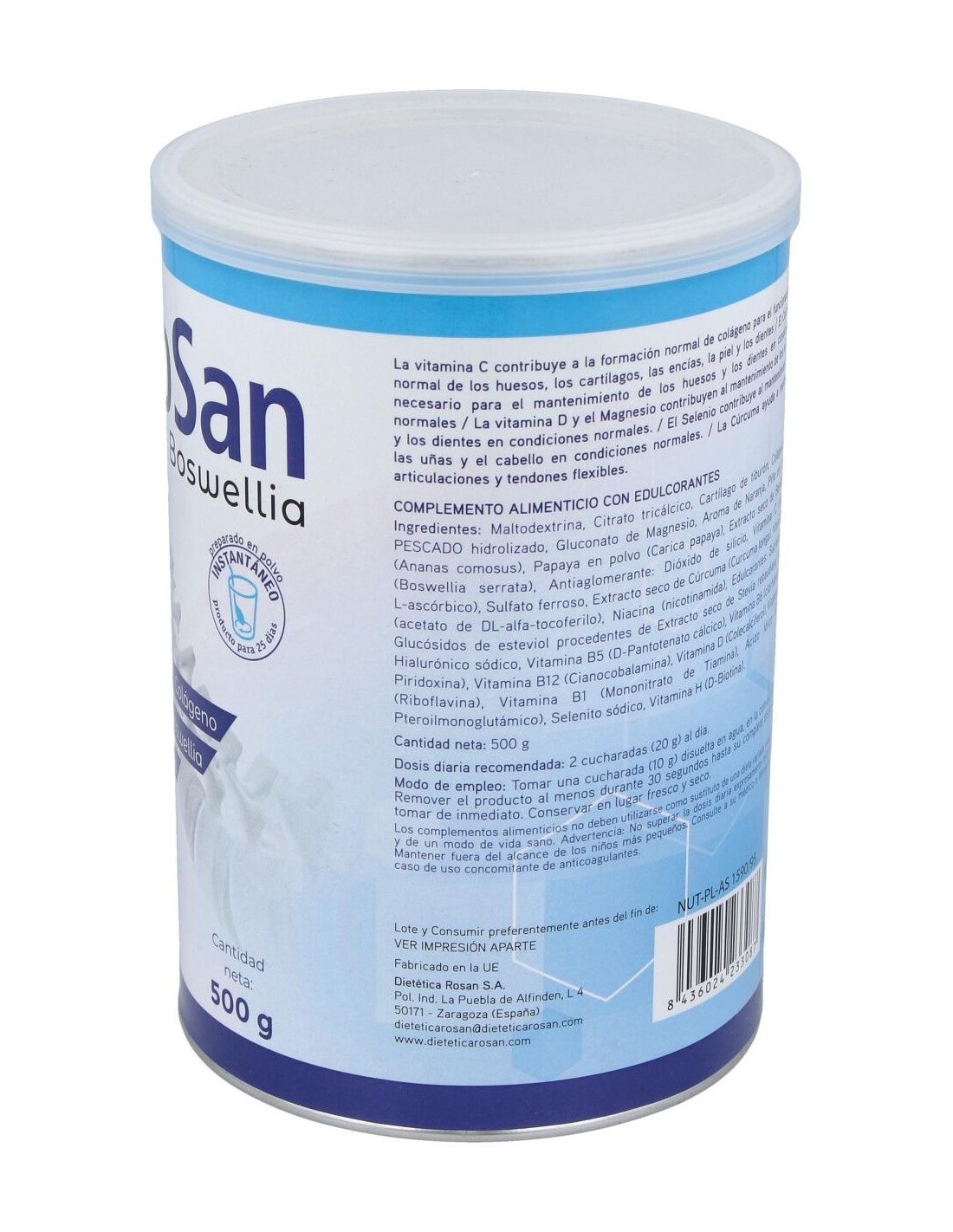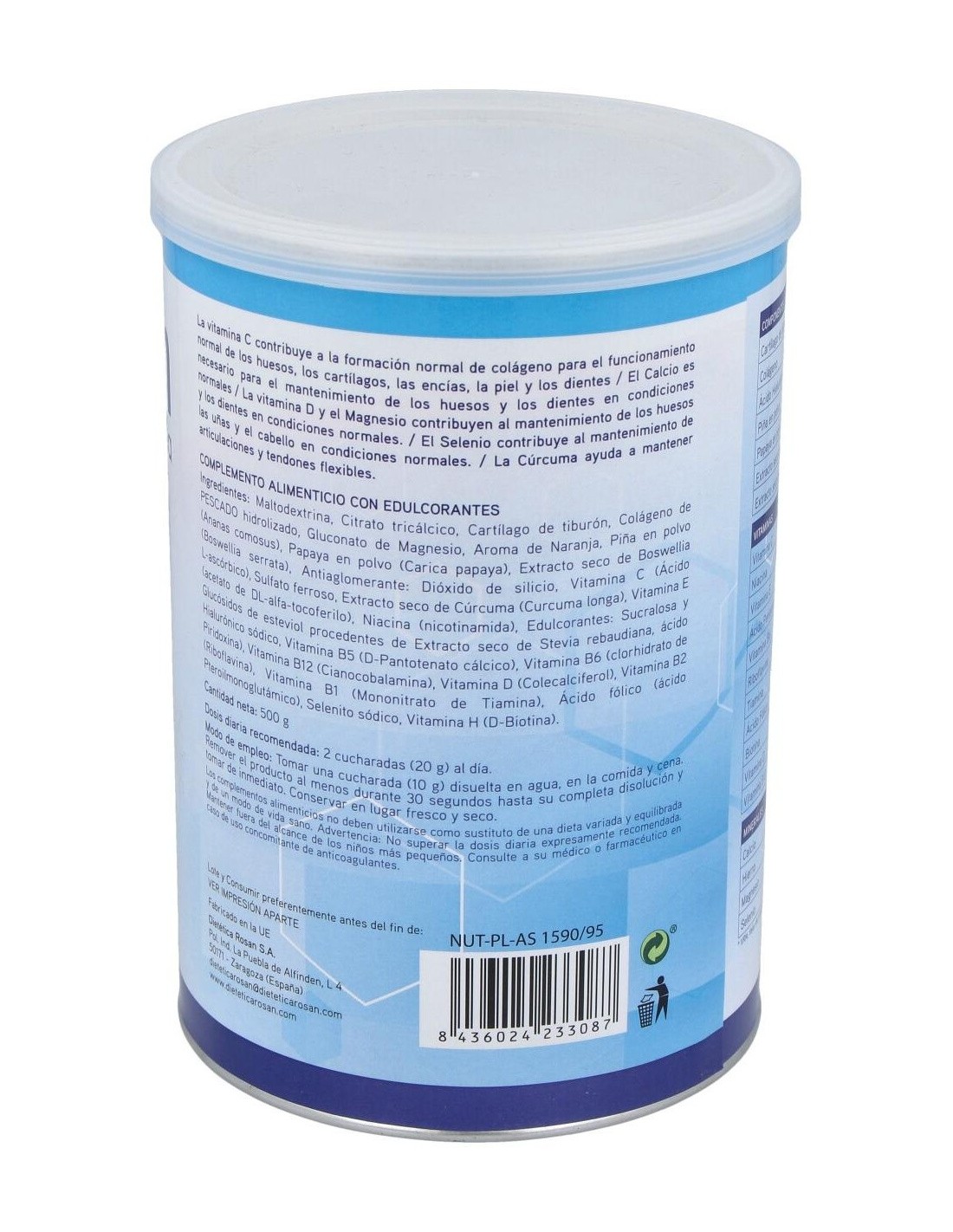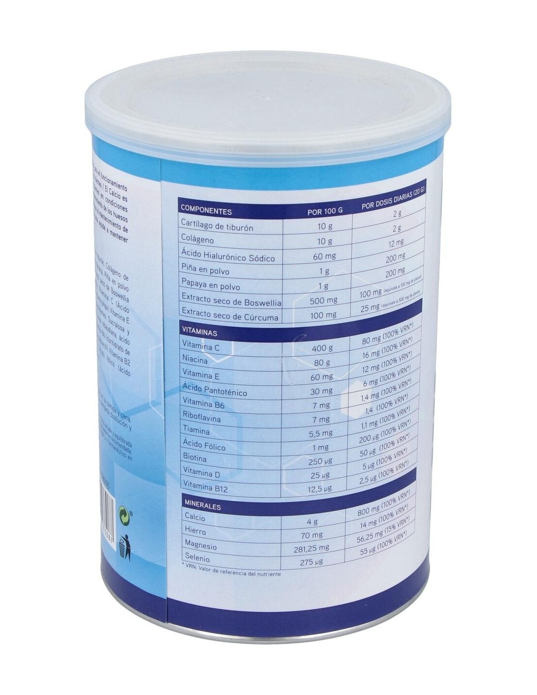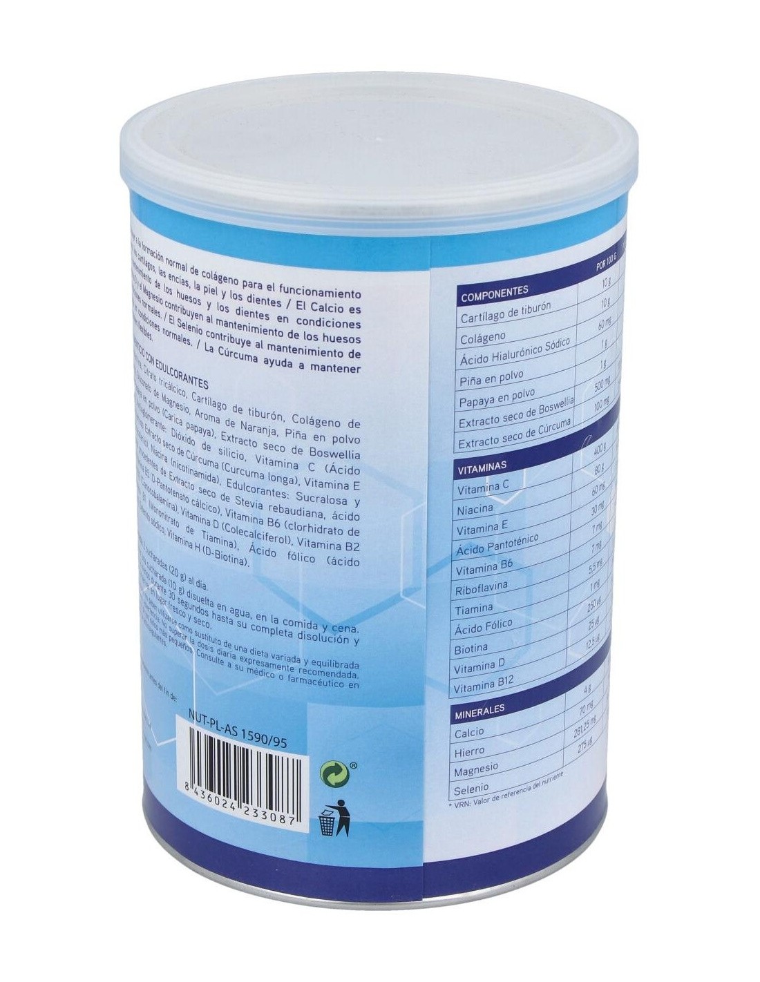 Maltodextrina, Citrato tricálcico, Cartílago de tiburón, Colágeno de pescado hidrolizado, Gluconato de magnesio, Aroma de naranja, Piña en polvo, Papaya en polvo, Extracto seco de boswellia, Dióxido de silicio, Vitamina C, Sulfato ferroso, Extracto seco de cúrcuma, Vitamina E, Vitamina B 3 (Niacina), Edulcorantes: Sucralosa y Glucósidos de esteviol, Vitamina B 5, Vitamina B 6, Vitamina B 12, Vitamina D, Vitamina B 2, Vitamina B 1, Ácido fólico, Selenito sódico, Vitamina H.