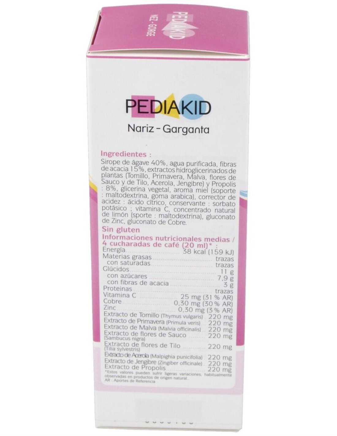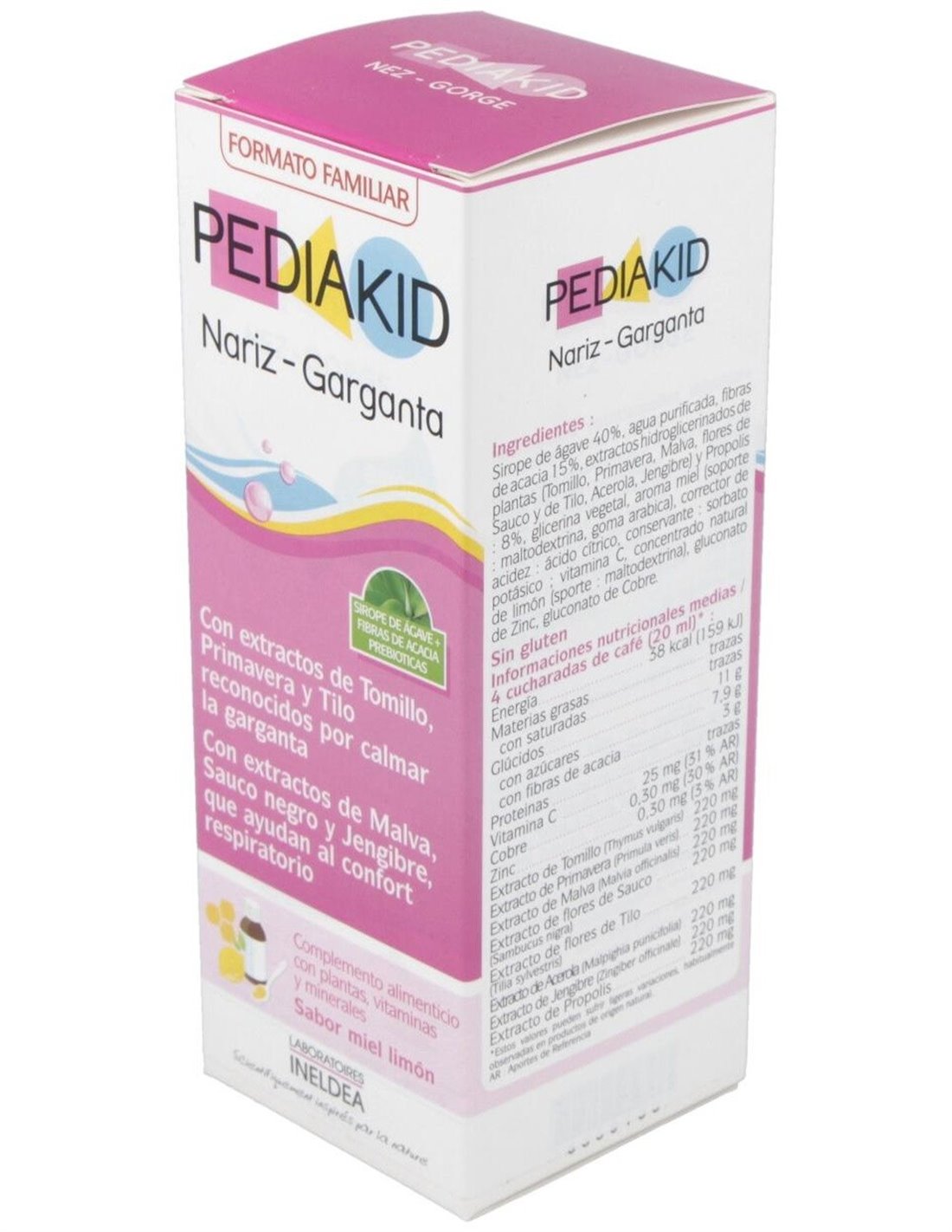 Pediakid® Garganta Nariz utiliza la sinergia de los ingredientes activos naturales más eficaces para luchar contra los resfriados y aliviar el tracto respiratorio (nariz, garganta, pulmones ...), a la primera señal de congestión o irritación.Sus extractos de tomillo y Saúco Negro, son reconocido por su efecto expectorante, que se ven reforzado por La Primavera, Malva, Limón, Acerola, Jengibre, Propóleo, Vitamina C, Cobre y Zinc, que ayudan al cuerpo a combatir. Delicioso sabor a miel y limón concentrado natural.Composición activa por 20 ml: