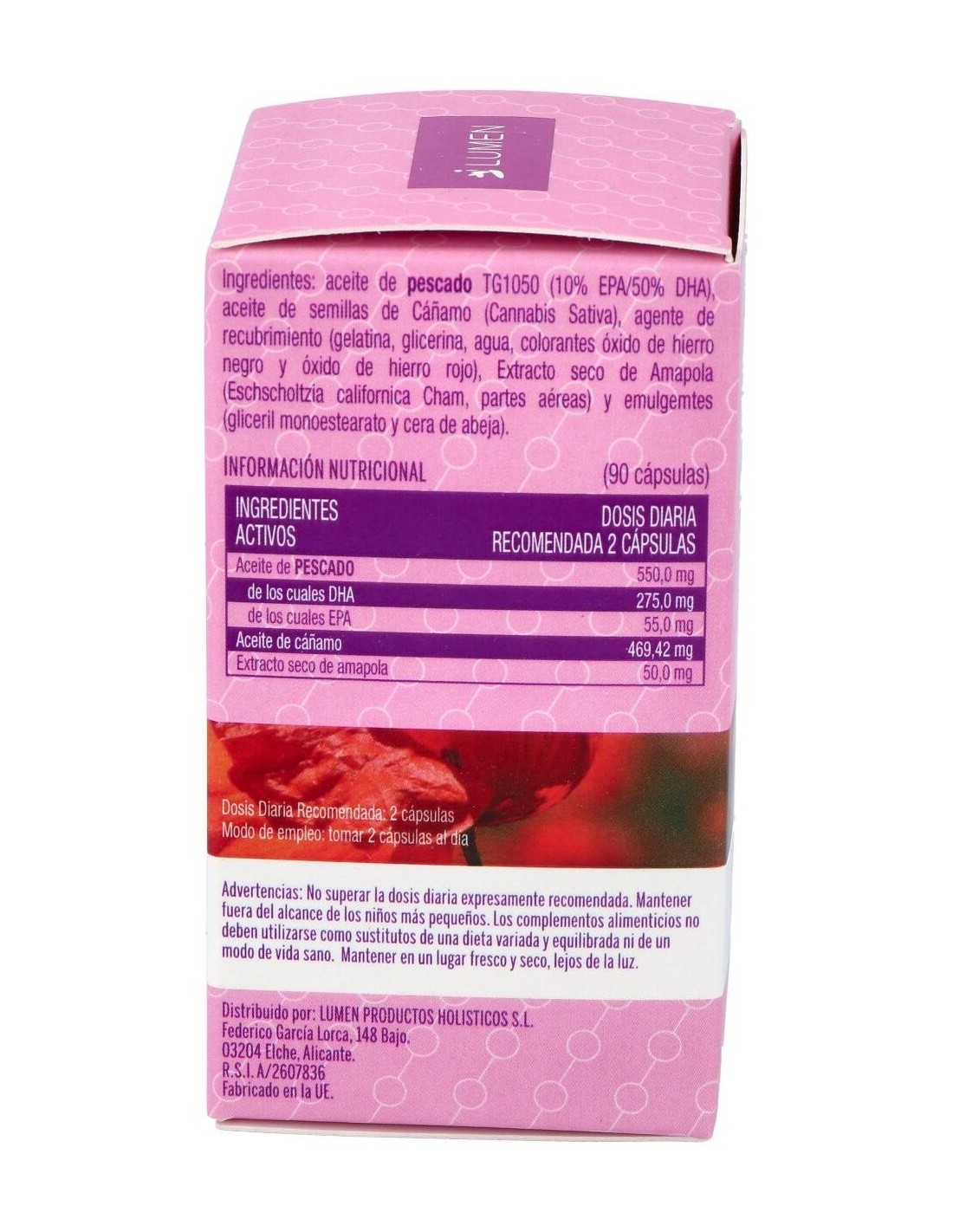 Fórmula a base de aceite de pescado (DHA y EPA), extracto de cáñamo y amapola. Presentada en perlas duras.