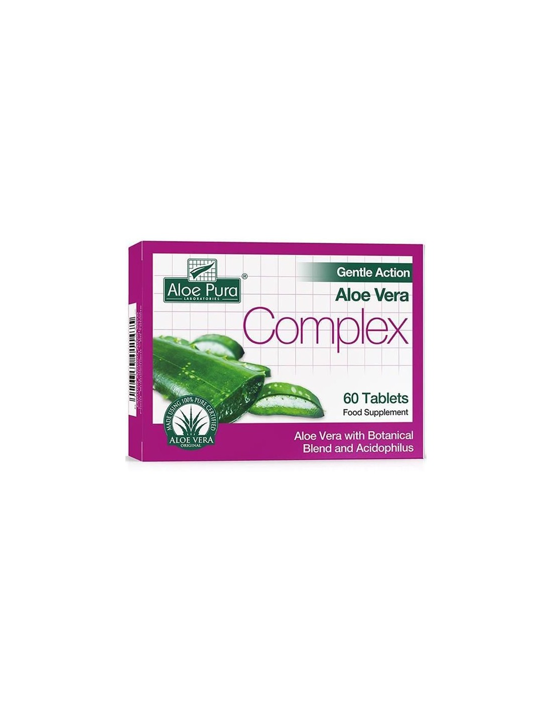 Aloe Vera Complex de Aloe Pura es un complemento alimenticio único que combina aloe vera, lactobacillus acidophilus y otros ingredientes botánicos.Ingredientes:Sorbitol (sorbitol), Magnesium Oxide (oxido de magnesio), Aloe barbaensis, Liquorice (regaliz), Carboxy Methyl Cellulose (carboximetil celulosa), Aniseed/Green Anise (anís verde), Magnesium Salts of Fatty Acids -origen vegetal (sales de magnesio de ácidos grasos de origen vegetal), Silicon Dioxide (dióxido de silício), Coating: Hydroxypropyl Methyl Cellulose (revestimiento: hidroxipropil metilcelulosa), Lactobacilus Acidophilus.Modo de empleo:Tomar 2 tabletas diarias antes de dormir.Presentación:Envase de 60 comprimidos.Recomendaciones y advertencias:Apto para vegetarianos. No contiene aloína, gluten, trigo, edulcorantes, colorantes ni sabores artificiales añadidos.