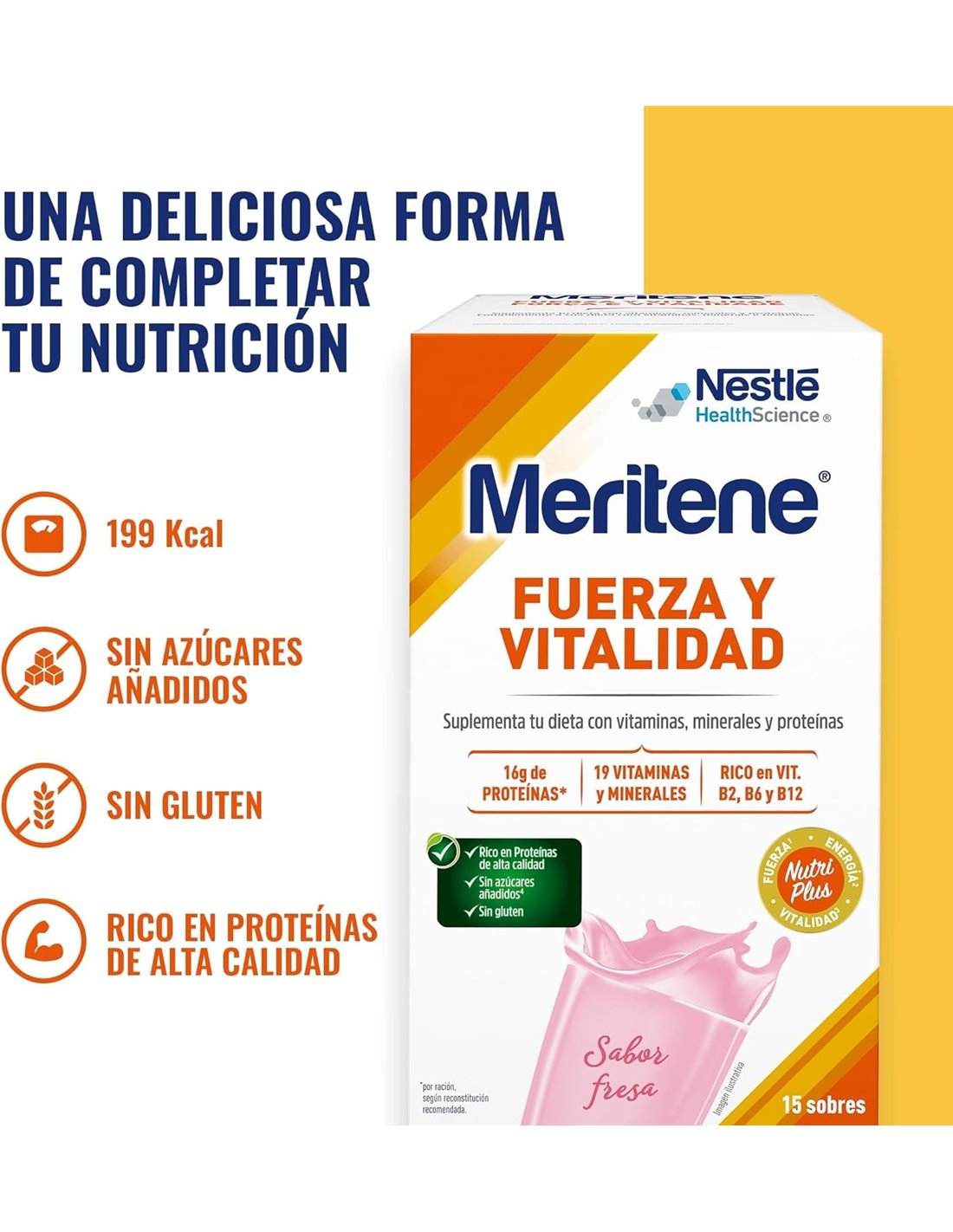 Los batidos de fresa de Meritene presentan un alto contenido de vitaminas, minerales y proteínas, ideales para devolverle a tu cuerpo toda la energía que necesita en su trabajo diario.