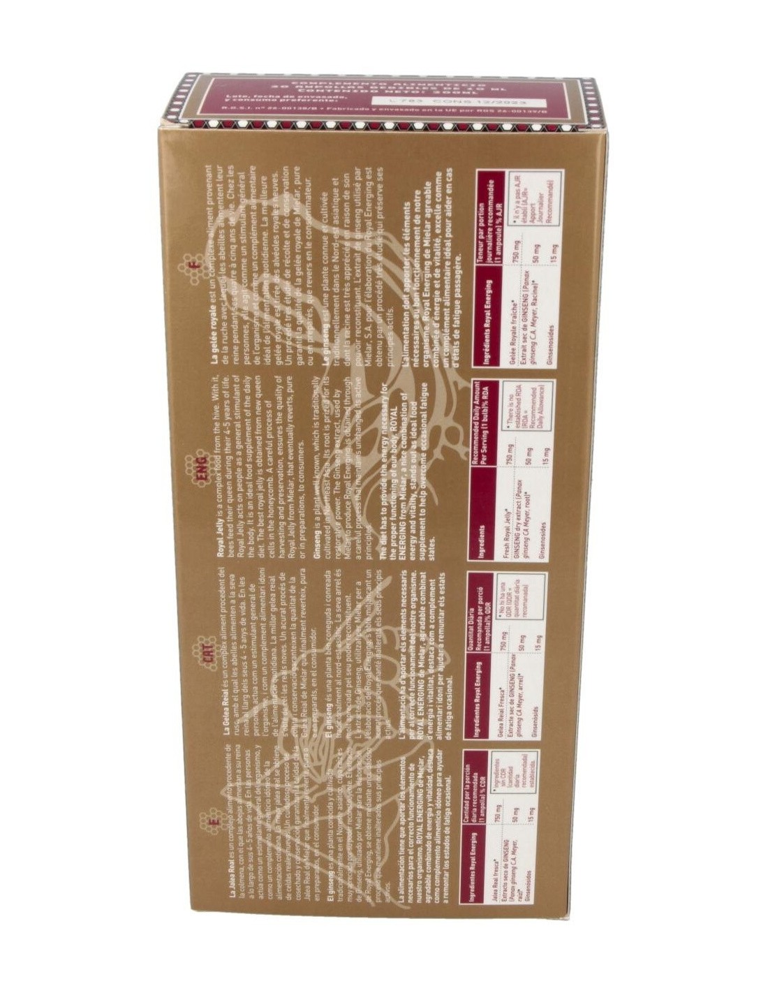 Combina las características de Jalea Real y Ginseng. Es el complemento dietético ideal, un agradable y potente combinado de energía y vitalidad que favorecerá una vida más plena e intensa.