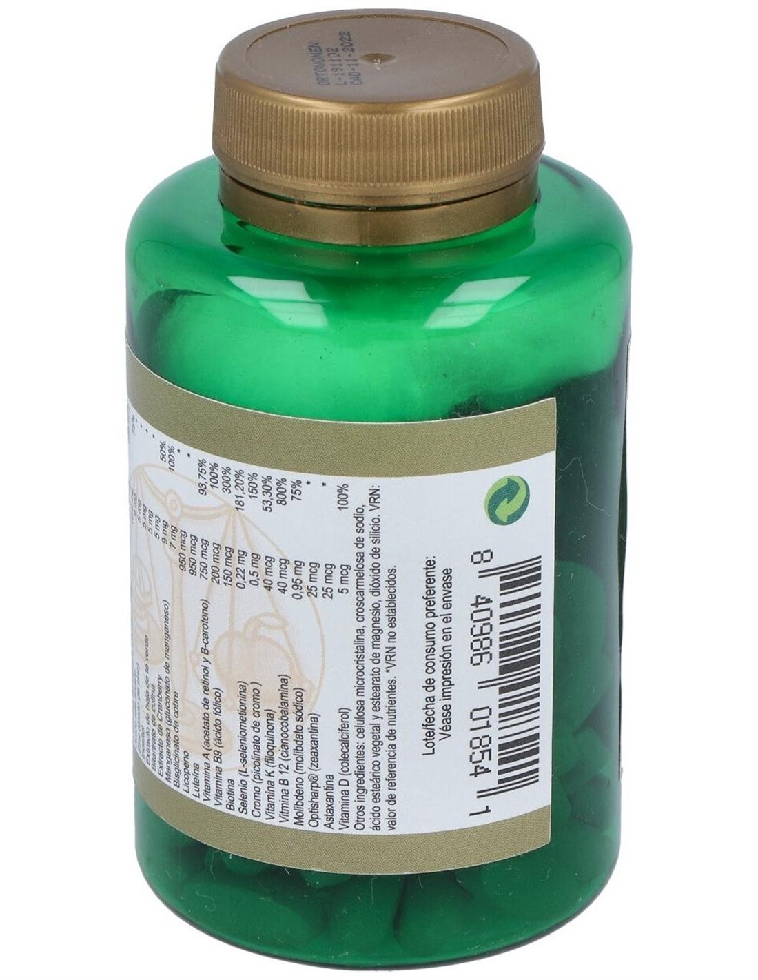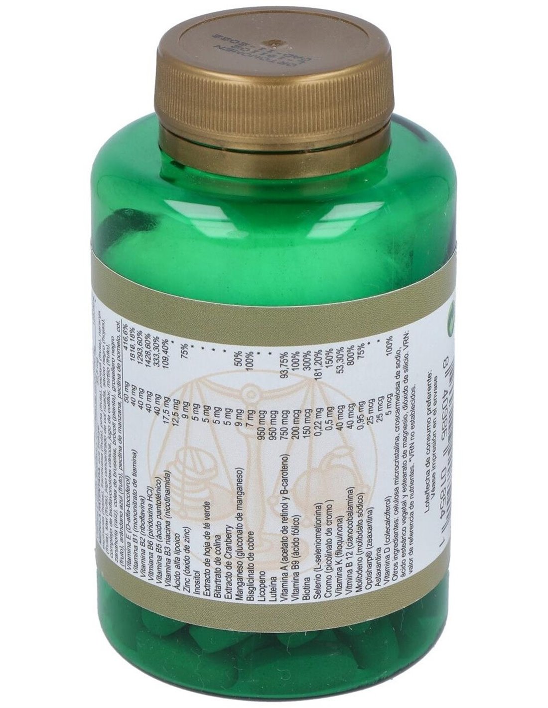 Calcio (carbonato de calcio, fosfato dicálcico y citrato de calcio) ... 250 mg Magnesio (óxido de magnesio) ... 125 mg Vitamina C (ácido ascórbico 50 y ascorbato de calcio) ... 100 mg Mezcla patentada, que incluye: espinacas (hojas), soja (semillas), frambuesa (fruta), piña (fruta), papaya (fruta), naranja (fruta), kiwi (fruta), jugo concentrado de col rizada, saúco negro (hojas), complejo de bioflavonoides cítricos, jugo de coliflor, mirtilo (fruto), zanahoria (raíz), coles de bruselas, brócoli (planta), grosellero negro (fruto), arándano azul (fruto), pectina de manzana, pectina de pomelo ... 52,5 mg Vitamina E (D-alfa-tocoferol) ... 50 mg Vitamina B1 (mononitrato de tiamina) ... 40 mg Vitamina B2 (riboflavina) ... 40 mg Vitmiana B6 (piridoxina HCl) ... 40 mg Vitamina B5 (ácido pantoténico) ... 40 mg Vitamina B3 (niacina (nicotinamida)) ... 17,5 mg Ácido alfa lipoico ... 12,5 mg Zinc (óxido de zinc) ... 7,5 mg Inositol ... 5 mg Extracto de hoja de té verde ... 5 mg Bitartrato de colina ... 5 mg Extracto de Cranberry ... 5 mg Dióxido de silicio ... 2 mg Manganeso (gluconato de manganeso) ... 1 mg Glicinato de cobre ... 1 mg Licopeno ... 950 mcg Luteína ... 950 mcg Vitamina A (acetato de retinol y B-caroteno) ... 750 mcg Vitamina B9 (ácido fólico) ... 200 mcg Biotina ... 150 mcg Selenio (L-seleniometionina) ... 100 mcg Cromo (picolinato de cromo ) ... 60 mcg Vitamina K (filoquinona) ... 40 mcg Vitmina B 12 (cianocobalamina) ... 40 mcg Molibdeno (molibdato sódico) .... 37,5 mcg Optisharp® (zeaxantina) ... 25 mcg Astaxantina ... 25 mcg Vitamina D (colecalciferol) ... 5 mcg Aditivos con función tecnológica: celulosa microcristalina, croscarmelosa de sodio, ácido esteárico vegetal y estearato de magnesio.