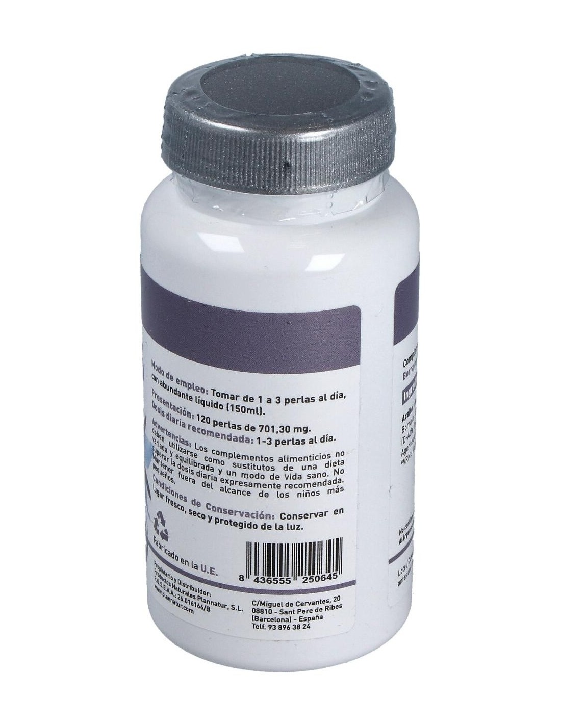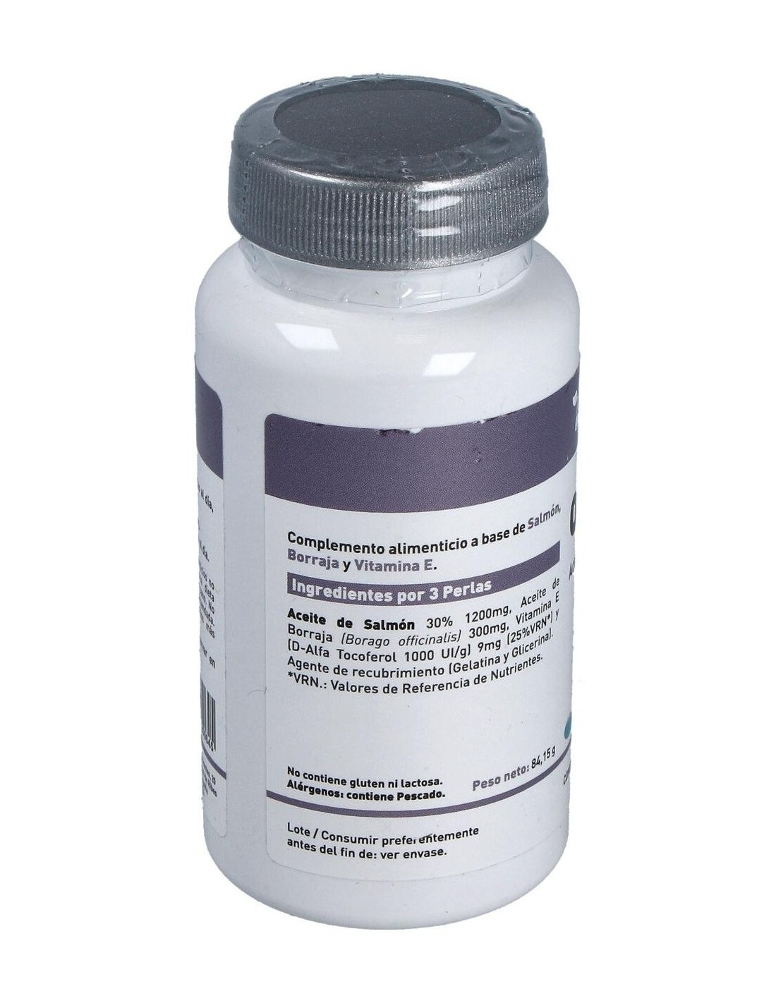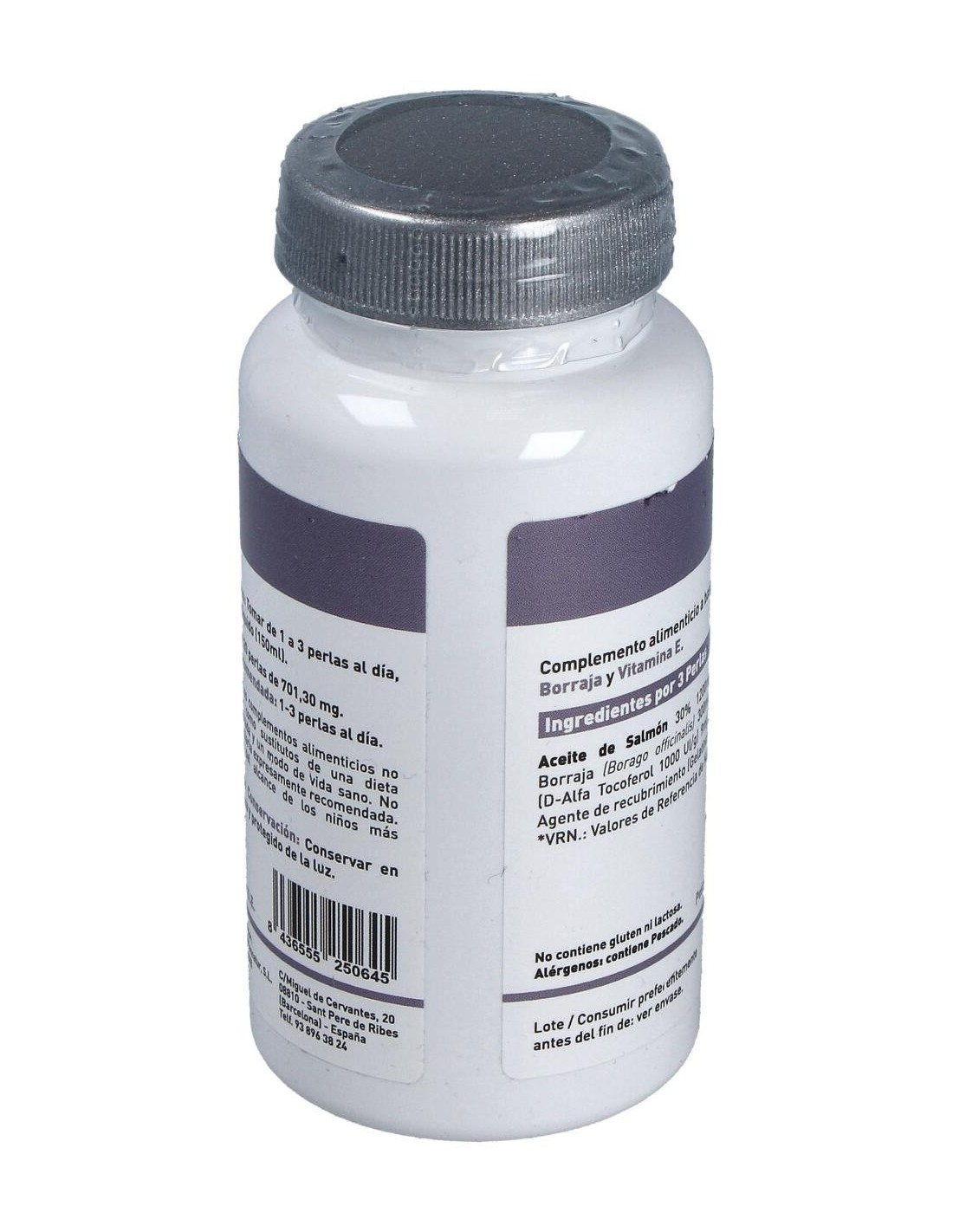 Aceite de Pescado Salvaje 30%, Aceite de Borraja, Vitamina E Natural (D-Alfa Tocoferol 1000UI/g), Gelatina y Humectante: Agua purificada (Glicerina)