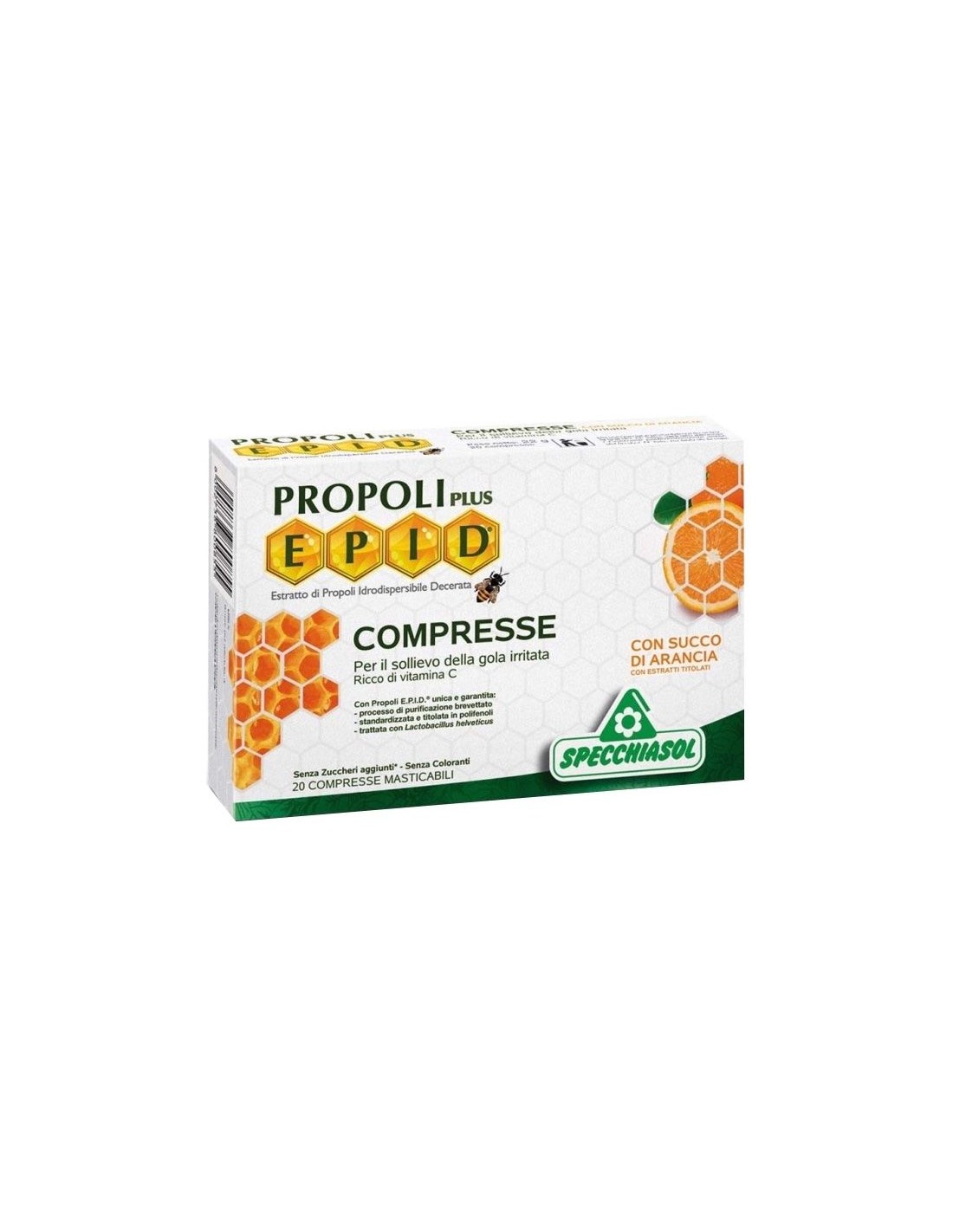 Epid Propoli Plus son comprimidos para disolver en la boca con un agradable sabor natural a naranja. Por su contenido en propolis y extractos vegetales de reconocida eficacia son de gran utilidad para el alivio de las irritaciones y bienestar de la garganta.El propóleo es un producto producido por las abejas en las colmenas, constituido por resinas, bálsamos, gomas vegetales, ceras y otras sustancias. Specchiasol ha desarrollado un método exclusivo y patentado de extracción de los principios activos del propóleo llamado método E.P.I.D.® (extracto de propóleo hidrodispersable sin cera), obteniéndose un propóleo único por su procedimiento de purificación patentado, por estar estandardizado y titulado en polifenoles (alta potencia certificada) y por ser sometido a tratamiento con Lactobacillus Helveticus. La extracción selectiva en frío y con solventes naturales dan lugar a un extracto purificado sin ceras y sin otras sustancias contaminantes, que conserva todos los principios activos del propóleo, que lo convierte en un própoleo altamente biodisponible y ausente de las sustancias que pueden ser causantes de reacciones alérgicas al propolis.Composición activa por 4 comprimidos: