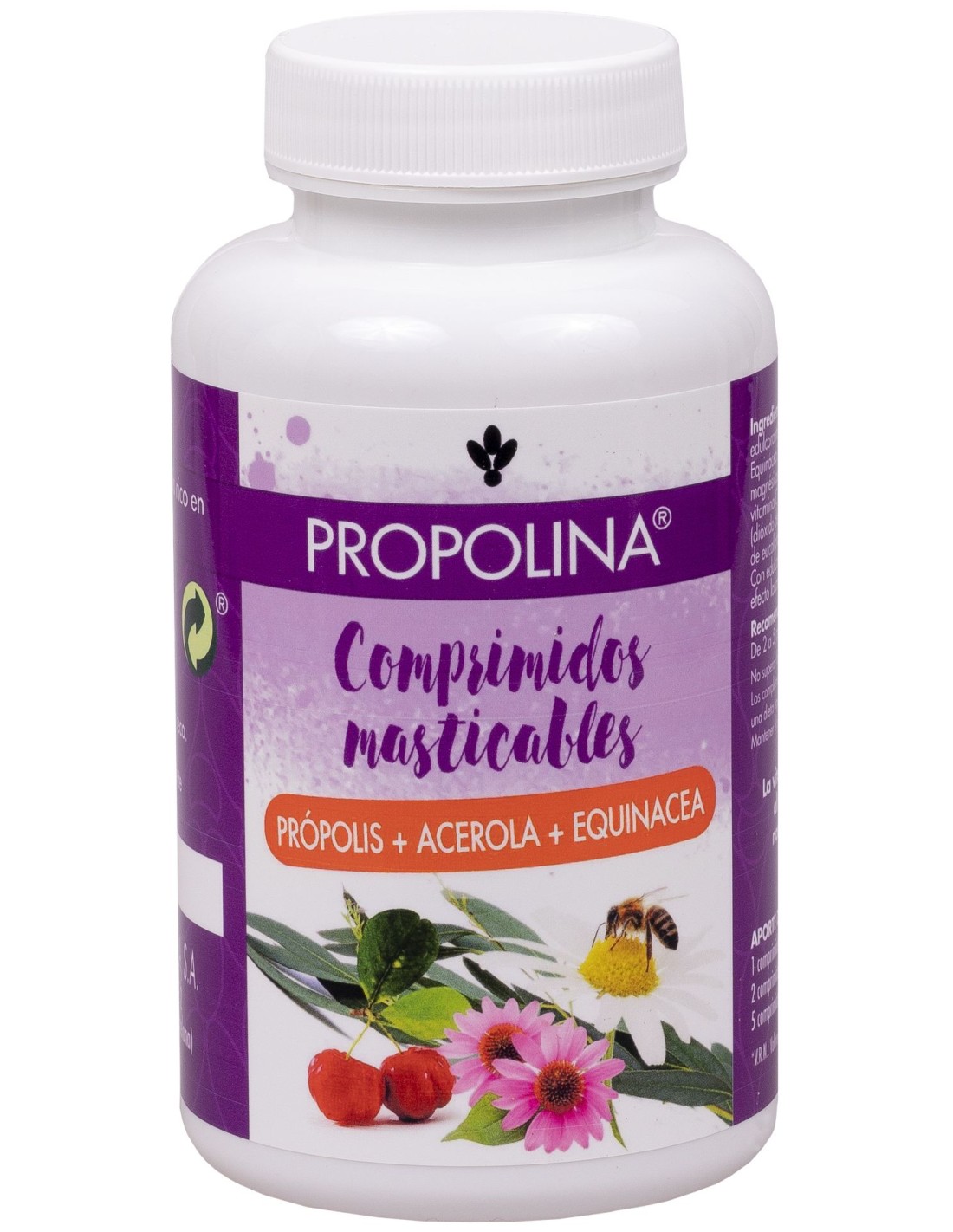 Ingredientes:Edulcorante (sorbitol), extracto de propolis, extracto de Equinácea (Equinacea purpurea, raíz), emulgente (sales magnésicas de ácidos grasos), extracto de acerola rico en vitamina C (Malpighia Punicifolia, fruto), antiaglomerante (dióxido de silicio), aceites esenciales de naranja, limón y de eucalipto, edulcorante (acesulfamo potásico).Modo de empleo:Tomar de de 2 a 5 comprimidos al día.Presentación:Envase de 75 comprimidos masticables.Recomendaciones y advertencias:Un consumo excesivo puede provocar un efecto laxante.