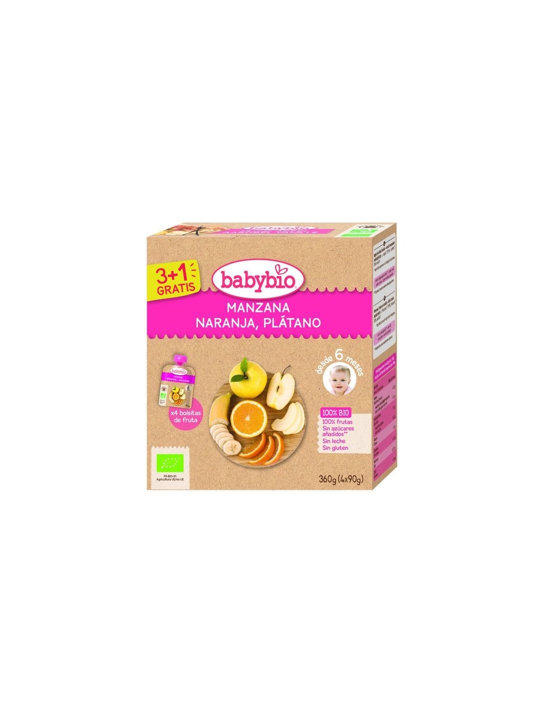Pack 4x Pouche manzana Naranja y Plátano elaborado 100% con frutas biológicas.