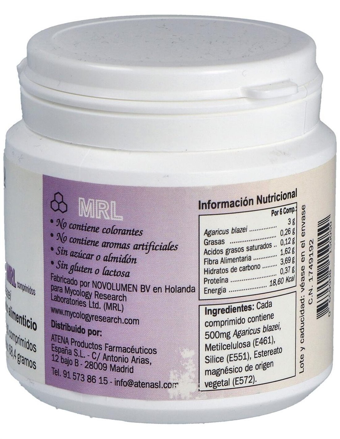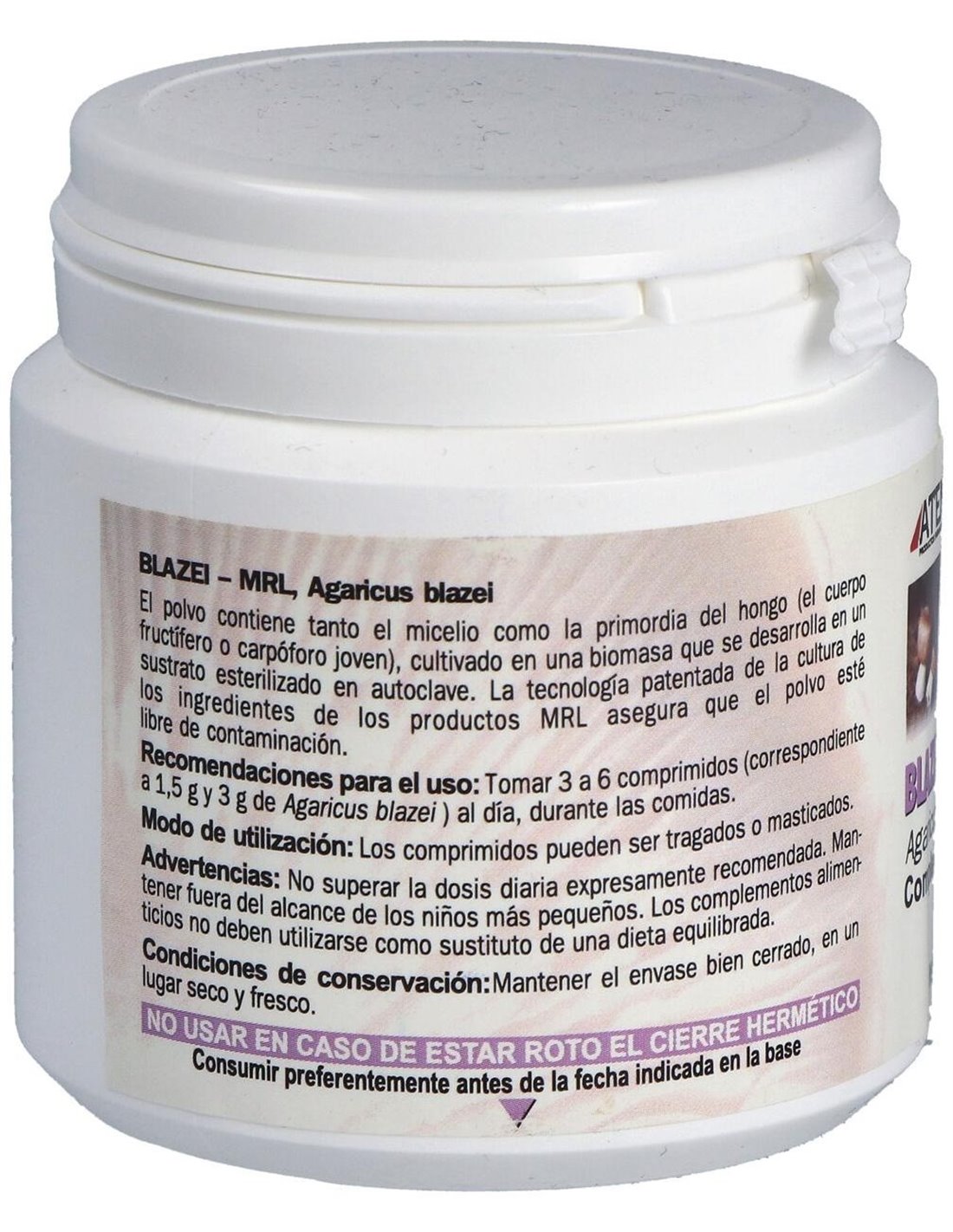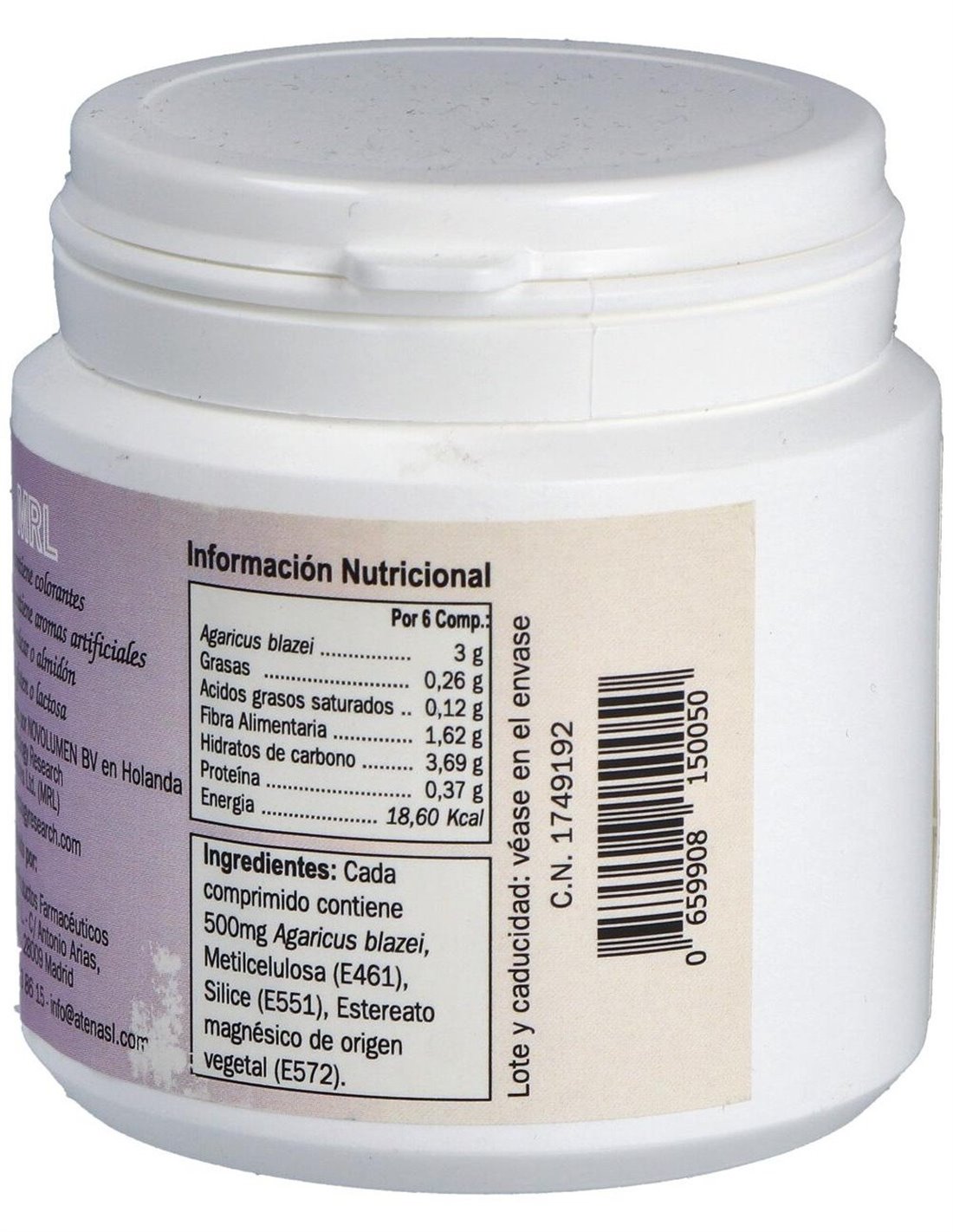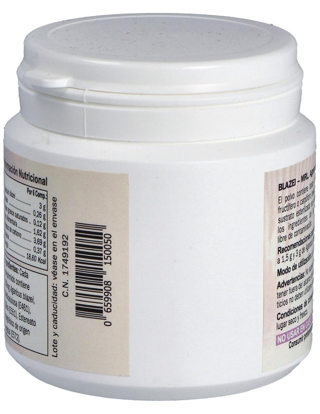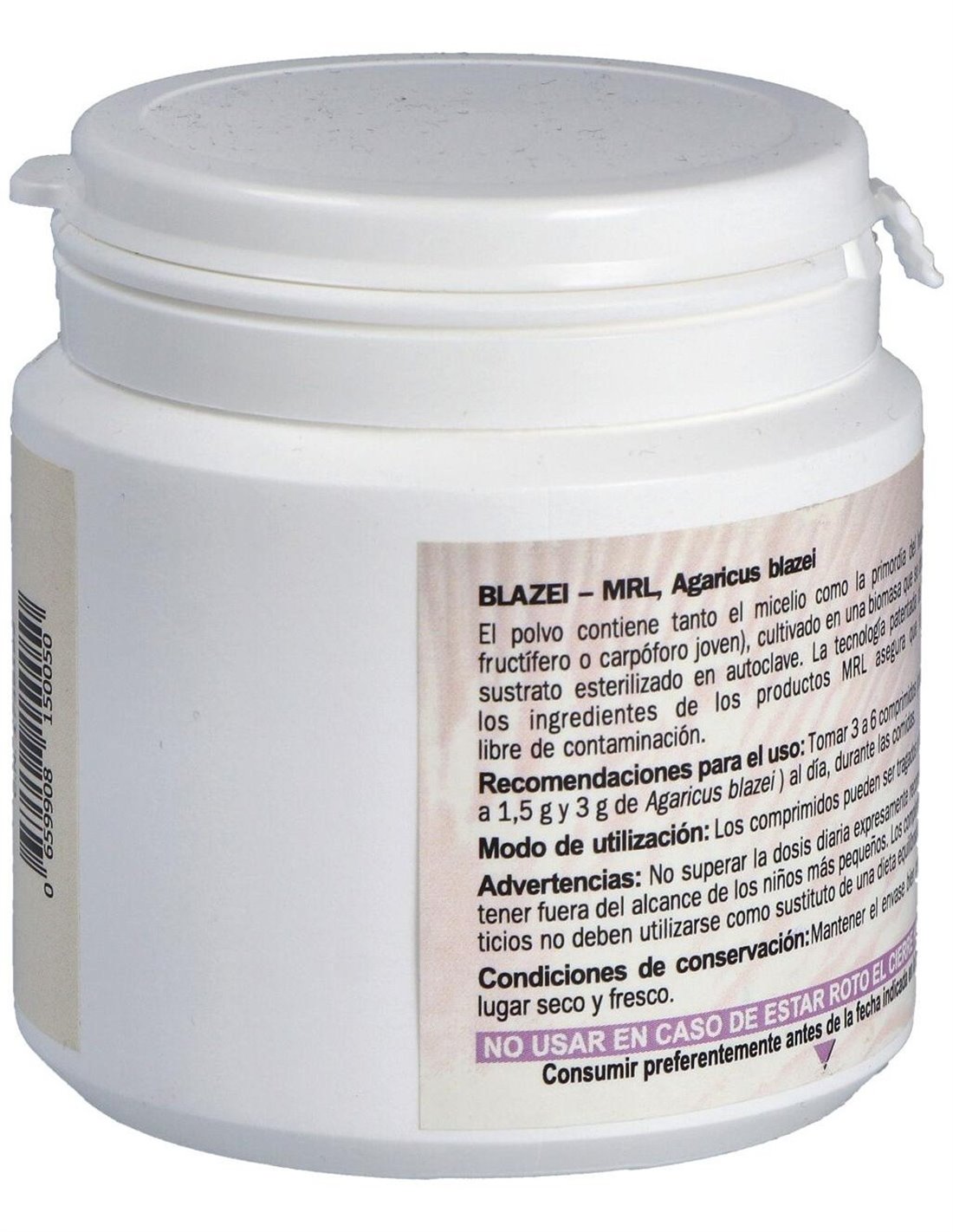 Por 1 comprimido: Biomasa de Agaricus blazei ... 500 mg. Metilcelulosa, Sílice, Estearato magnésico de origen vegetal.