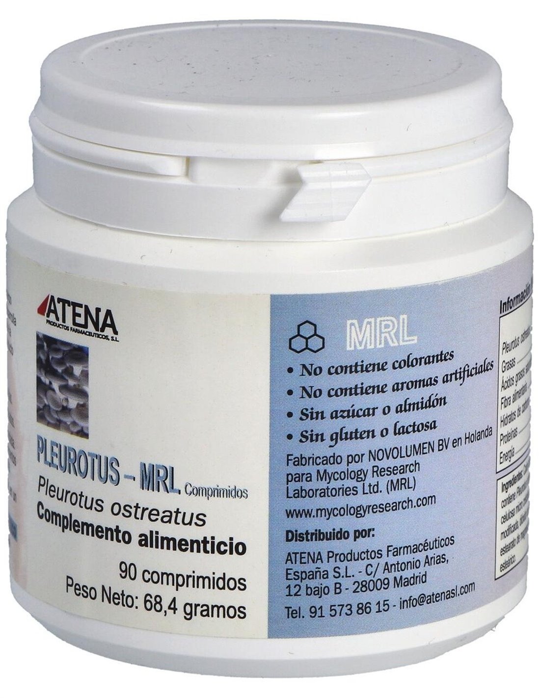 Pleurotus-Mrl 90Comp. de ATENA es un suplemento natural diseñado para apoyar tu bienestar diario. Formulado con extracto de Pleurotus, conocido por sus propiedades antioxidantes y su aporte en nutrientes esenciales, ayuda a fortalecer el sistema inmunológico y mejorar la vitalidad. Cada cápsula ofrece una dosis concentrada para facilitar su consumo y maximizar sus beneficios. Ideal para quienes buscan un complemento natural que contribuya a mantener un estilo de vida saludable. Confía en ATENA para cuidar de ti con calidad y eficacia.