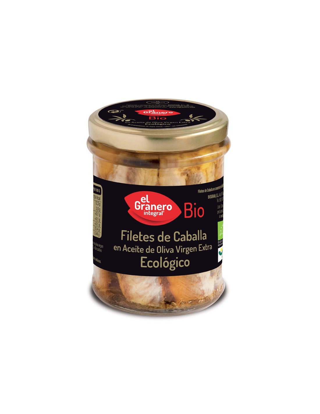 Ingredientes:Caballa, aceite de oliva virgen extra no hidrogenado* y sal. (*)=De cultivo ecológico.Valor nutricional por 100 gramos:
