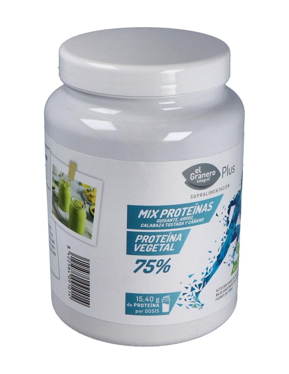 Proteína de guisante* 53,3%, (Pisum sativum L.), proteína de arroz en polvo* 36,7% (Oryza sativa), proteína de calabaza tostada en polvo* 6,7% (Curcubita pepo) y proteína de cáñamo en polvo* 3,3% (Cannabis sativa).